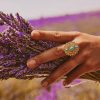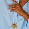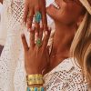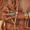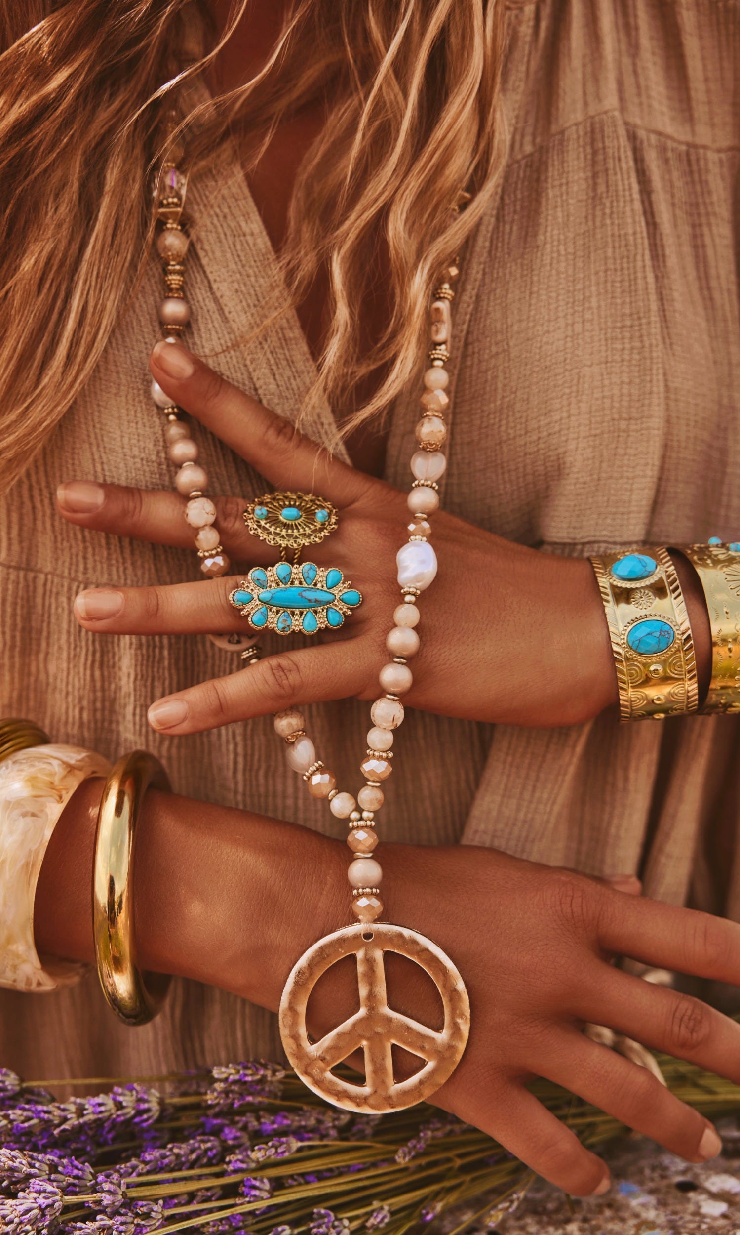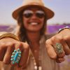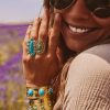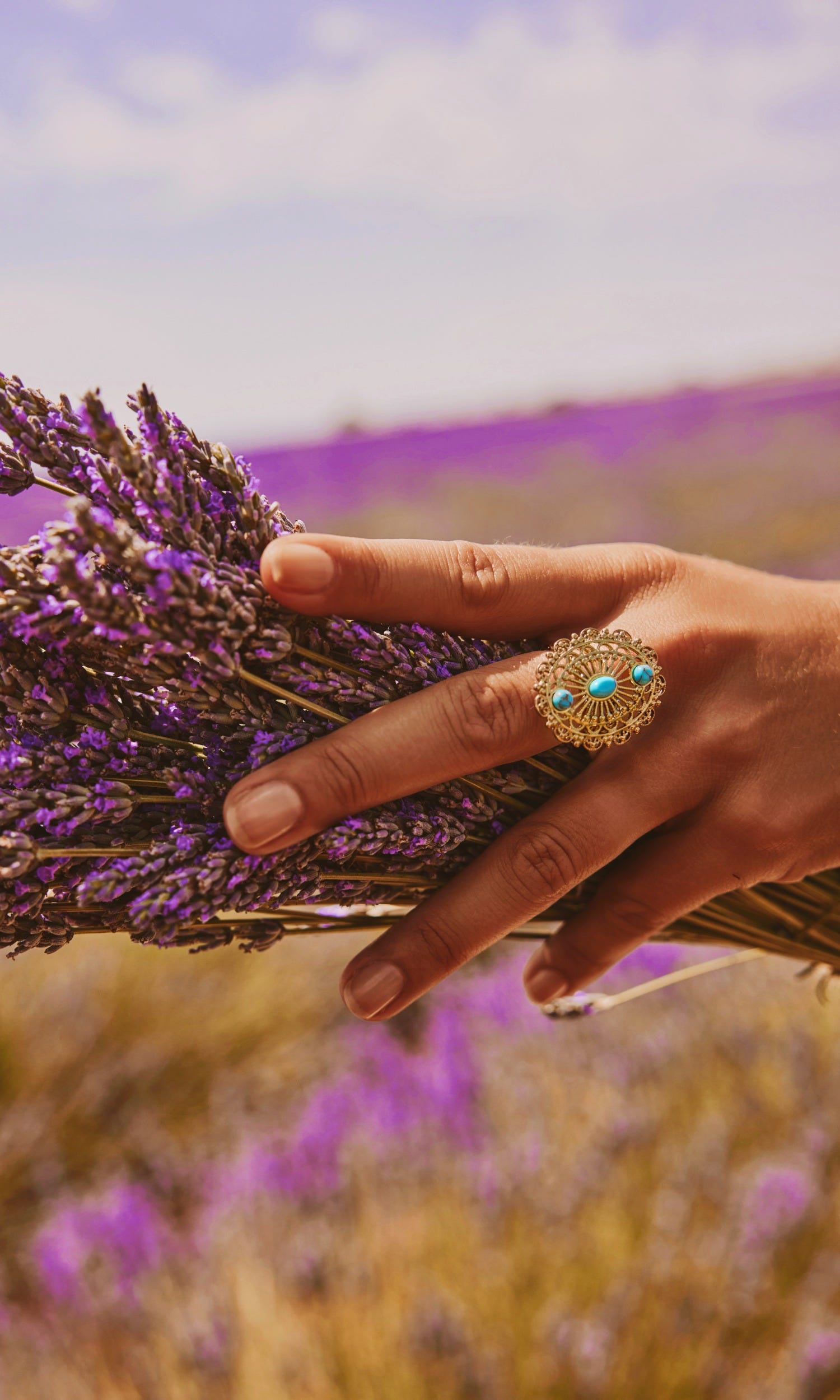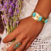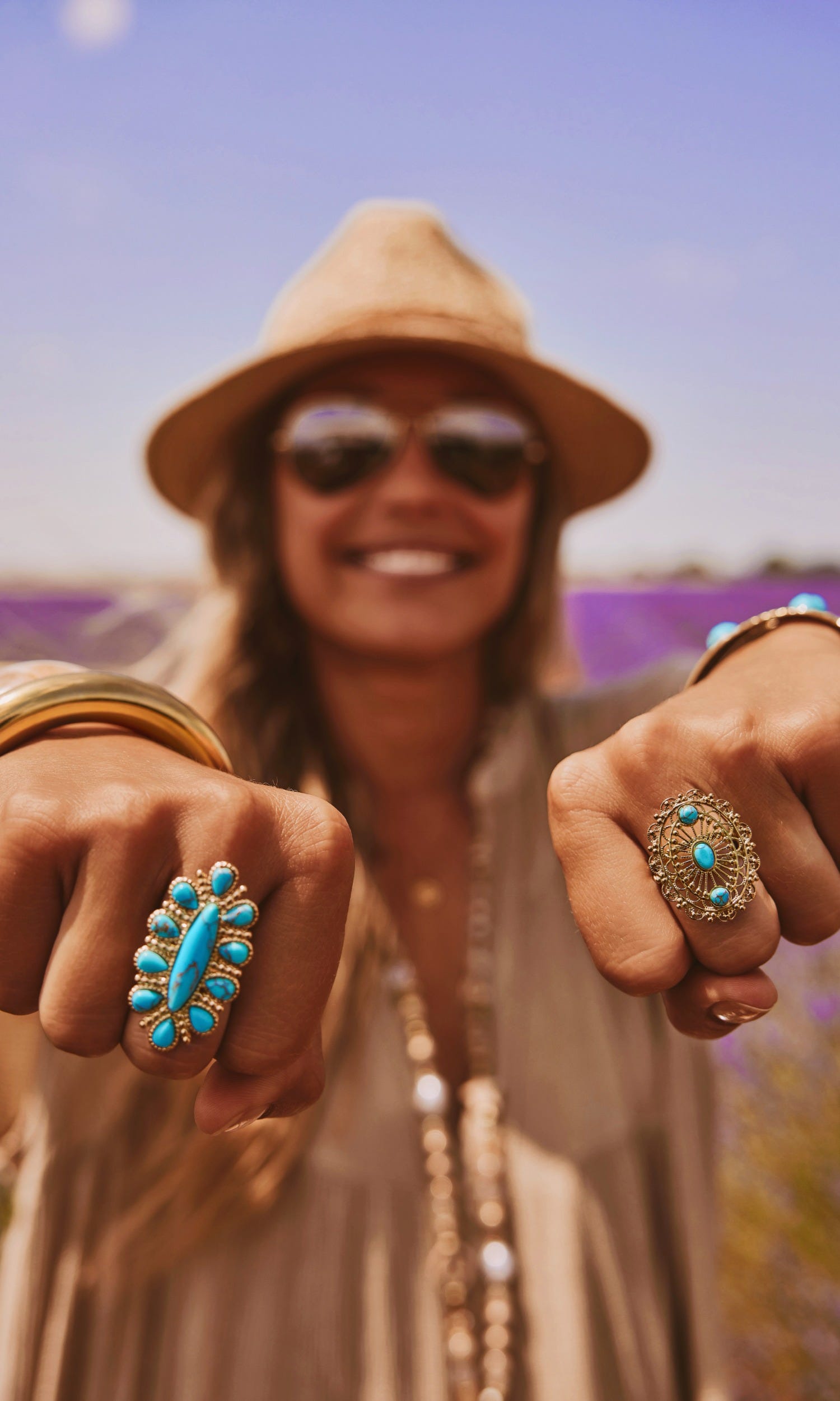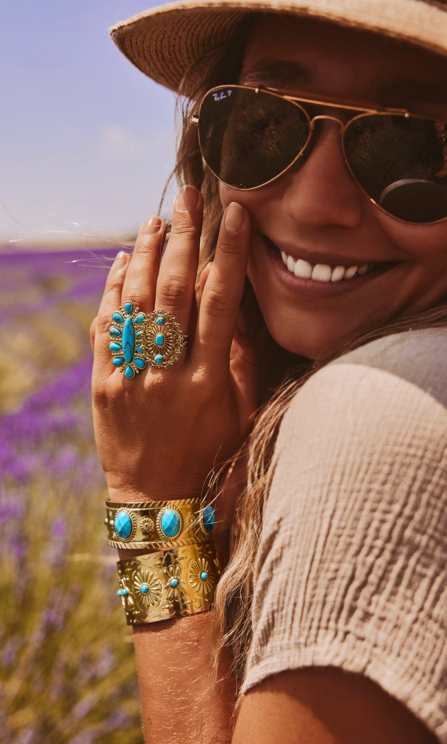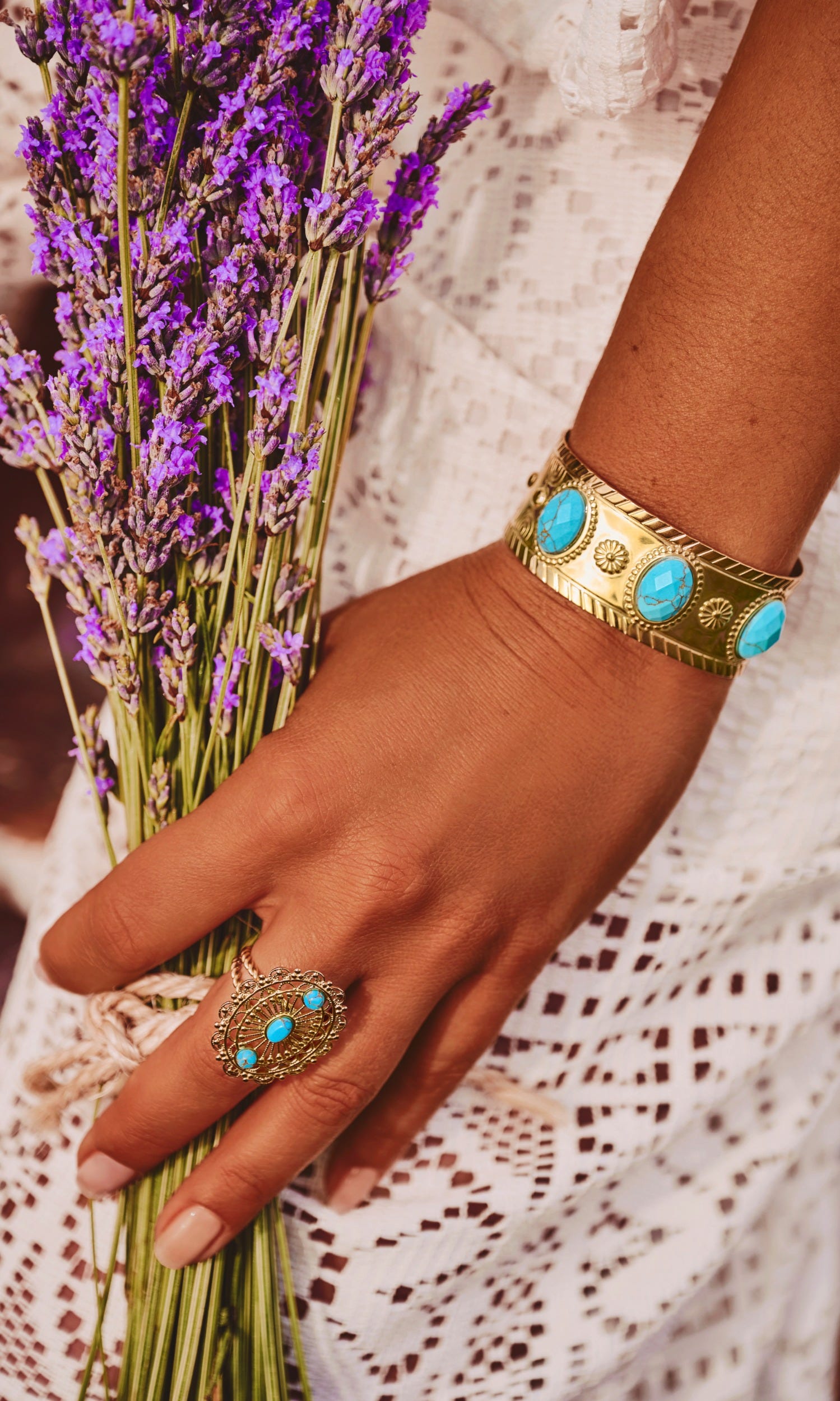 Son design raffiné est mis en valeur par son soleil orné de trois pierres turquoise.