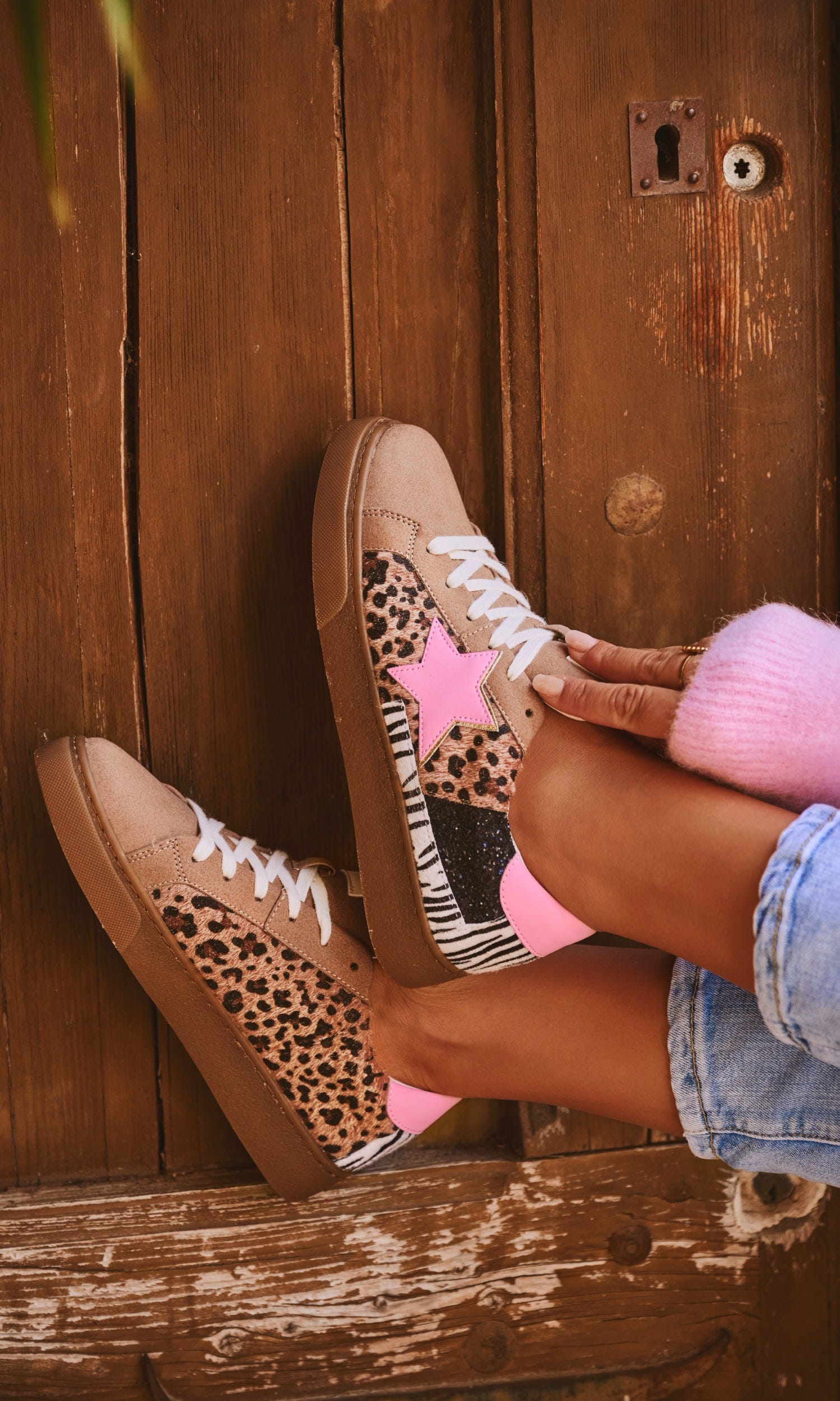 Optez pour le style avec ces baskets basses taupes au motif léopard sur les côtés.Élegamment rehaussées par une étoile rose sur chaque côté, elles allient confort et tendance.La semelle extérieure en gomme assure une bonne adhérence, tandis que l'intérieur en tissu garantit un agréable maintien.Semelle intérieure amovible pour un ajustement parfait.