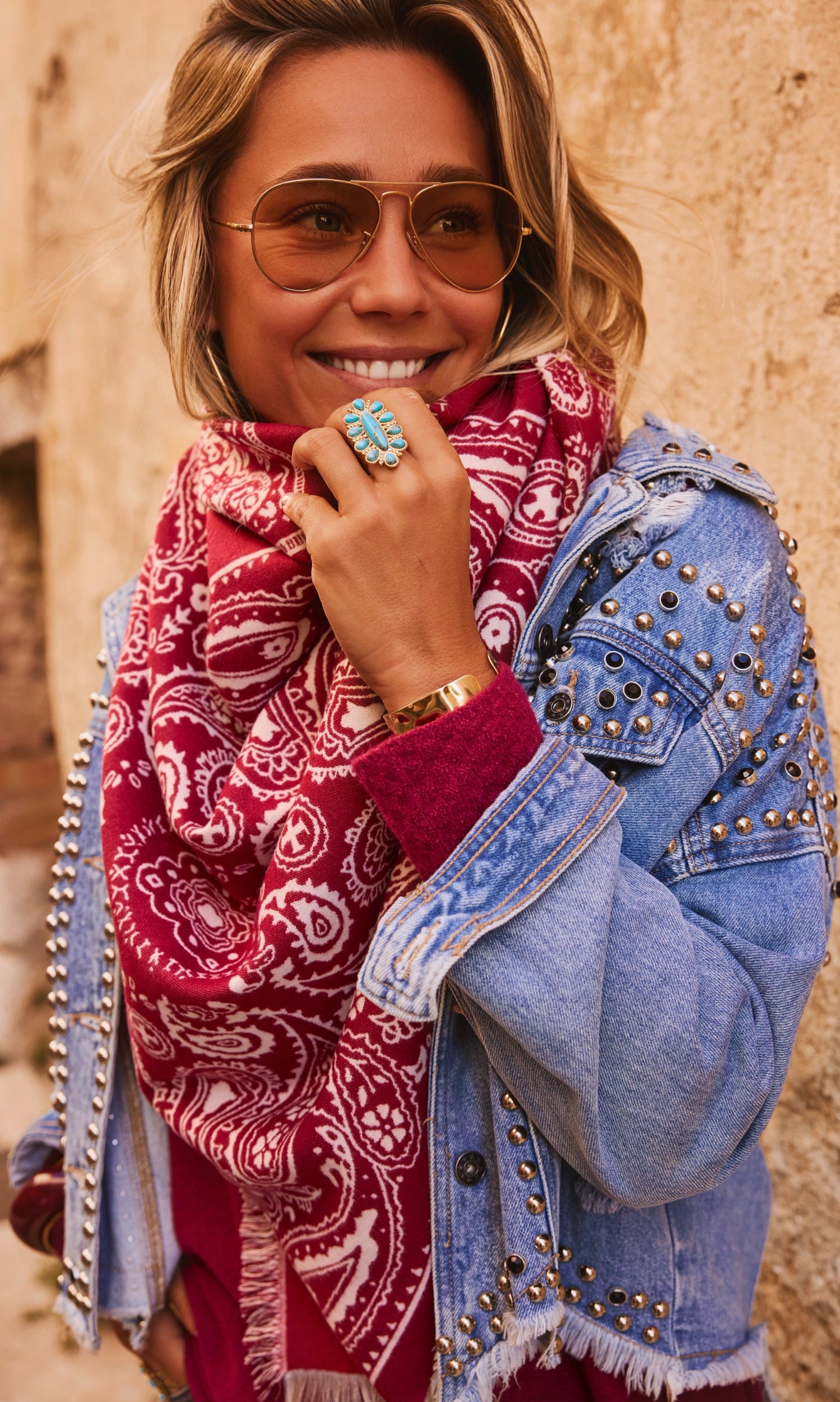 Son motif bandana élégant apporte une touche de style, tandis que les fines franges discrètes au bord ajoutent une note de délicatesse.