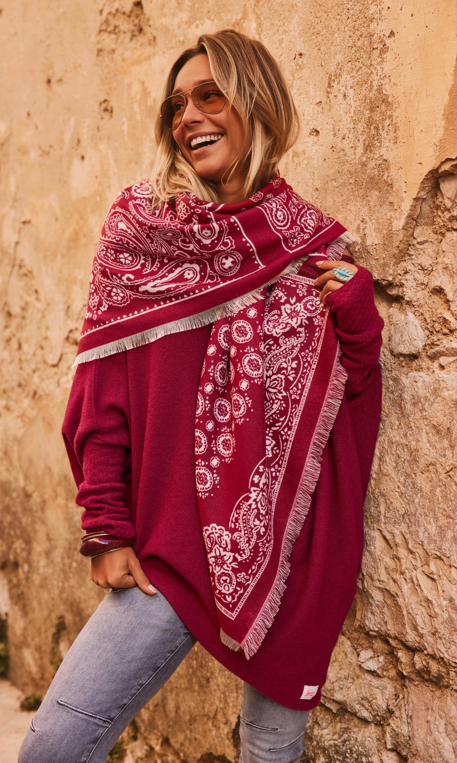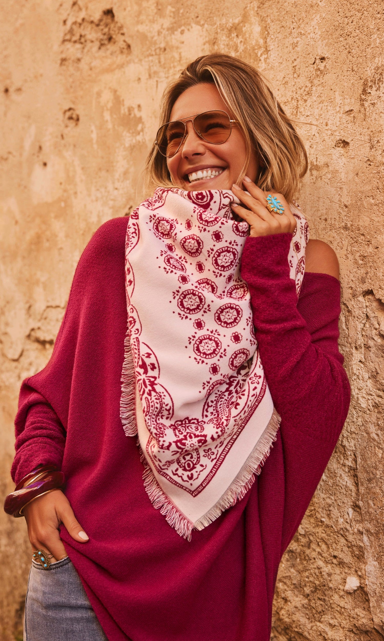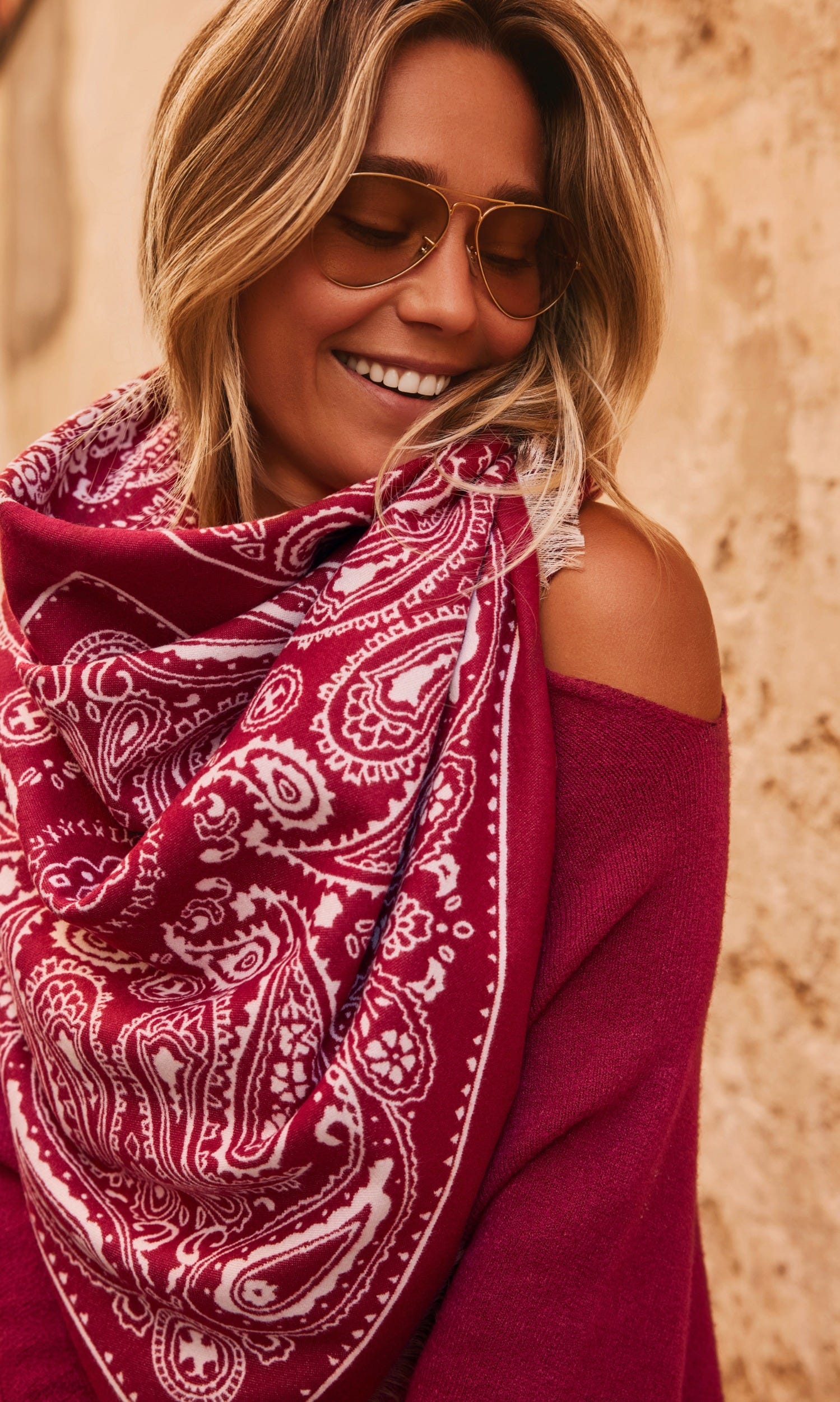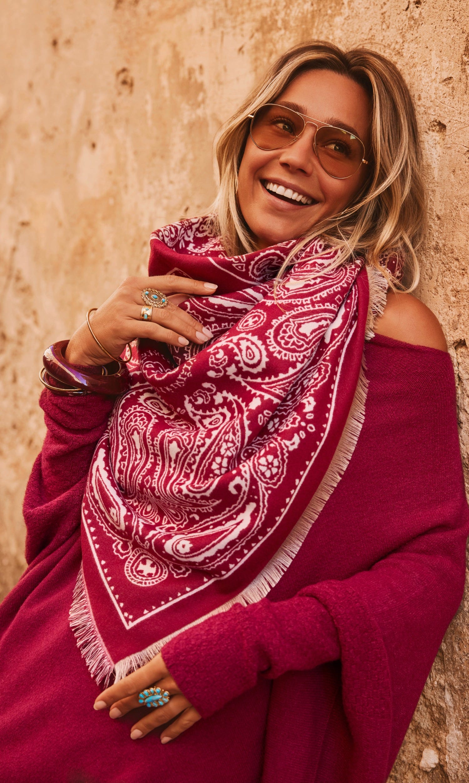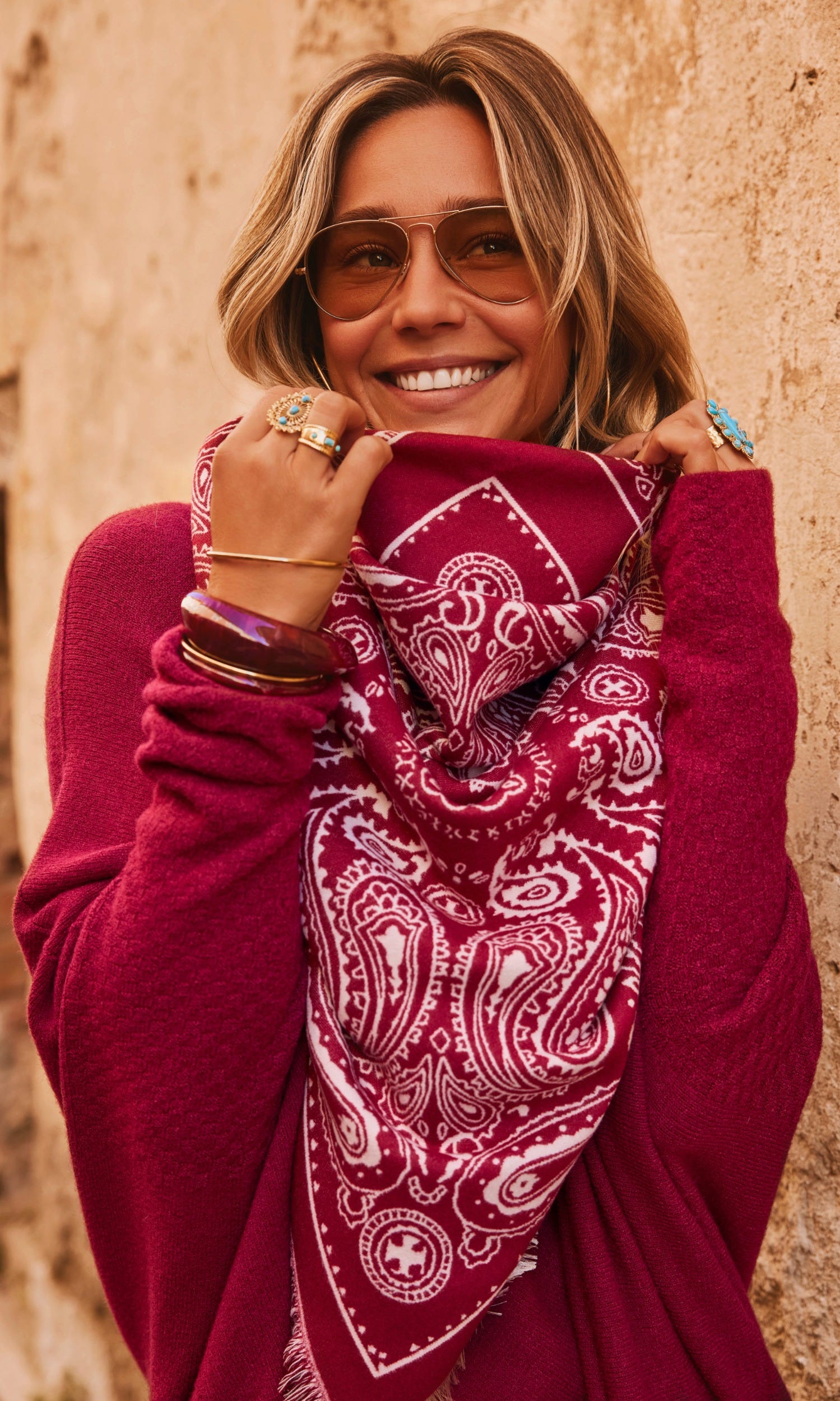 Découvrez notre grande écharpe carrée bordeaux, ultra douce et enveloppante.