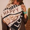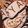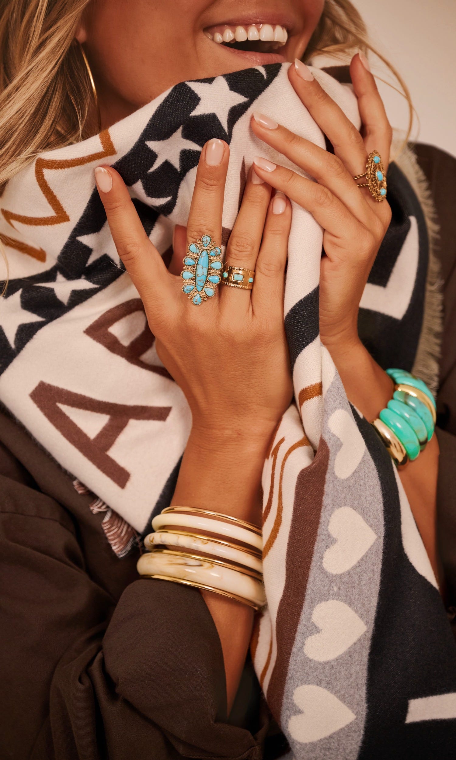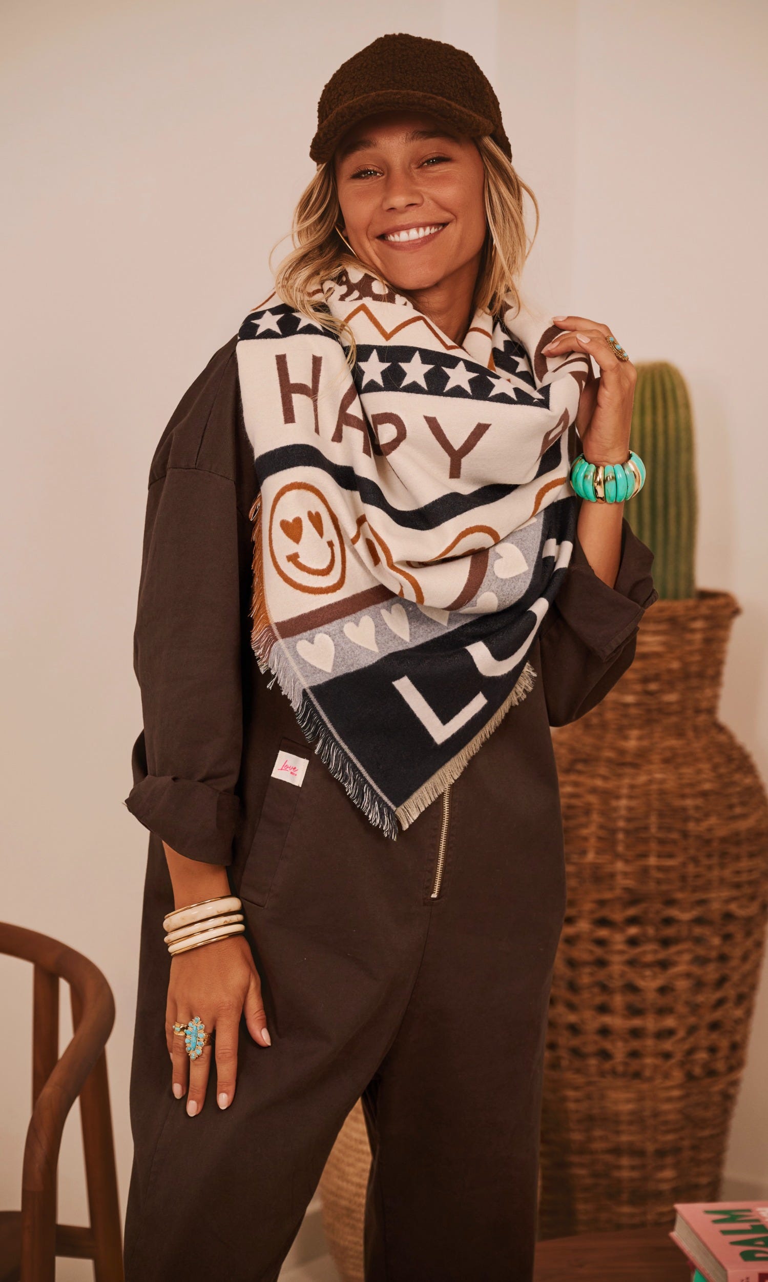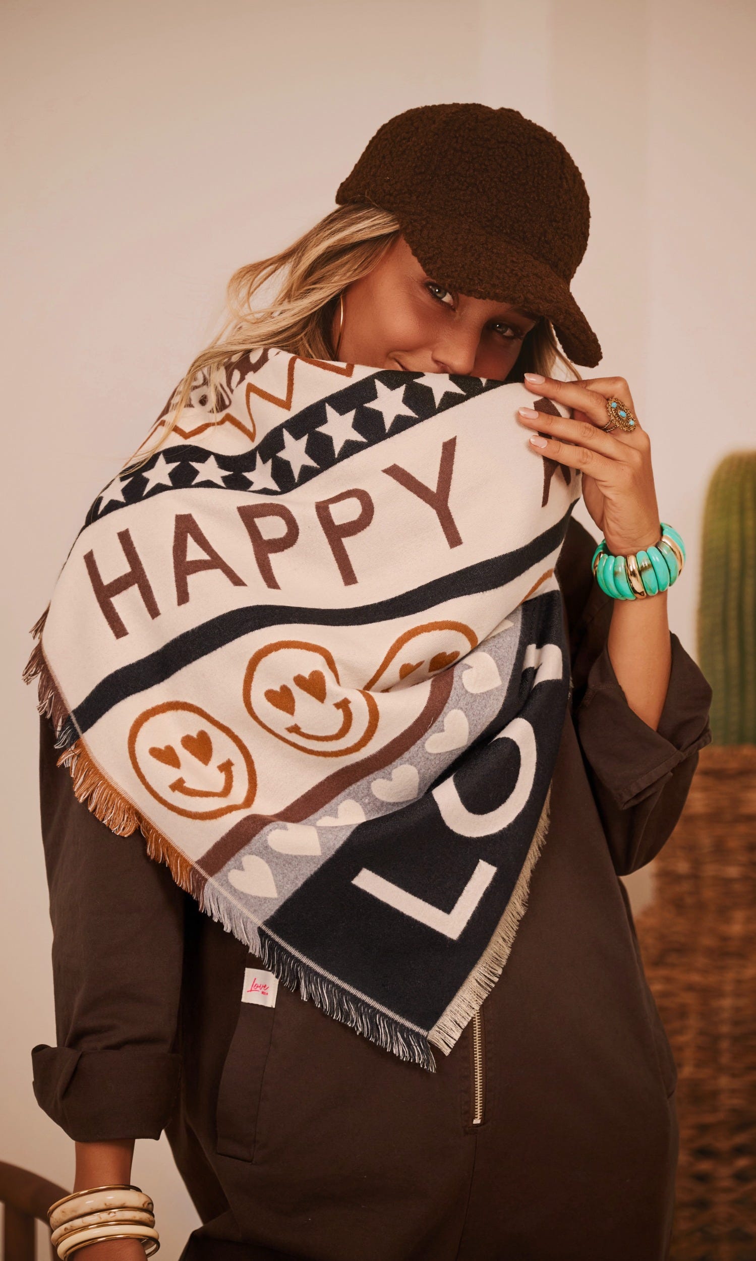 Ses teintes noir, beige, gris et camel accueillent divers motifs : smileys, étoiles et cœurs.