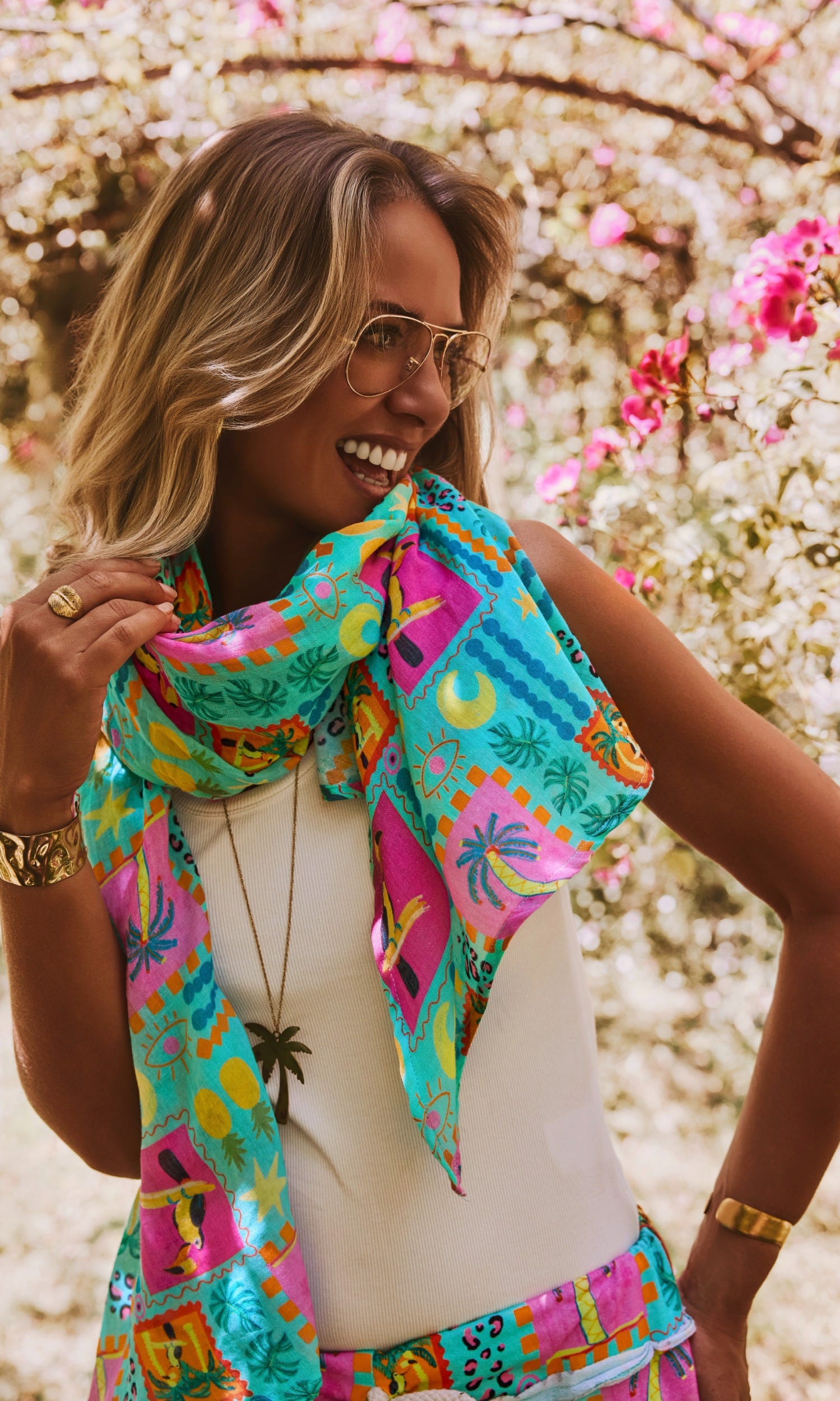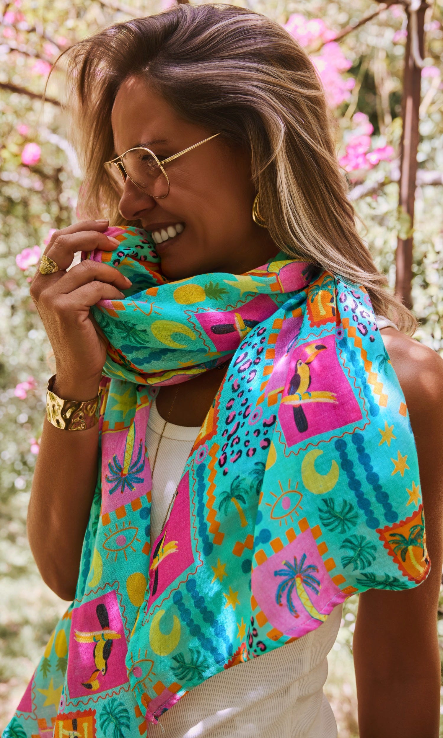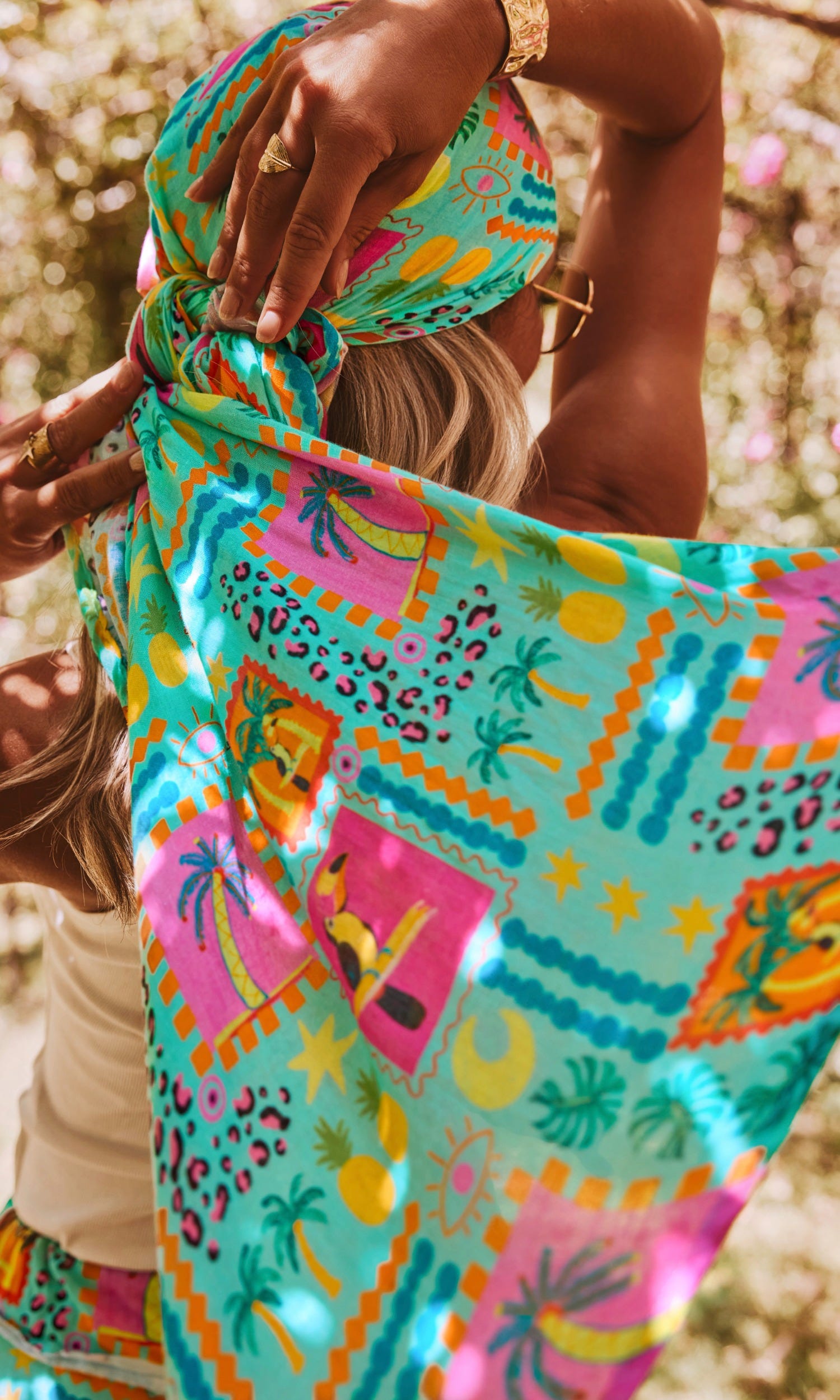 Découvrez notre foulard turquoise au motif "Island Forever", idéal pour ajouter une touche élégante à vos tenues.