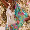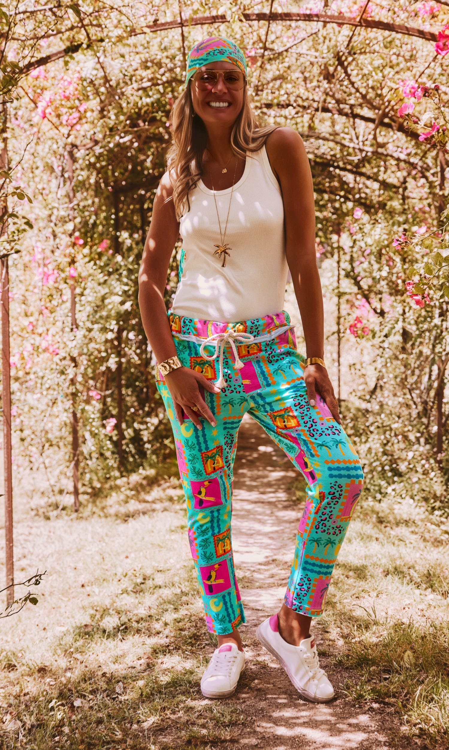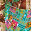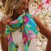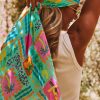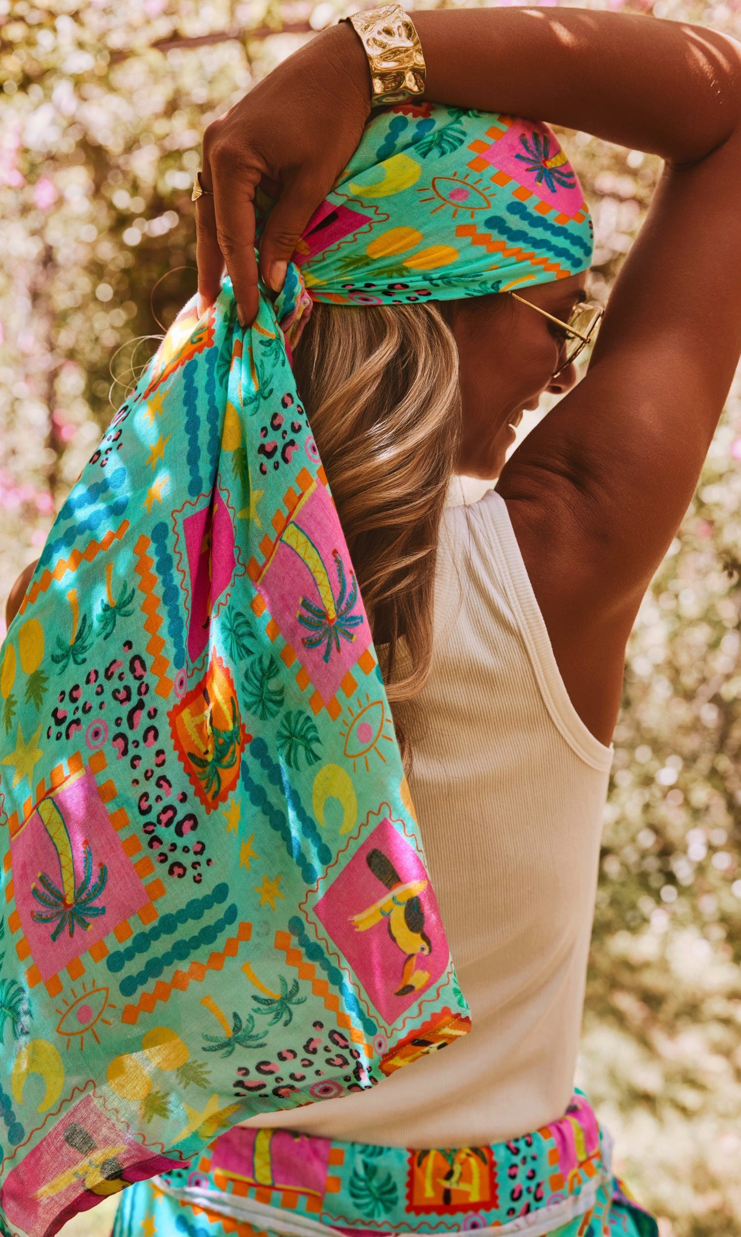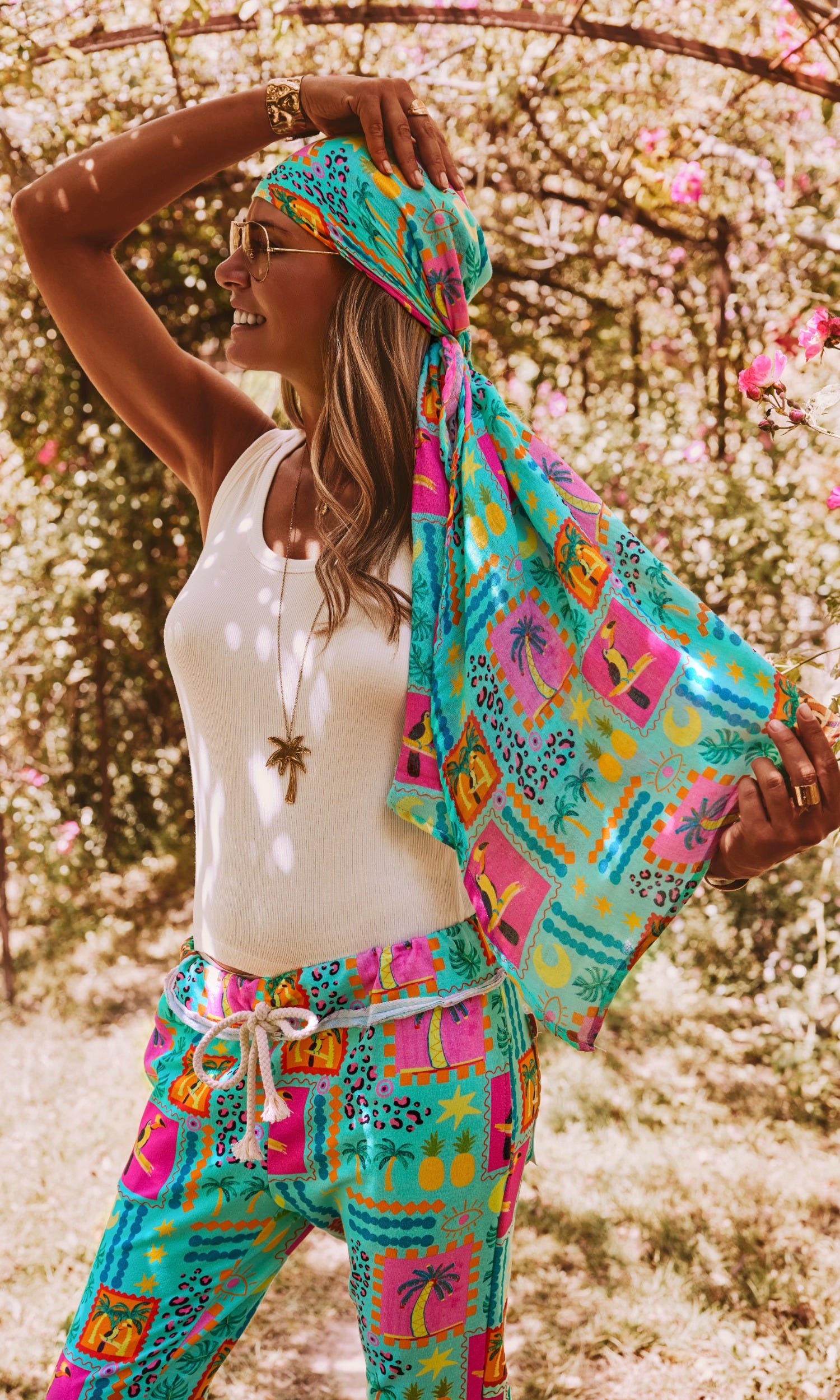 Découvrez notre foulard turquoise au motif "Island Forever", idéal pour ajouter une touche élégante à vos tenues.