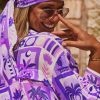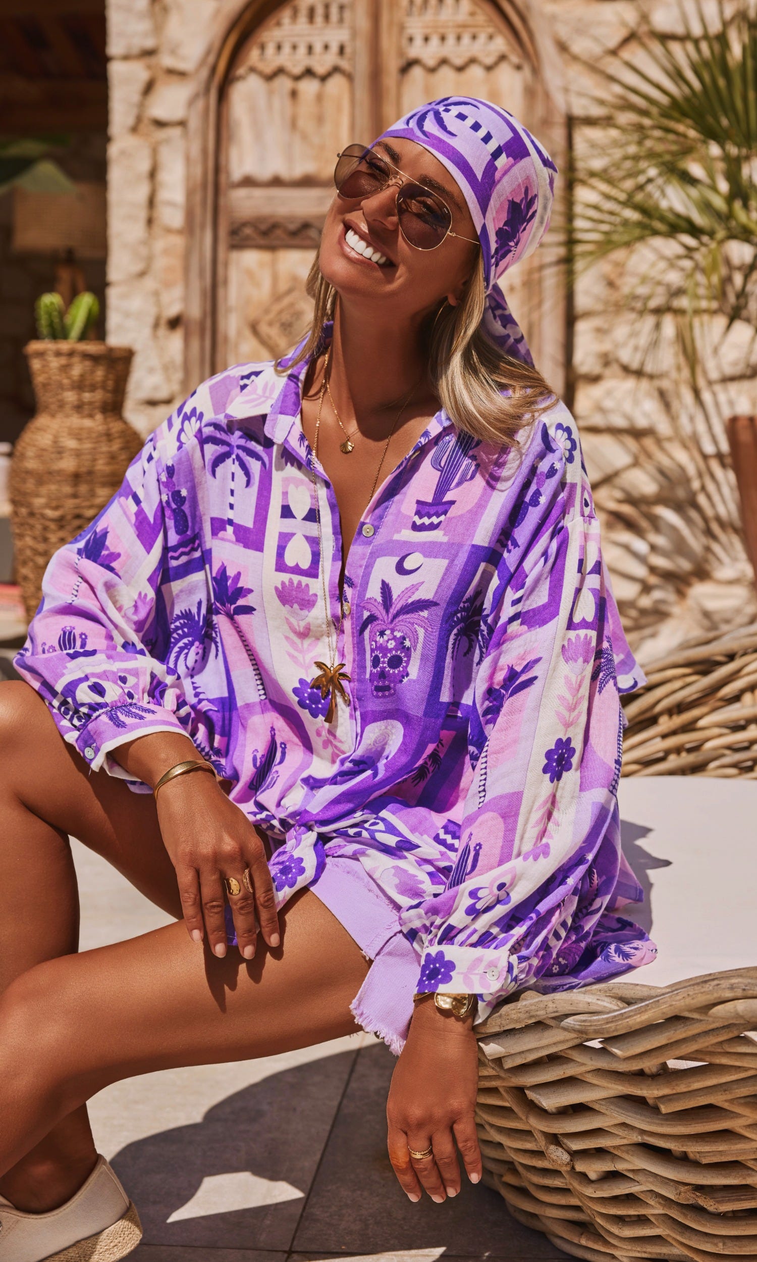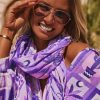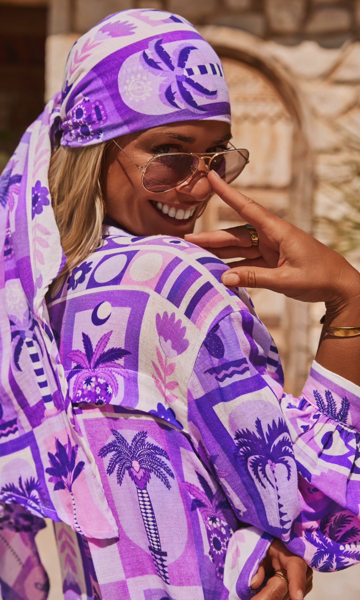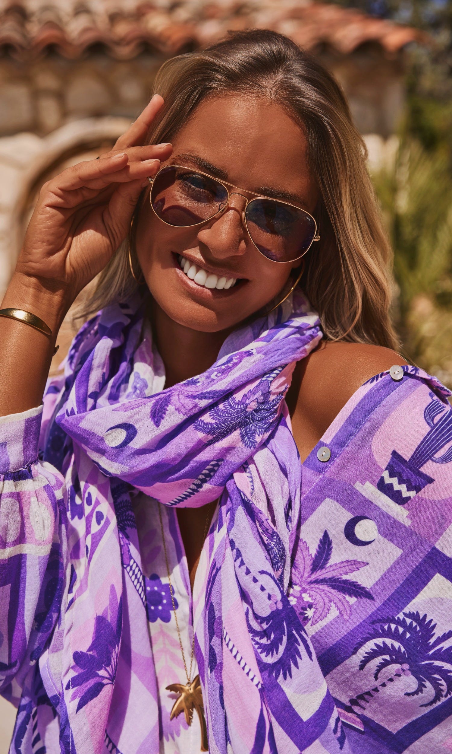 Découvrez notre foulard violet colorido, parfait pour ajouter une touche de féminité à votre tenue.