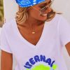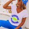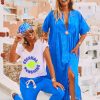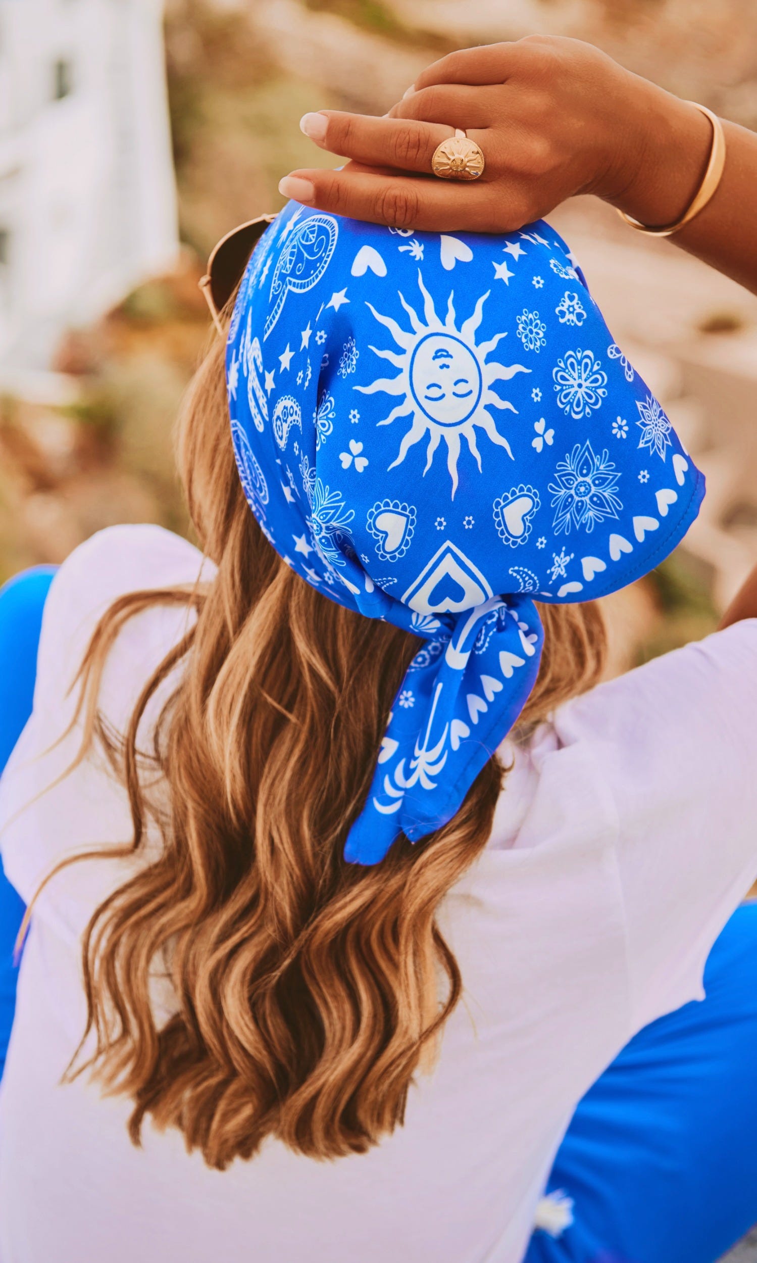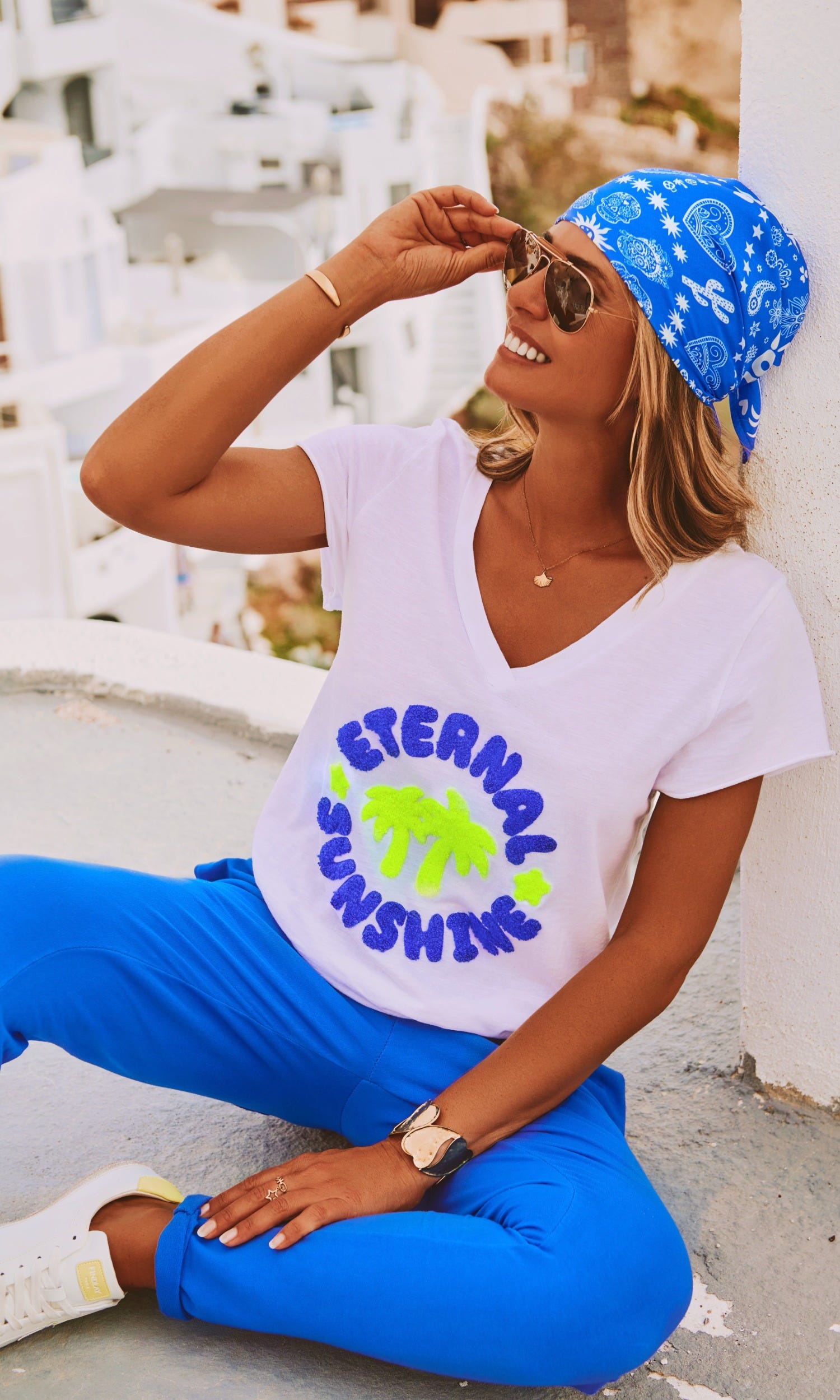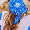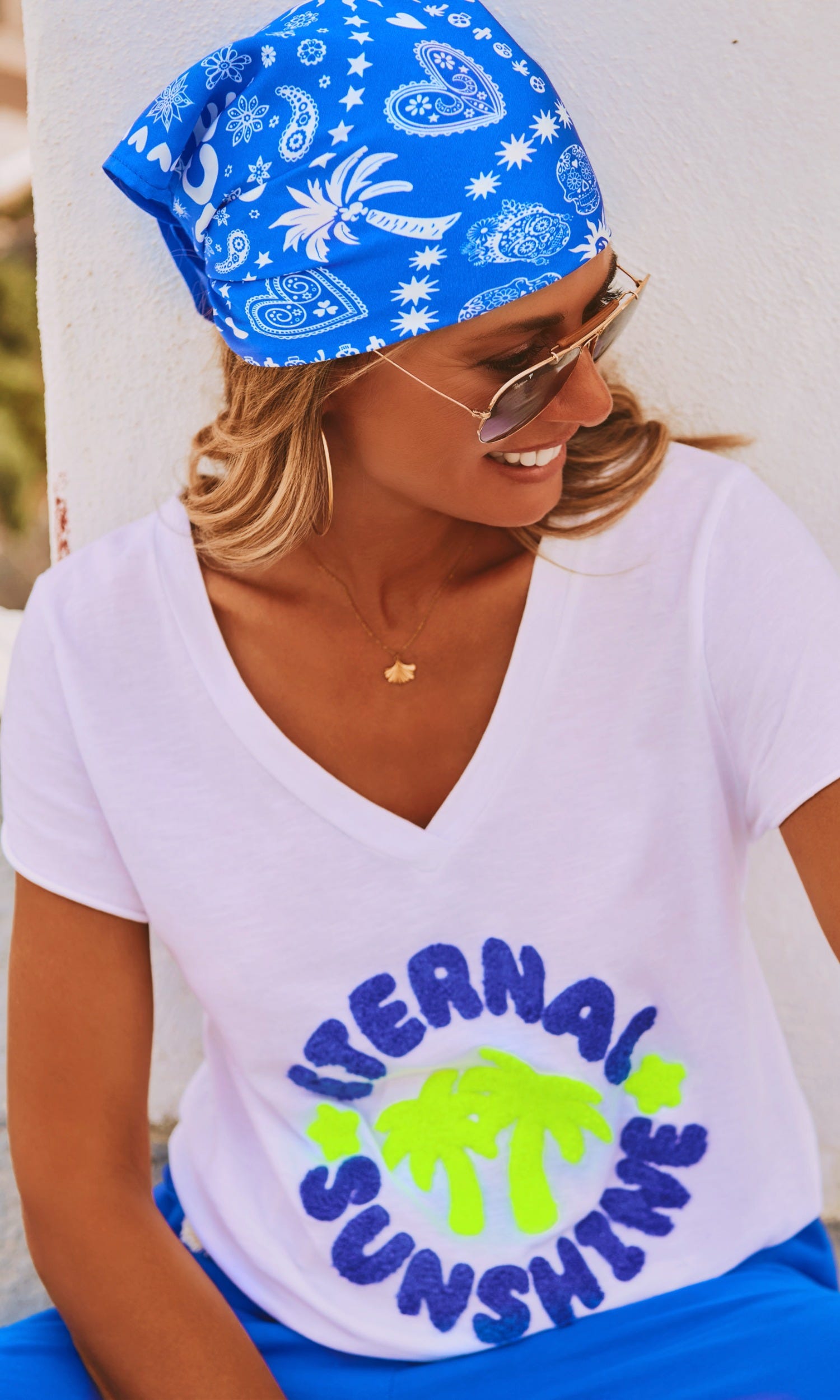 Découvrez notre foulard bleu électrique carré en tissu satiné, orné d'un motif "Peace and Love" en total look.