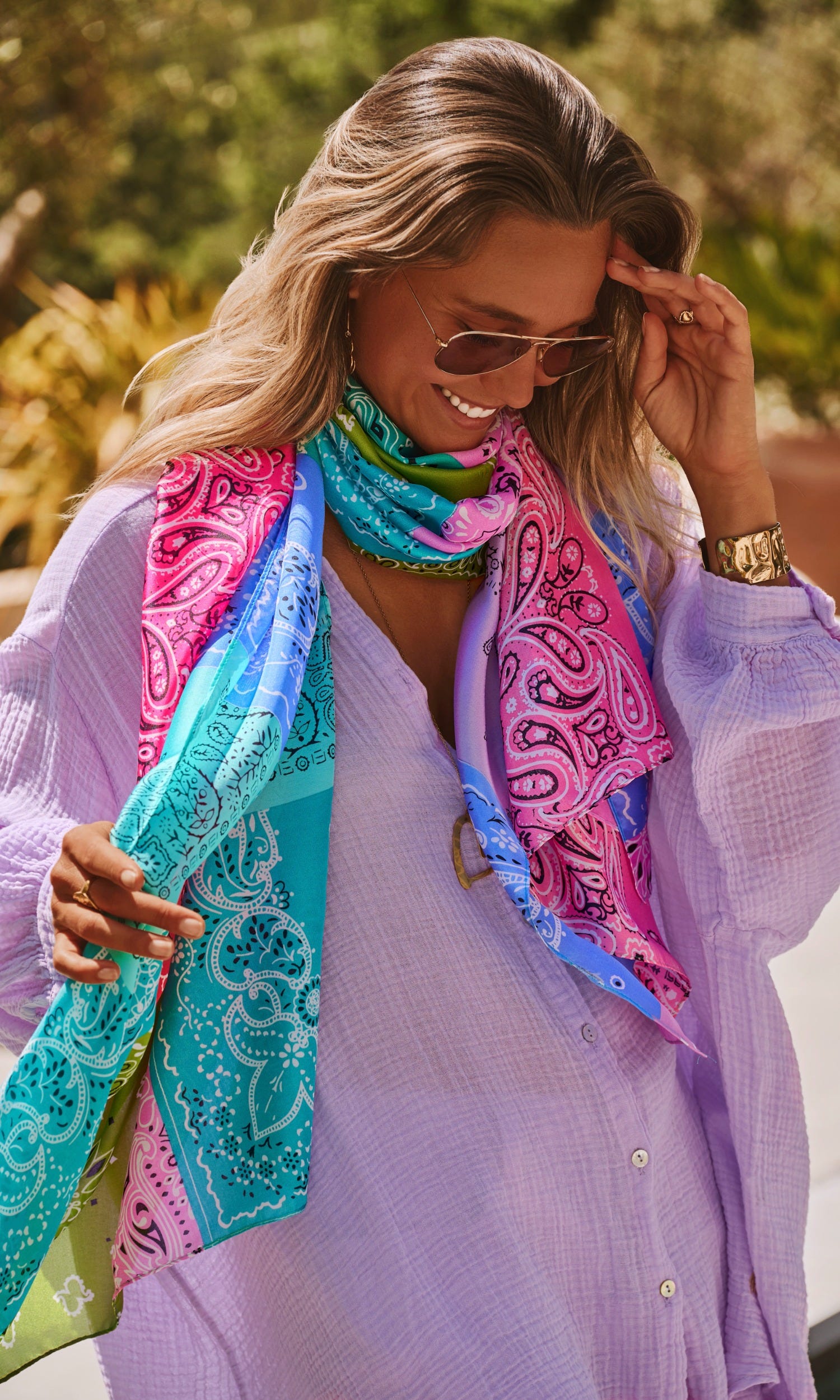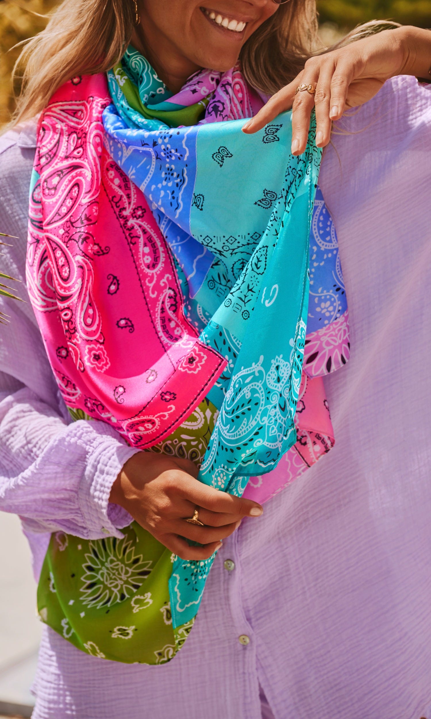 Découvrez notre grand foulard XXL en forme rectangulaire, orné d'un motif bandana aux couleurs vives.