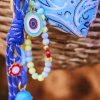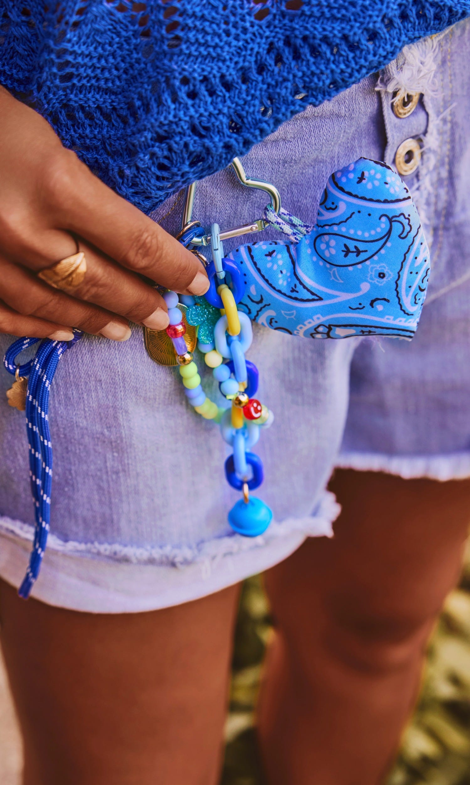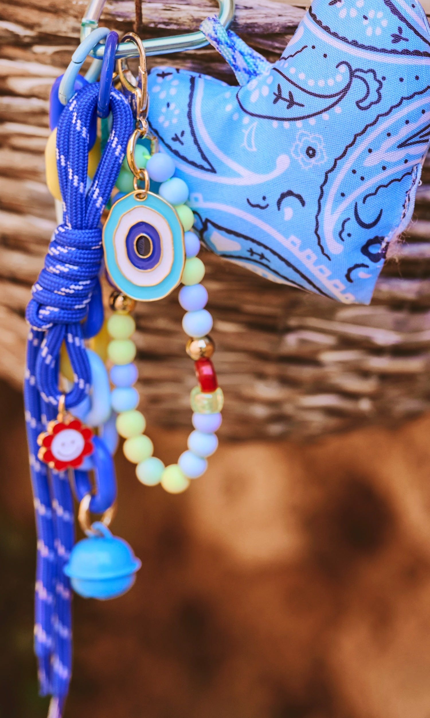 Équipé d'un mousqueton pratique, il arbore un cœur bleu en bandana orné de perles délicates dans les tons bleu.