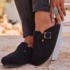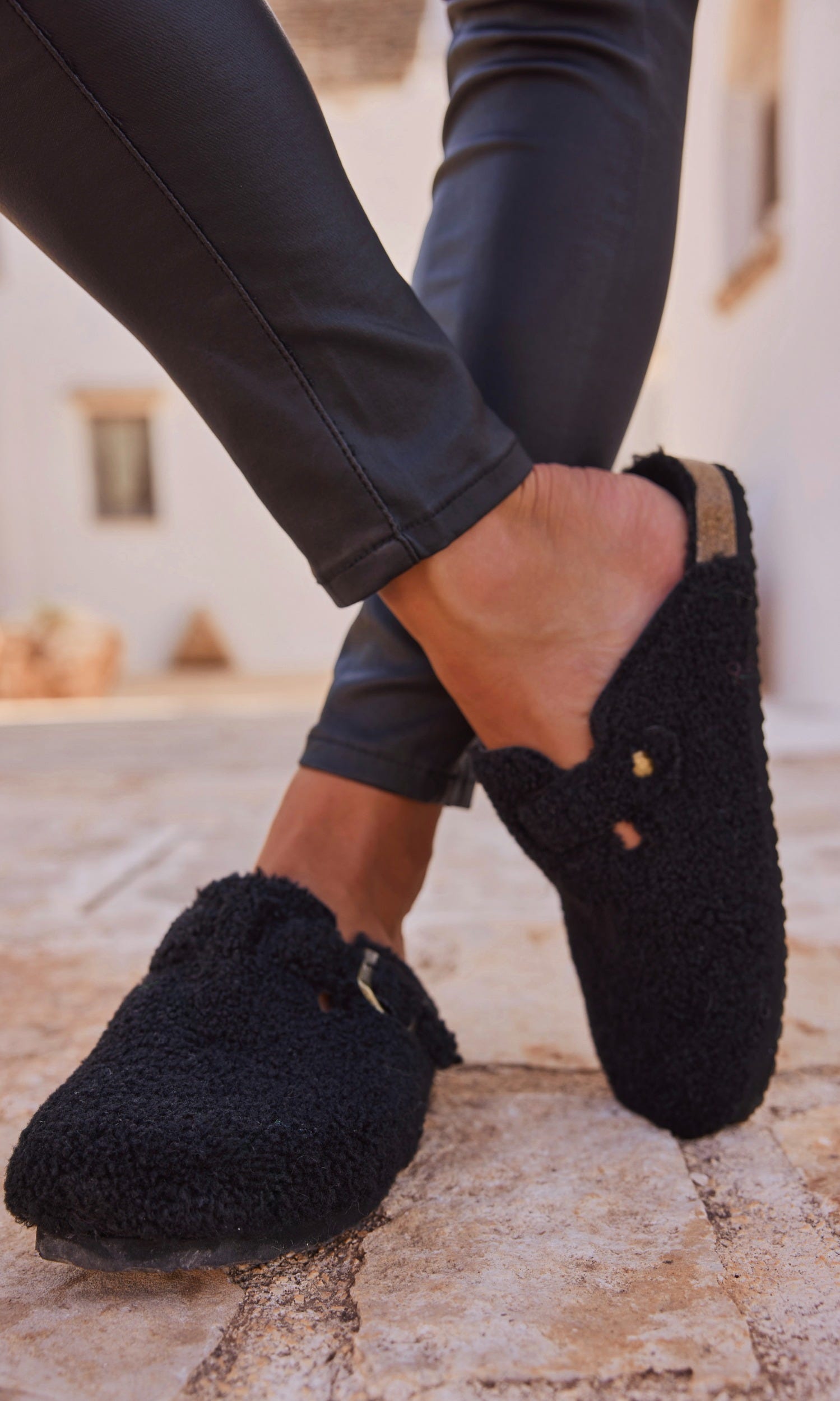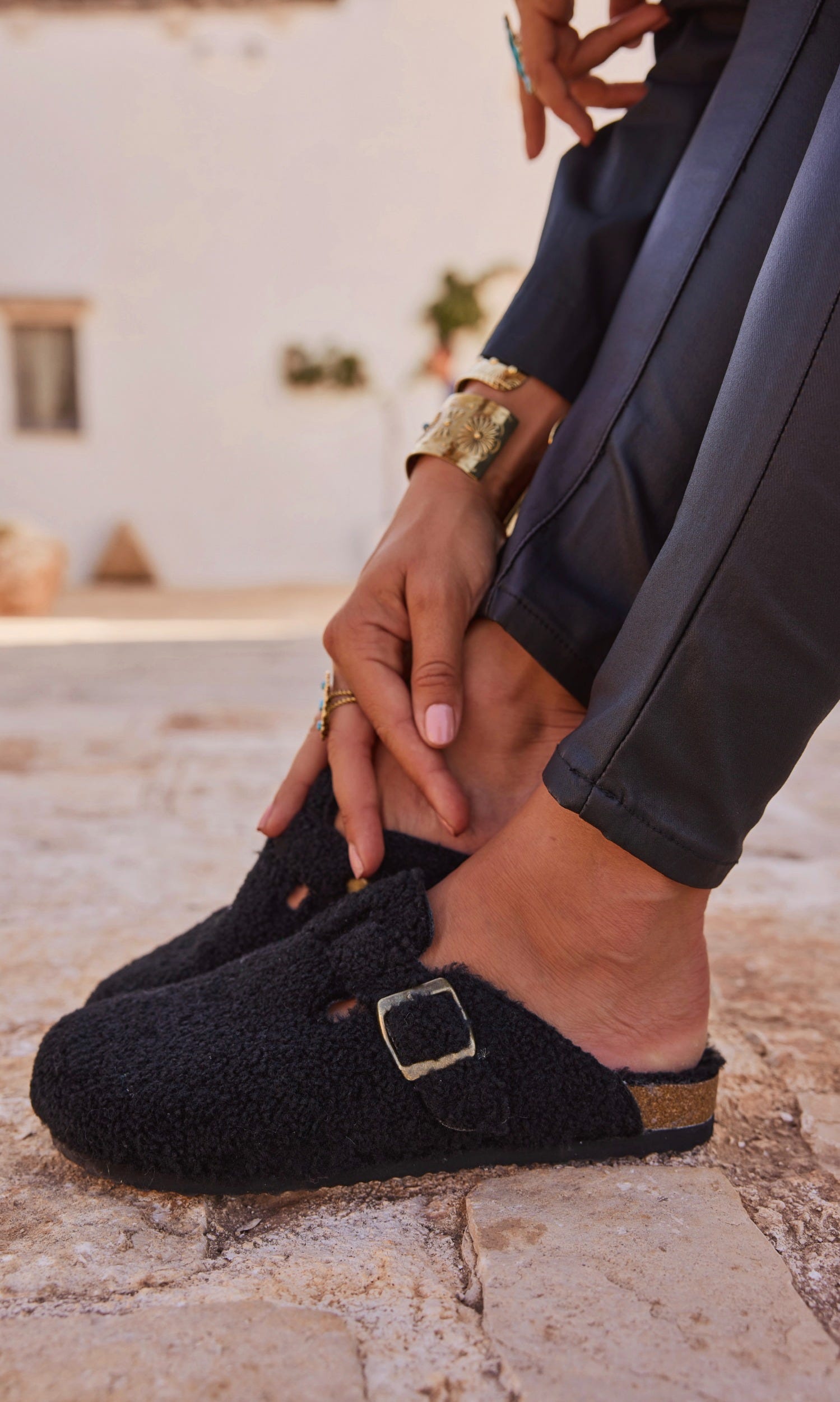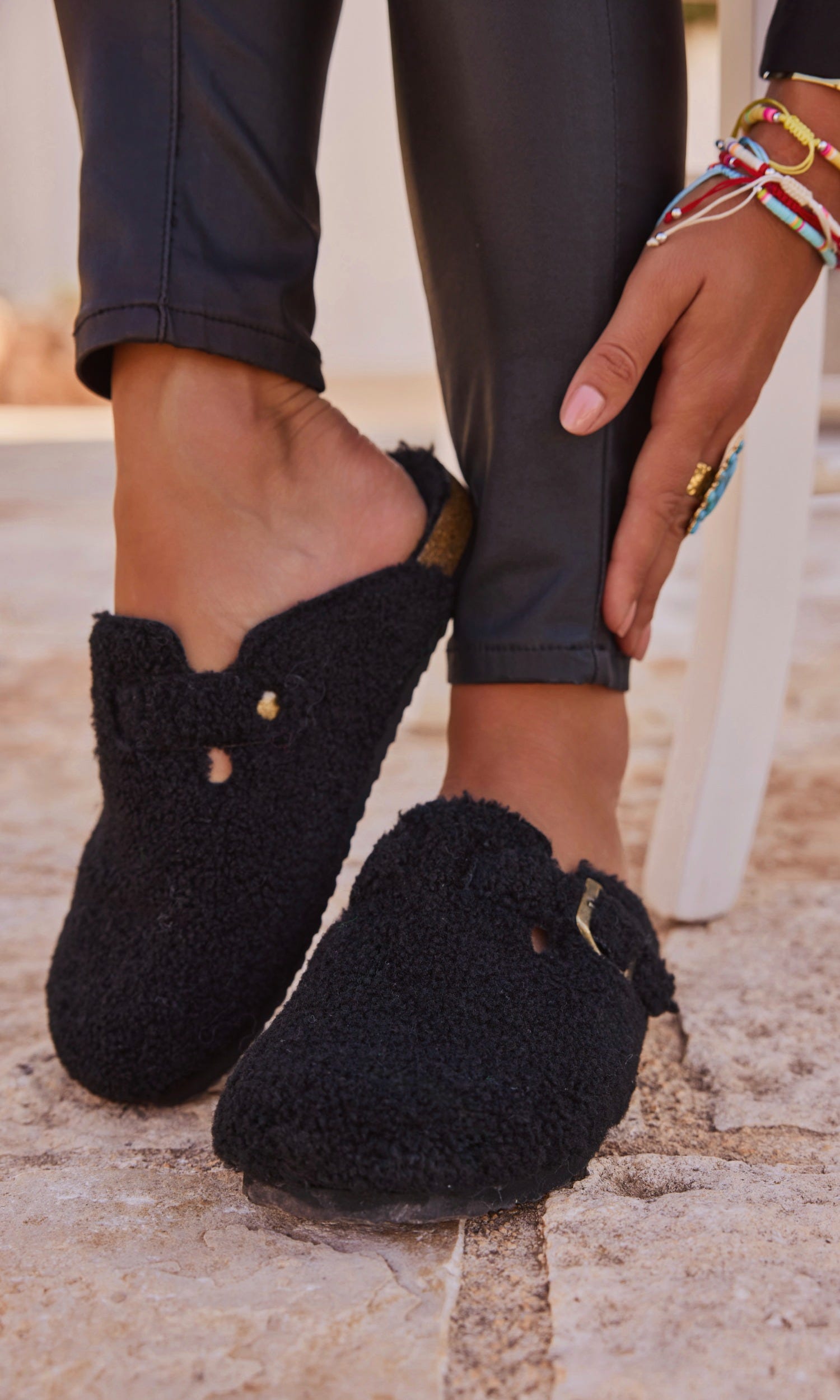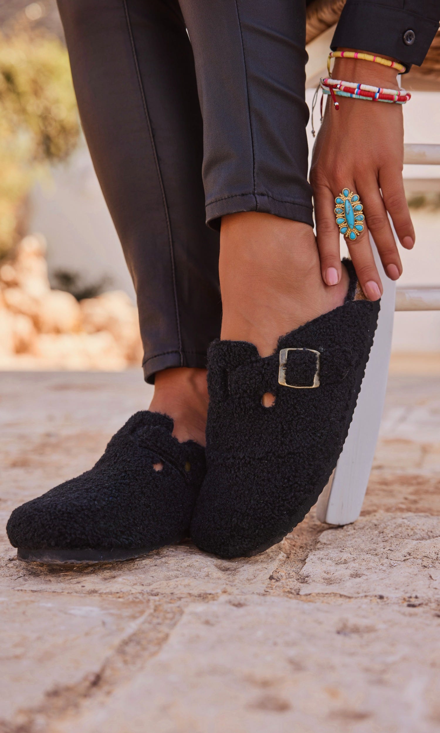La boucle ardillon ajustable sur le devant permet un maintien personnalisé, tandis que la semelle intérieure effet moumoute garantit un confort chaleureux tout au long de la journée.