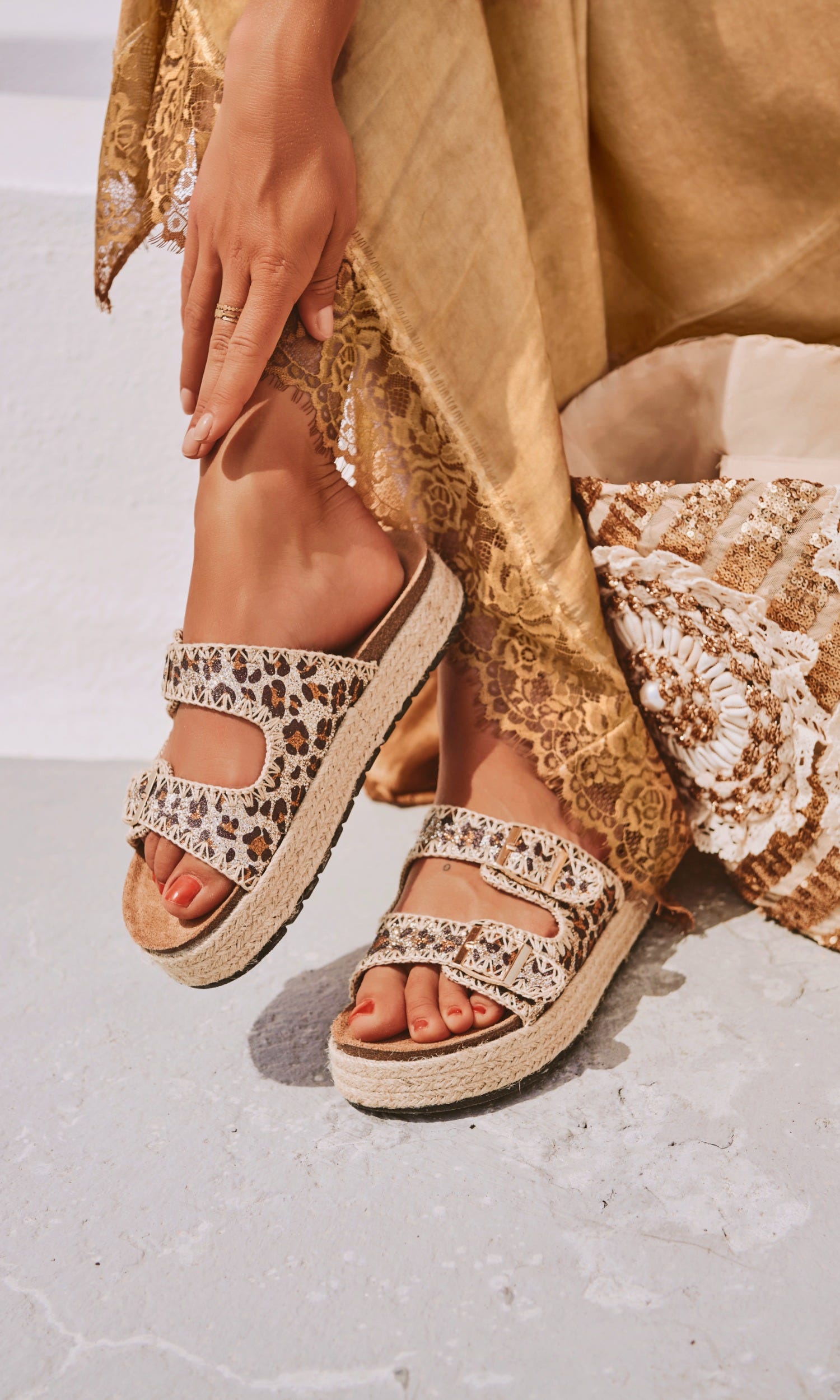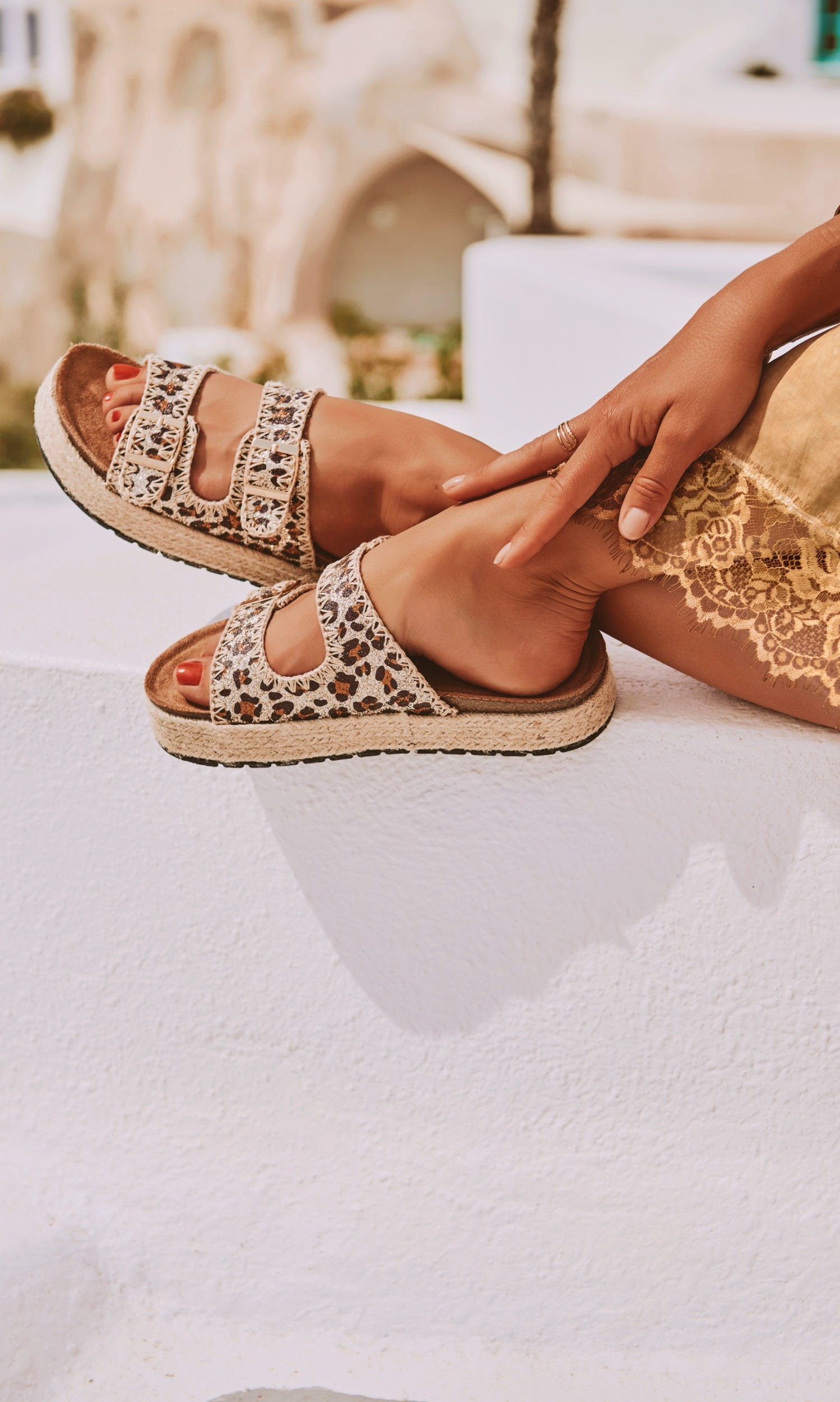 Optez pour l'élégance scintillante avec ces sandales à boucles camel léopard glitter.