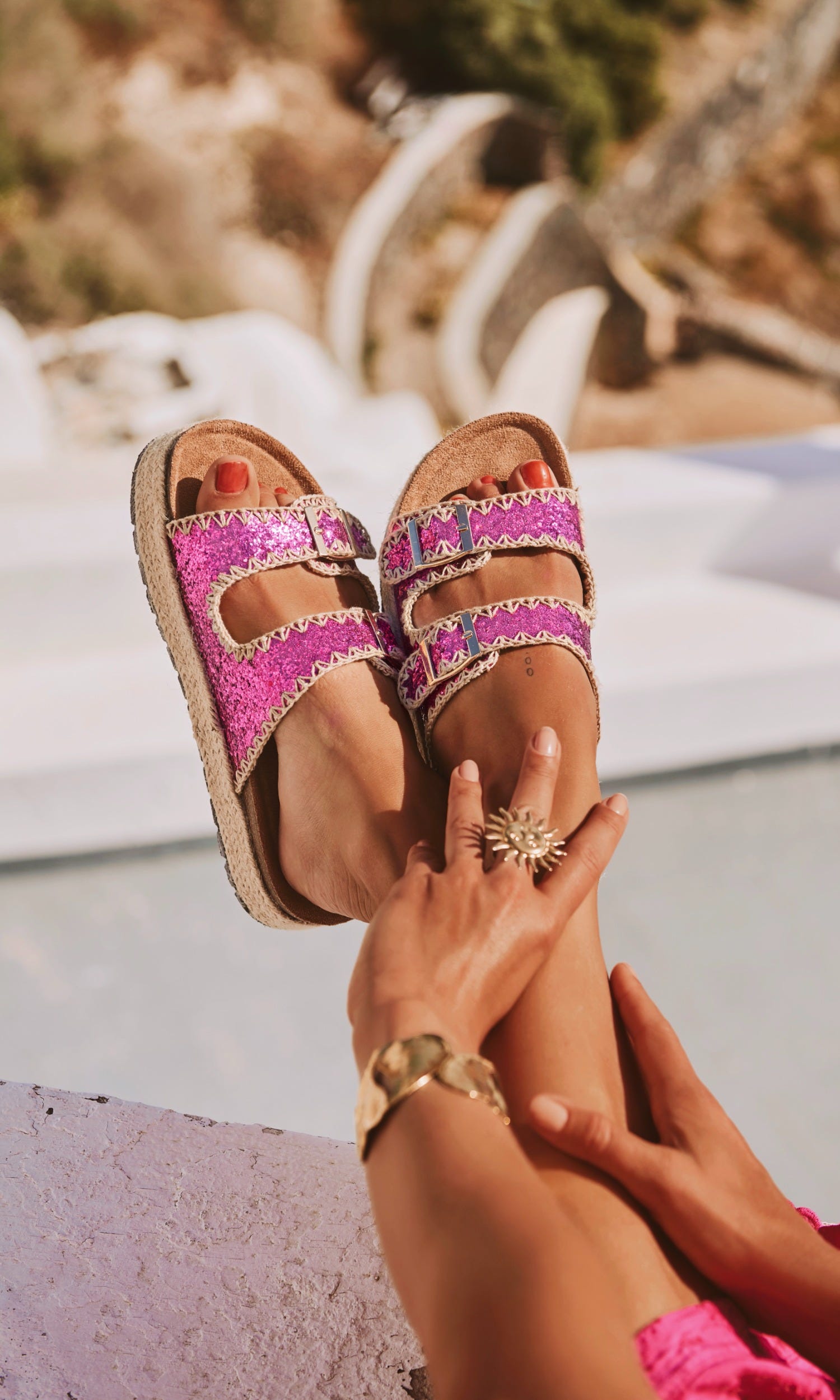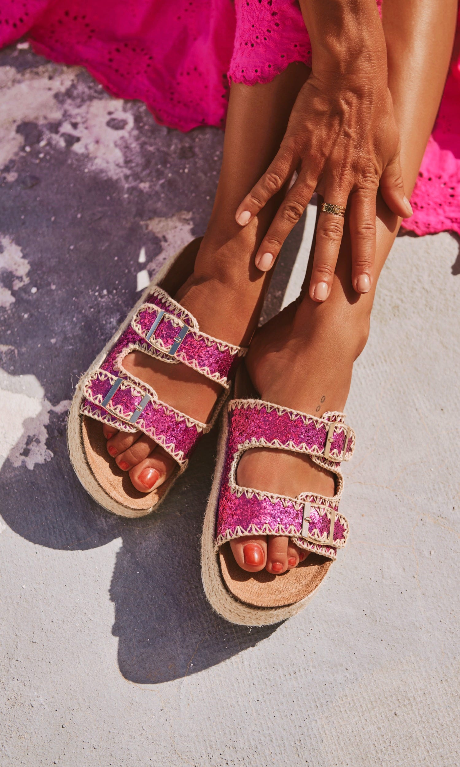 Découvrez nos sandales à boucles rose fuchsia glitter, un incontournable pour un look chic et tendance.