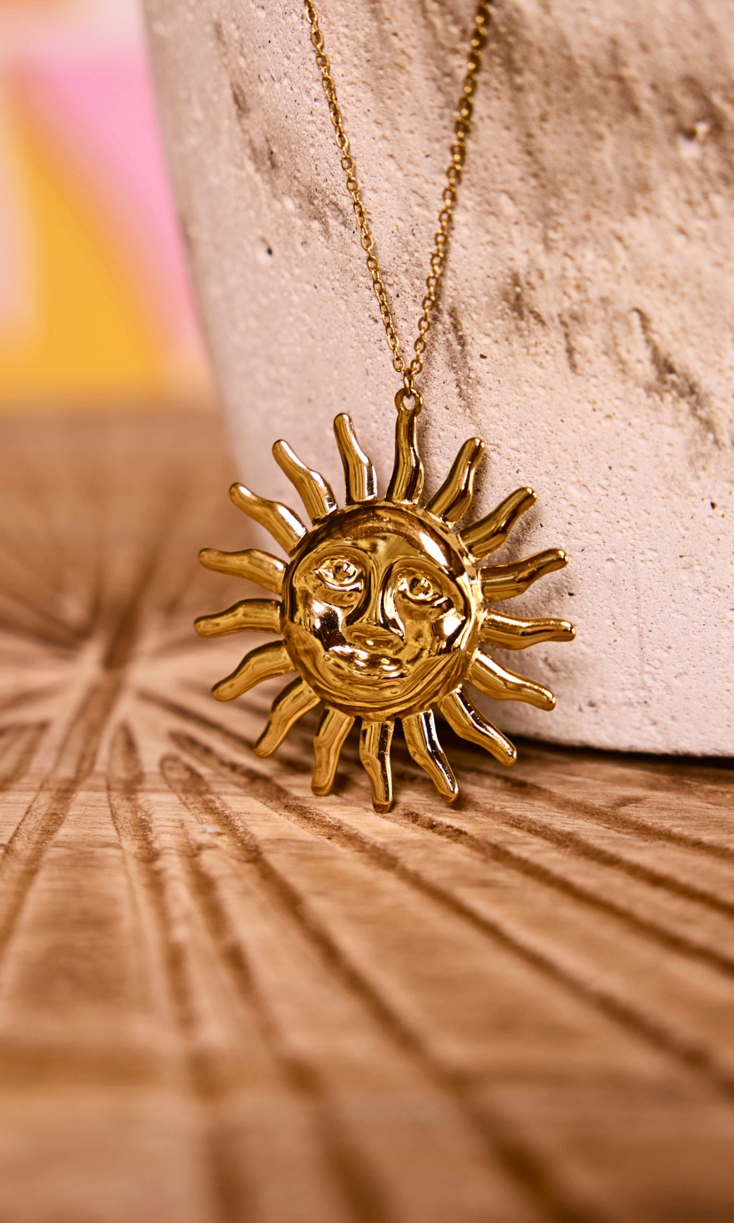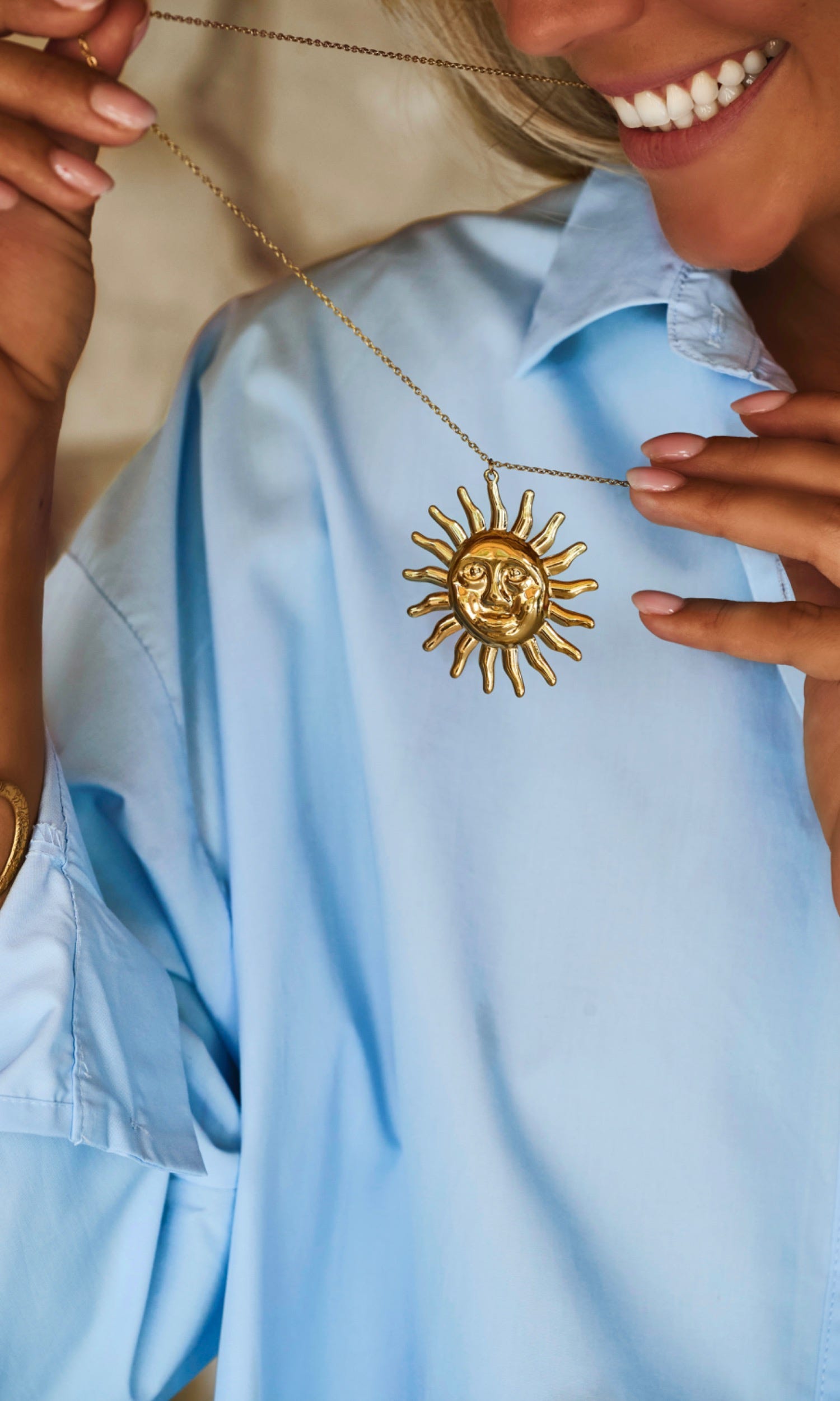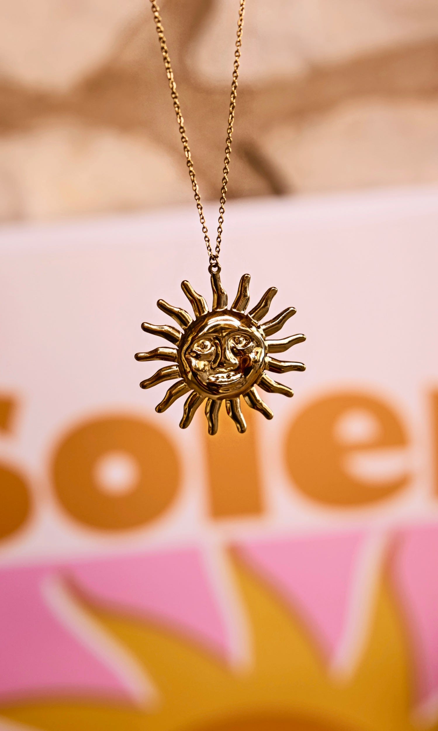 Sautoir en chaîne à maille fine, délicat et élégant, mettant en avant un magnifique pendentif en forme de soleil