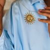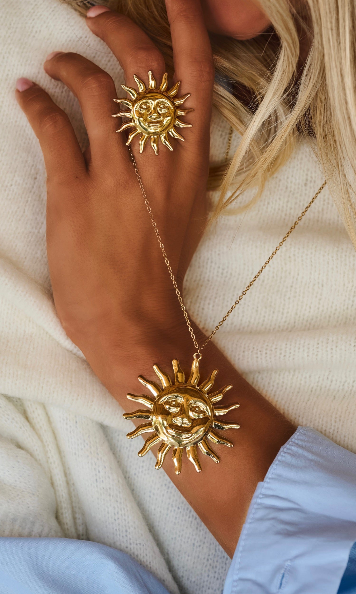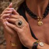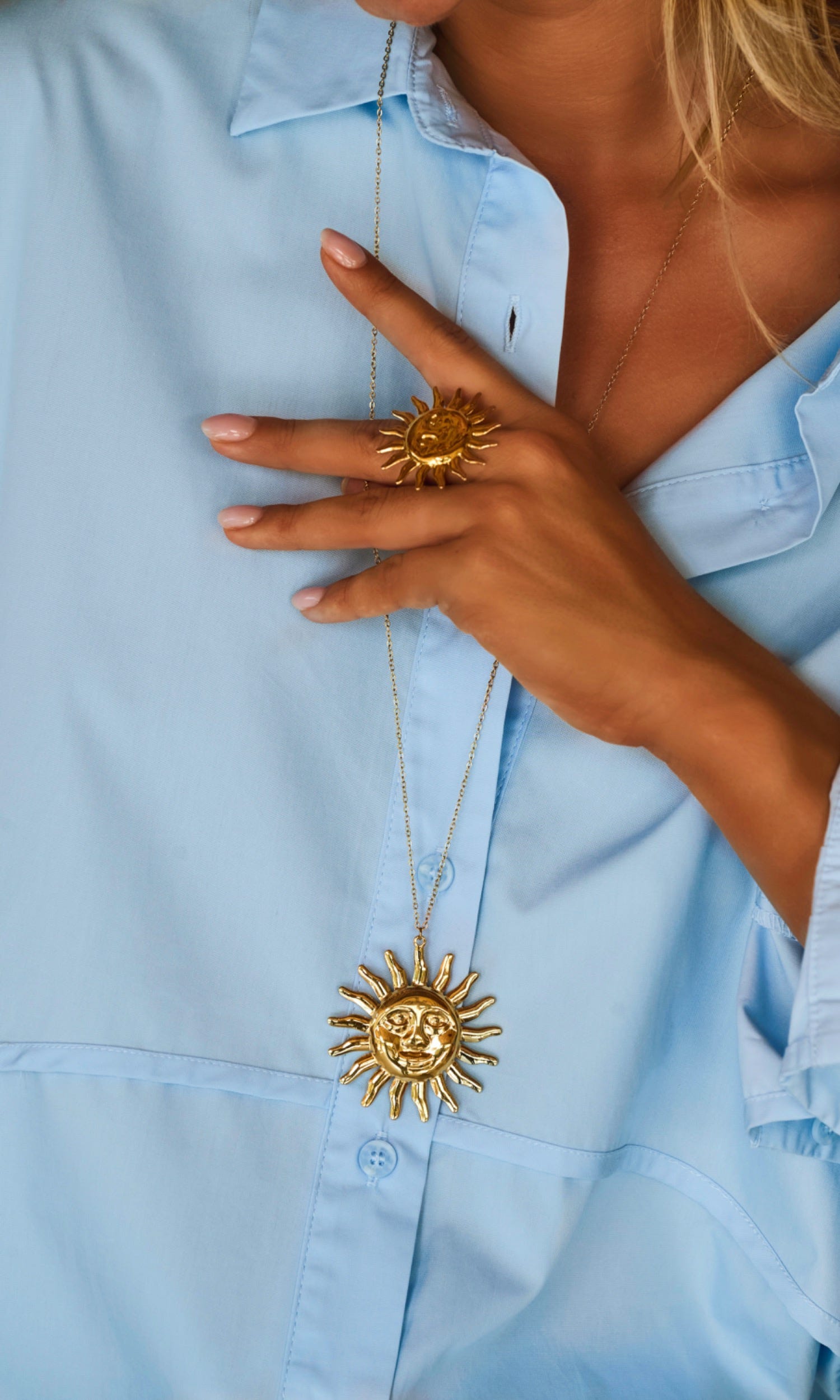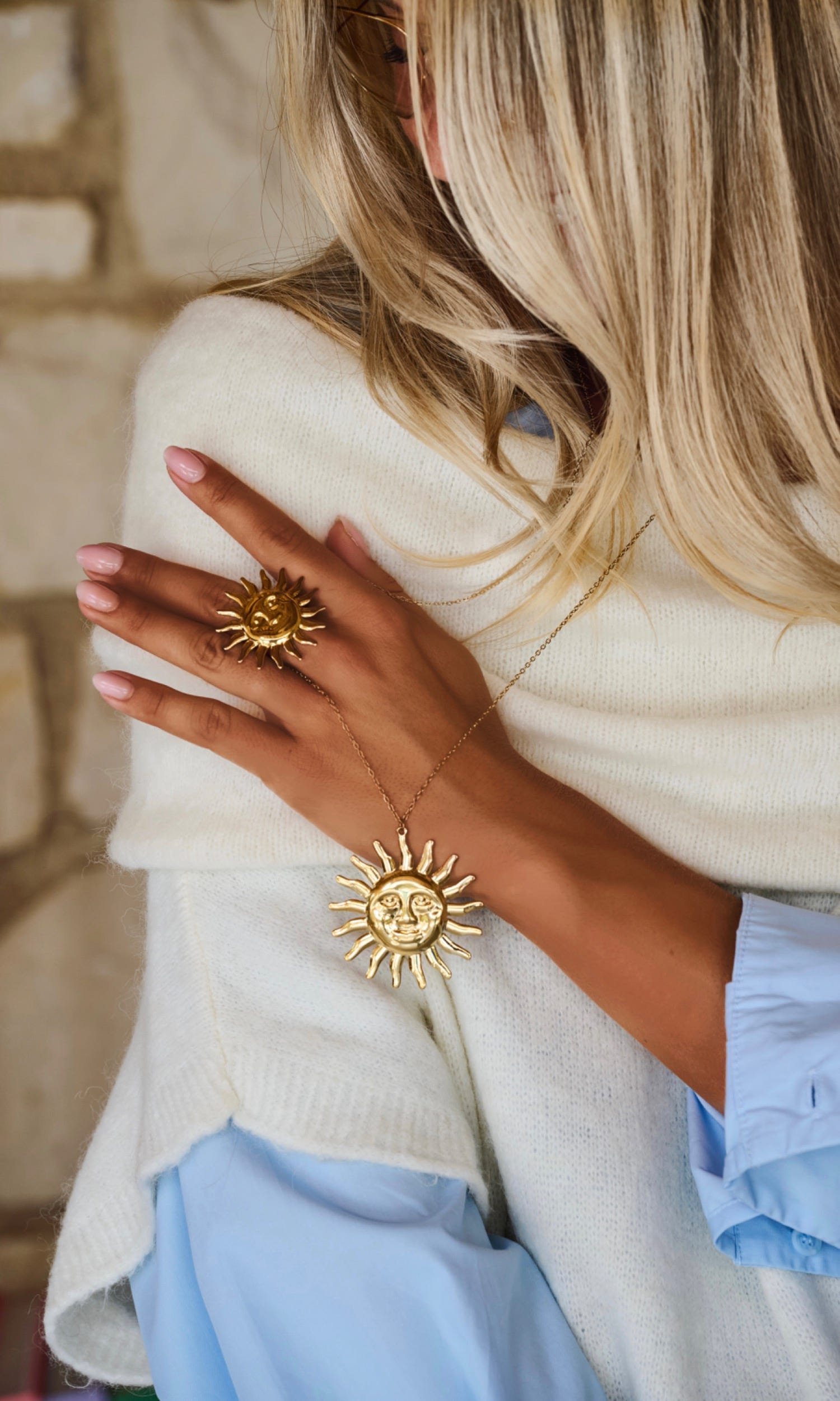 Sautoir en chaîne à maille fine, délicat et élégant, mettant en avant un magnifique pendentif en forme de soleil