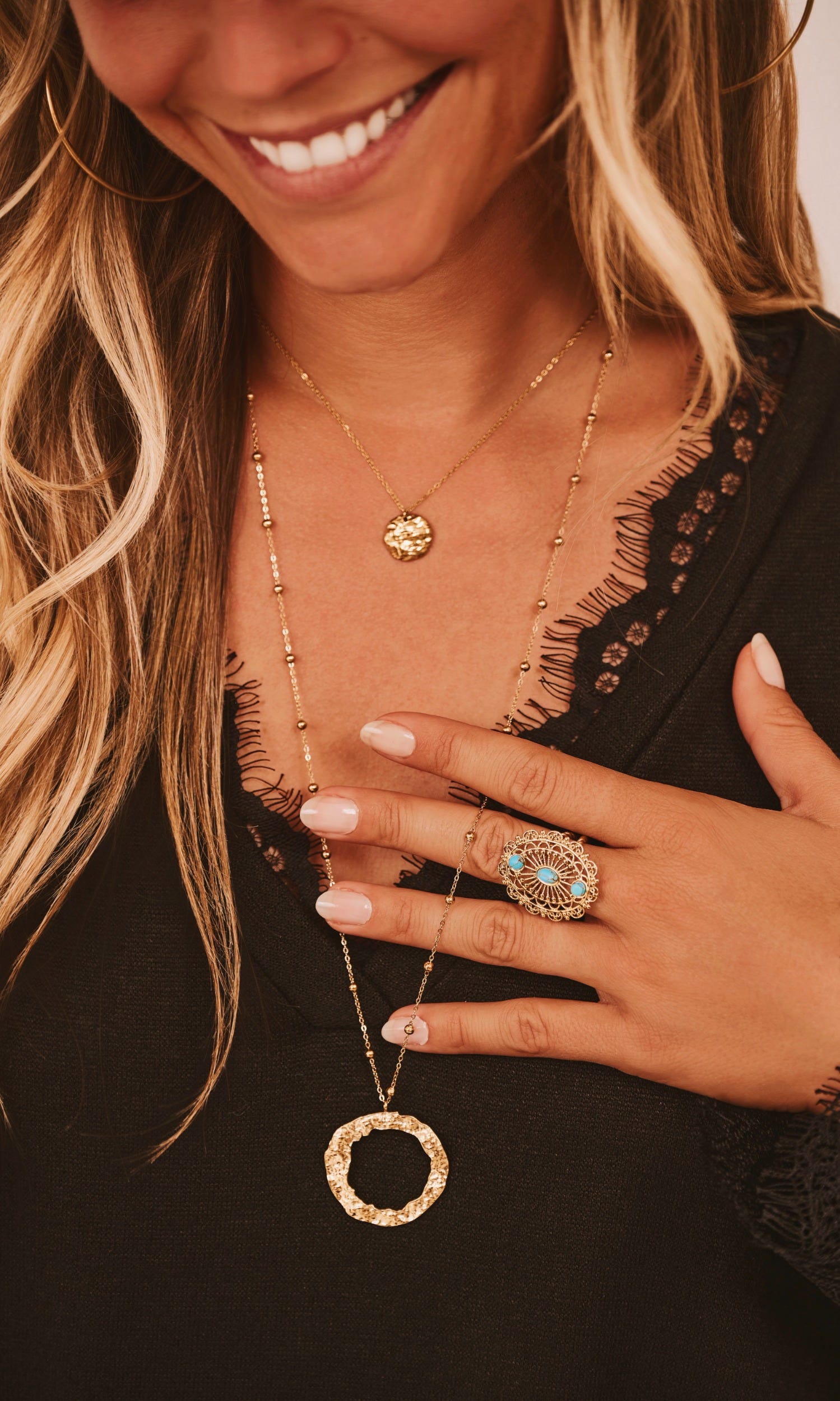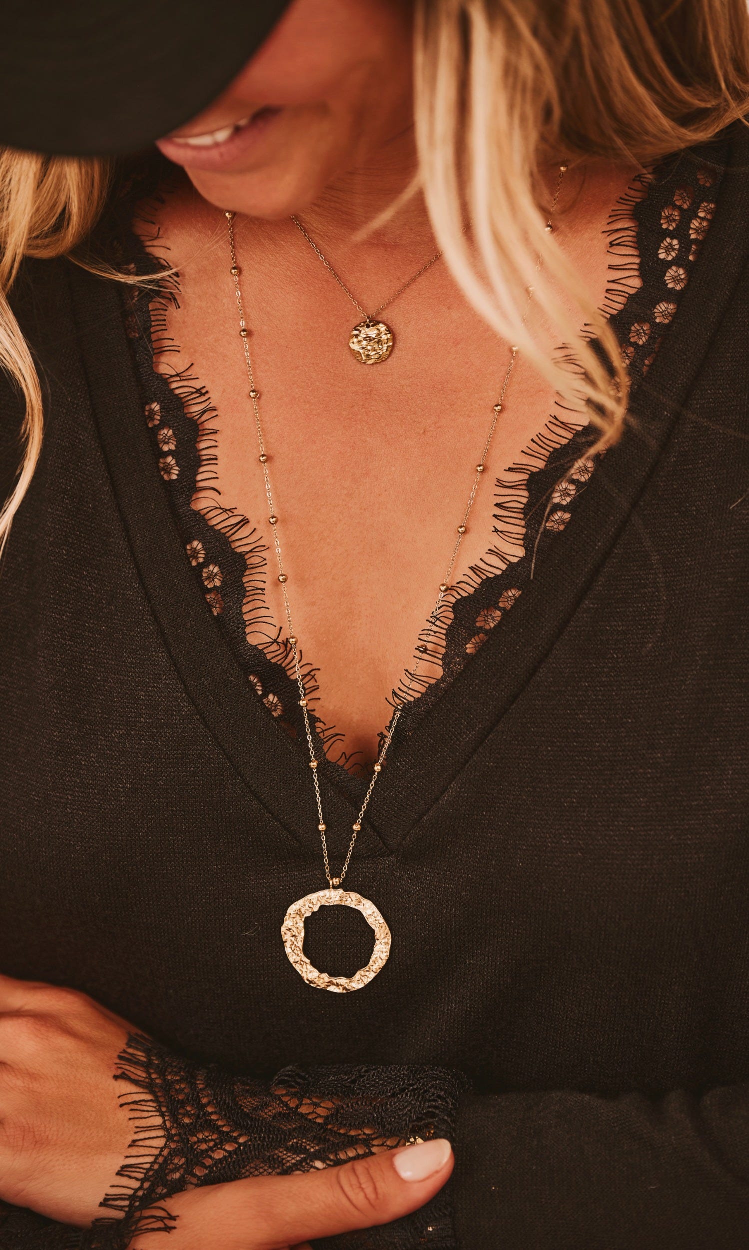Son pendentif en forme de cercle martelé apporte une touche d'originalité et de sophistication à toutes vos tenues.