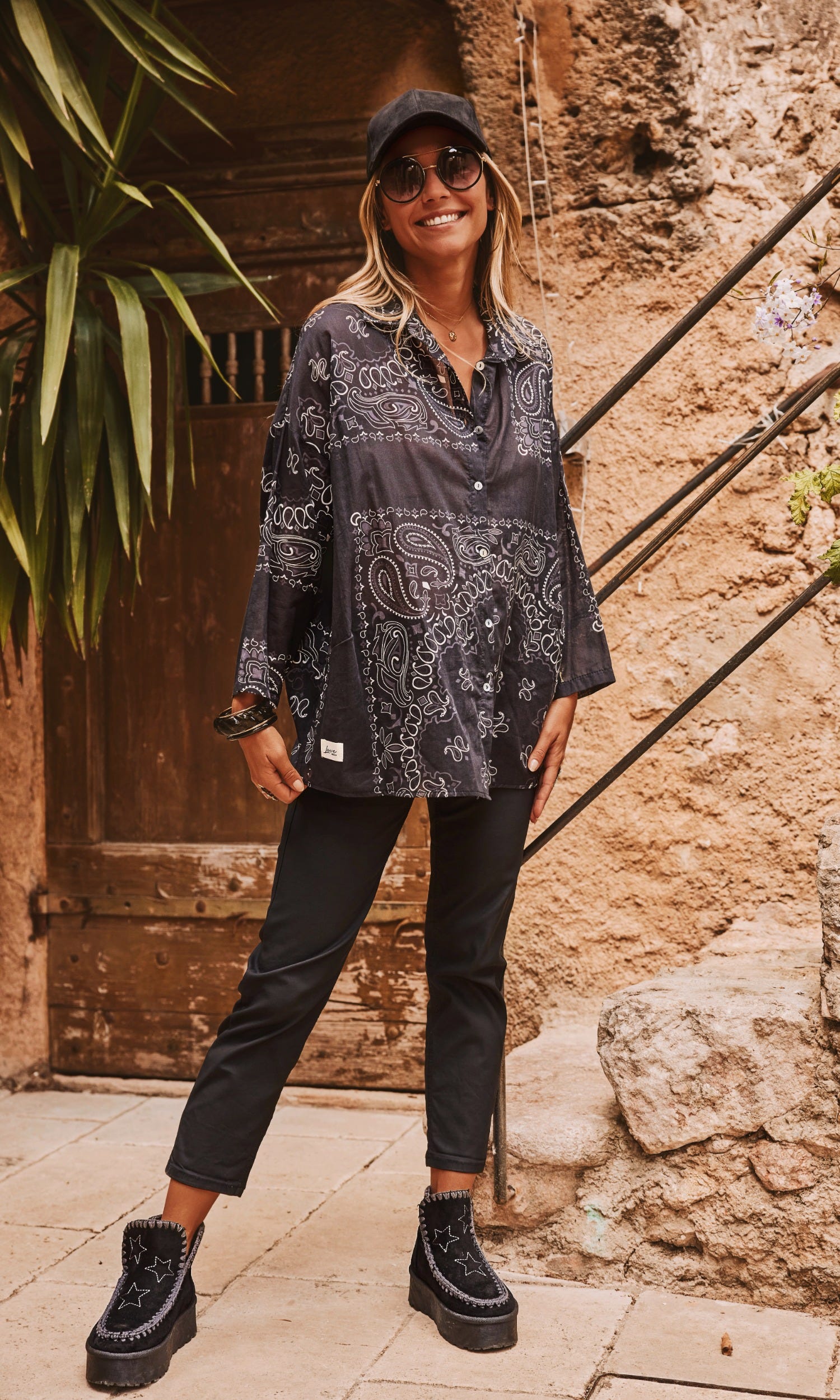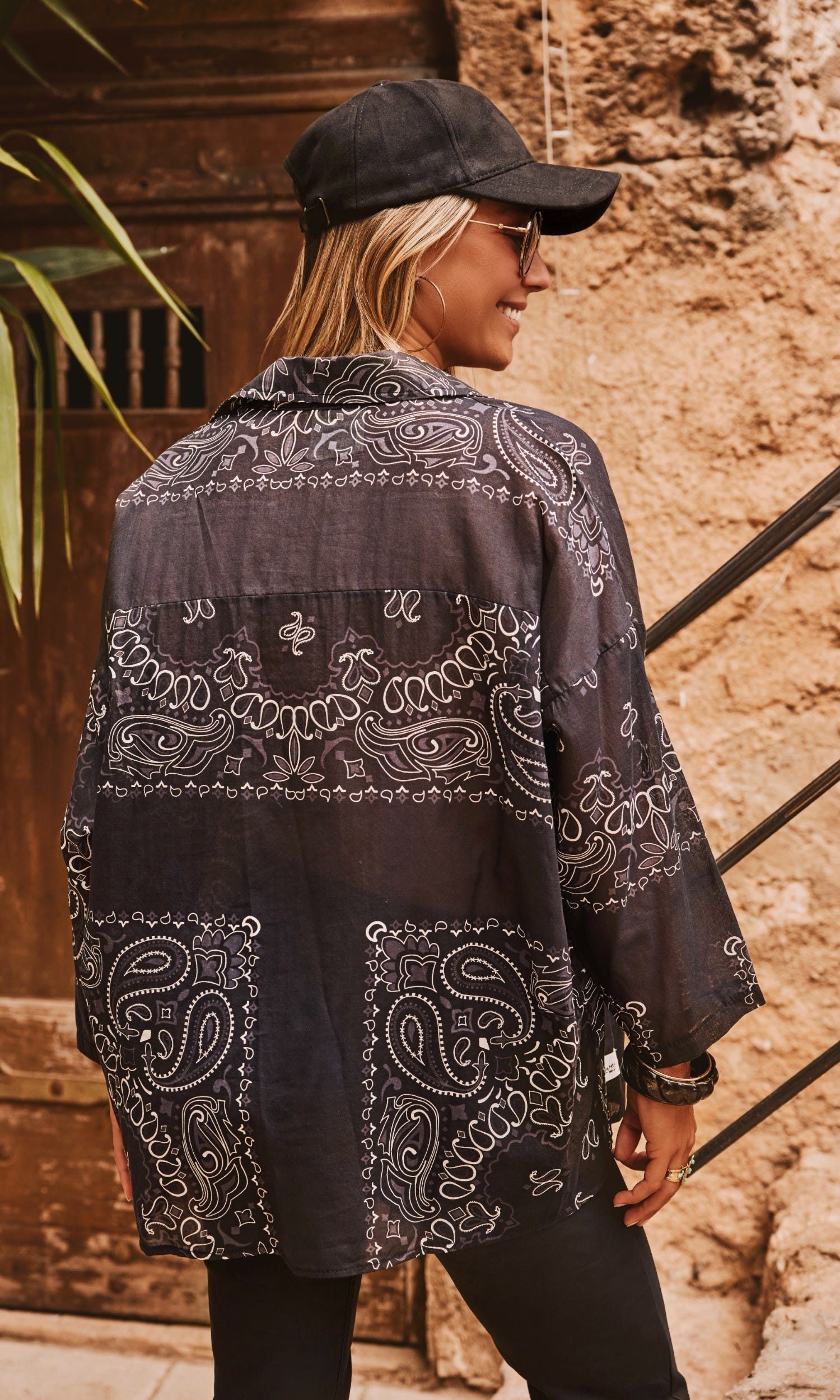 L'imprimé Bandana sur l'ensemble apporte une note tendance, tandis que l'effet de transparence ajoute une subtile sophistication.