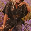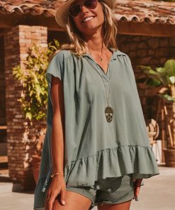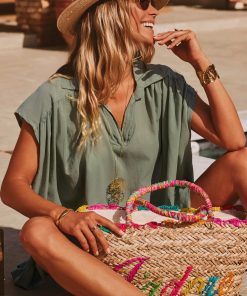 Dotée d'un col chemise et de manches courtes, elle se ferme par des boutons sur toute sa longueur.