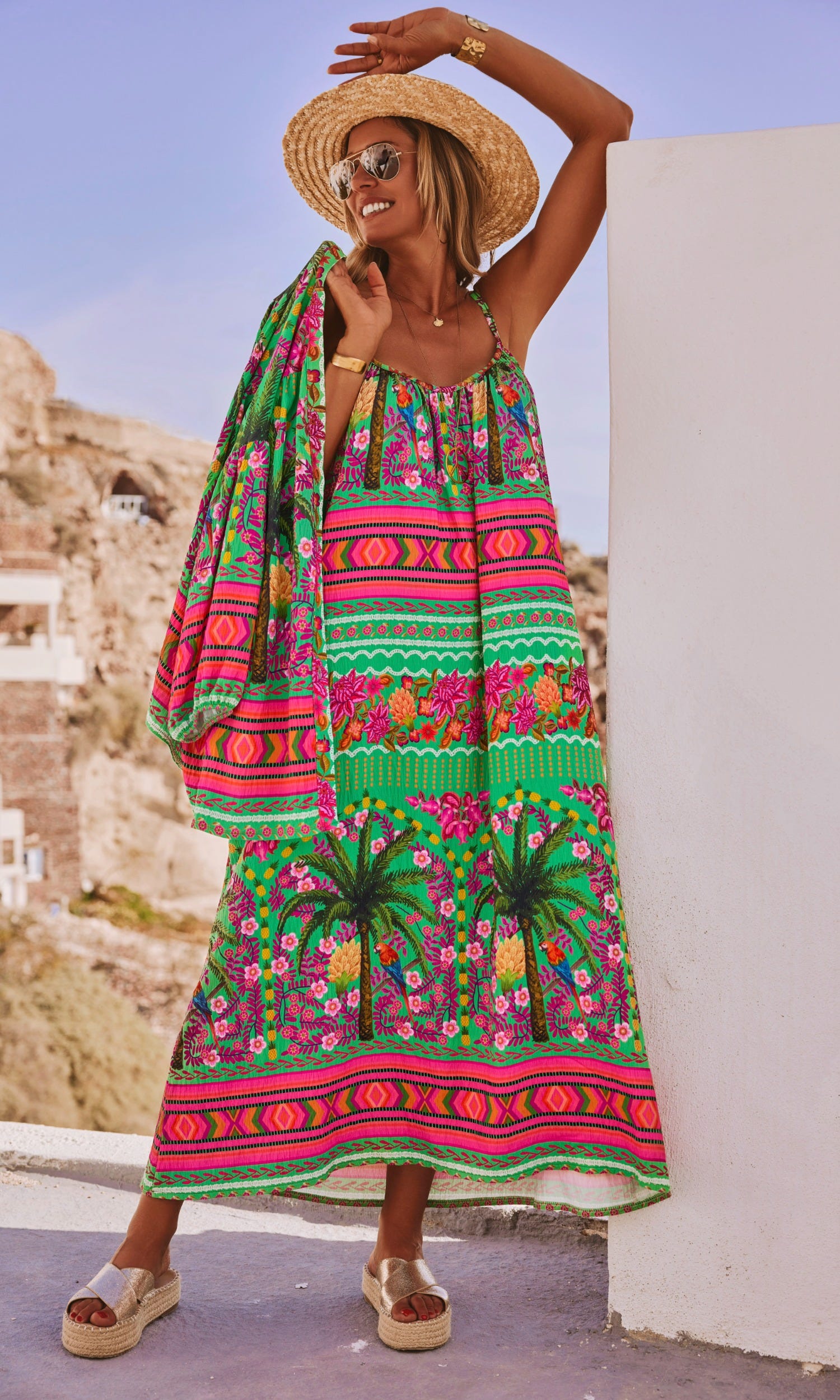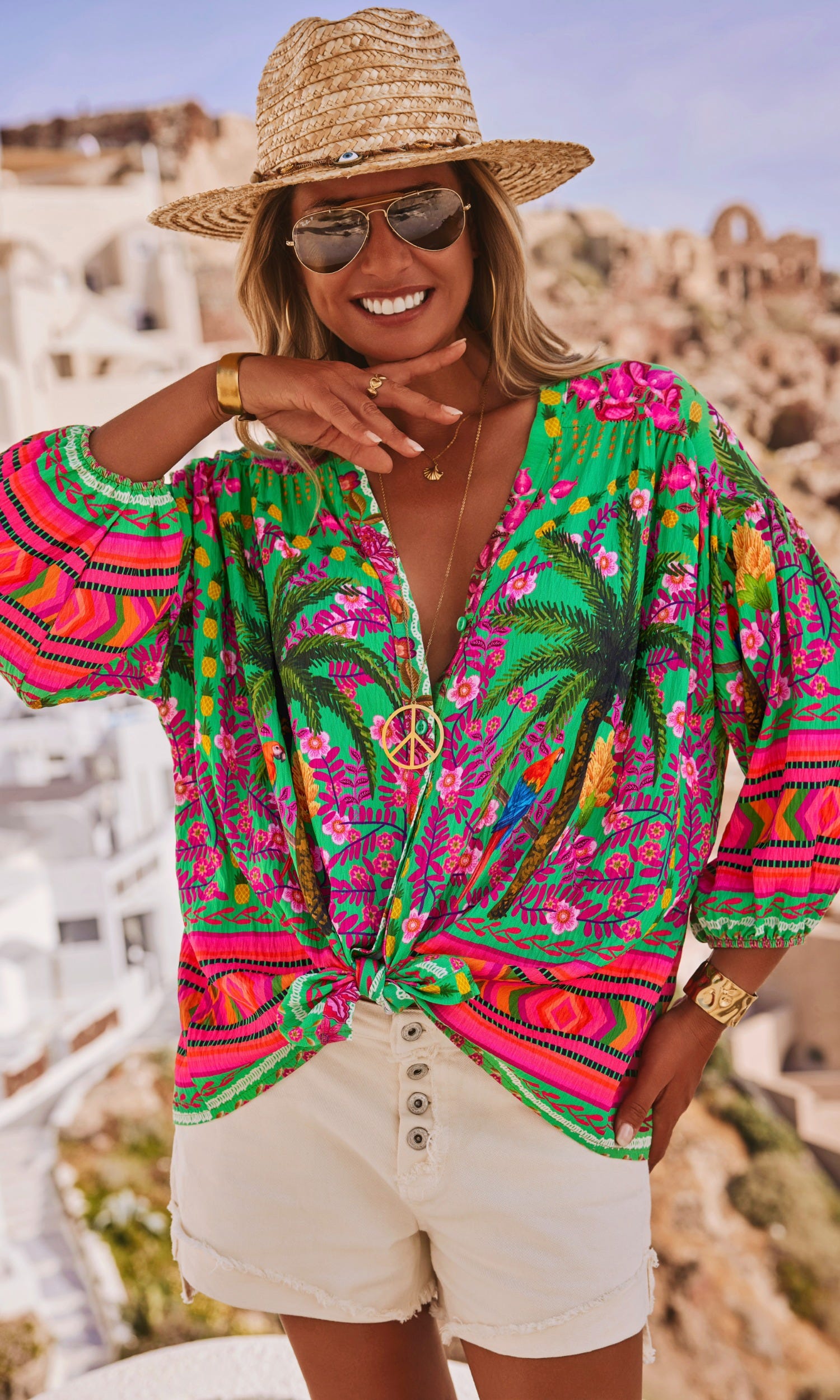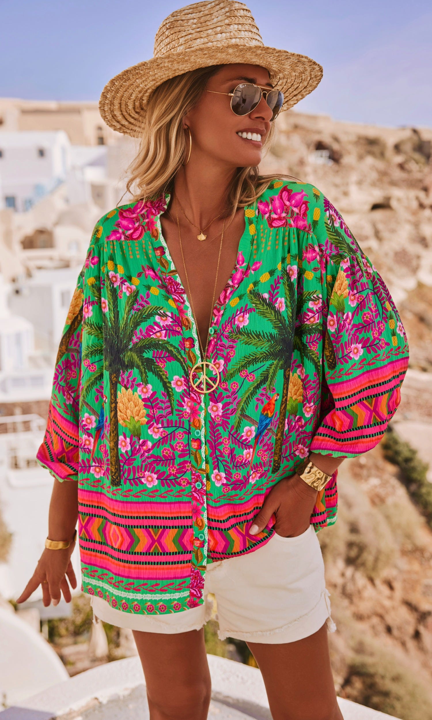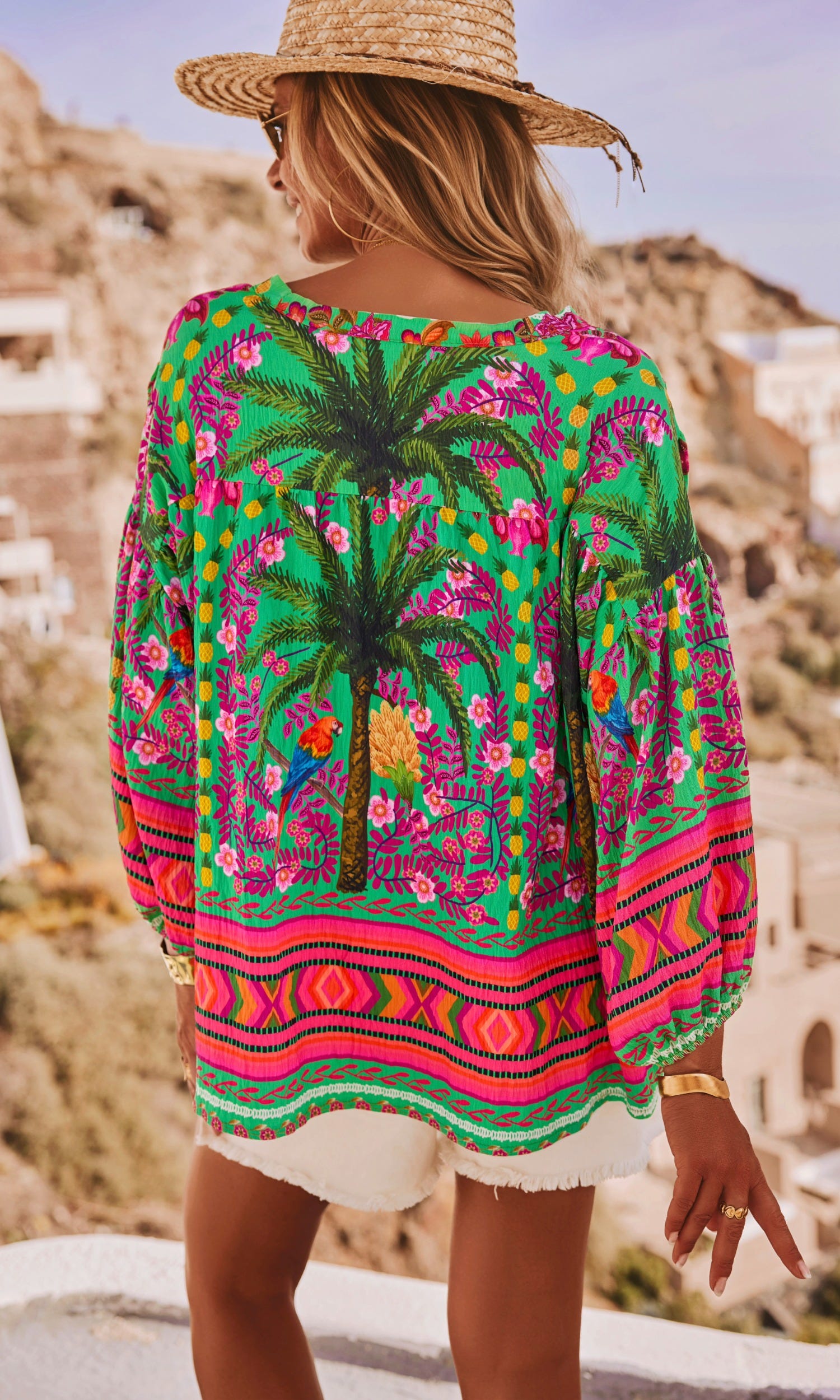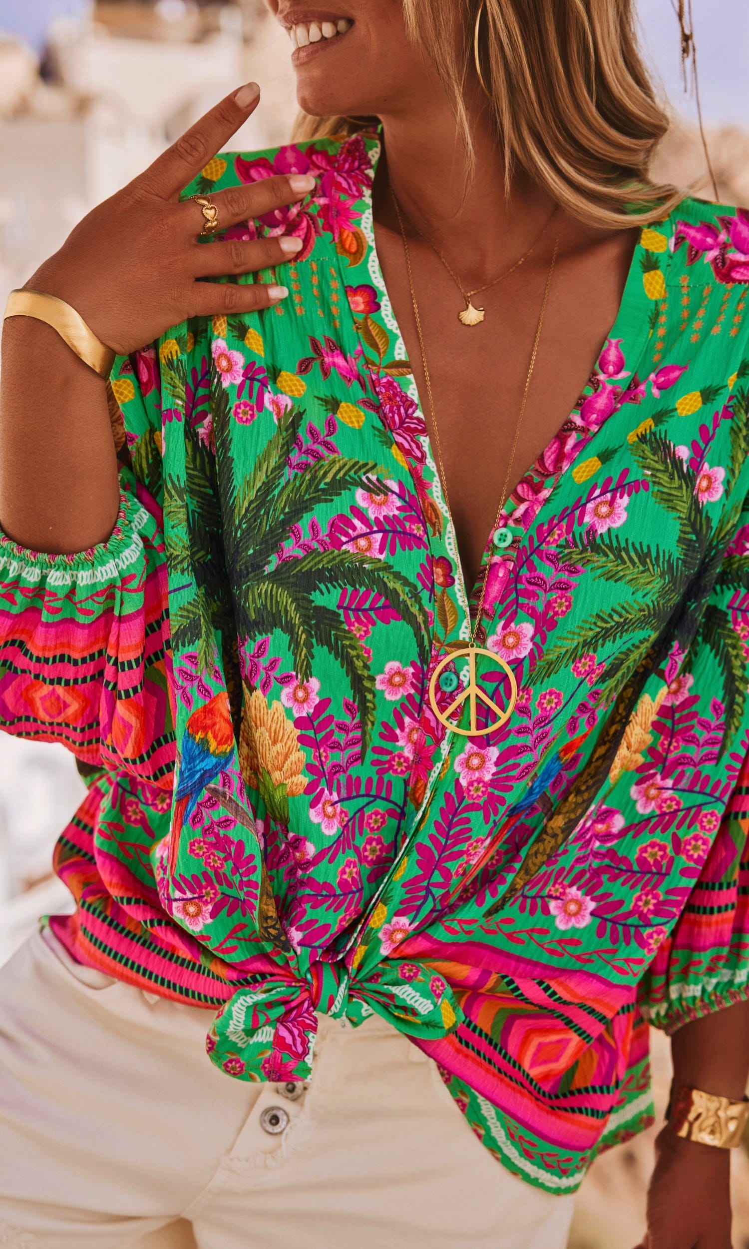 Les manches longues bouffantes élastiquées apportent une élégance raffinée, tandis que le motif Exotic et l'effet de transparence subliment chaque silhouette.
