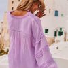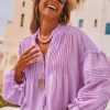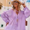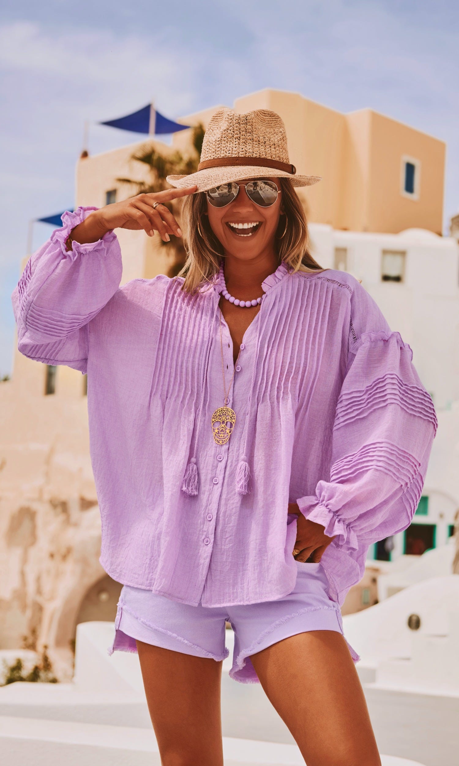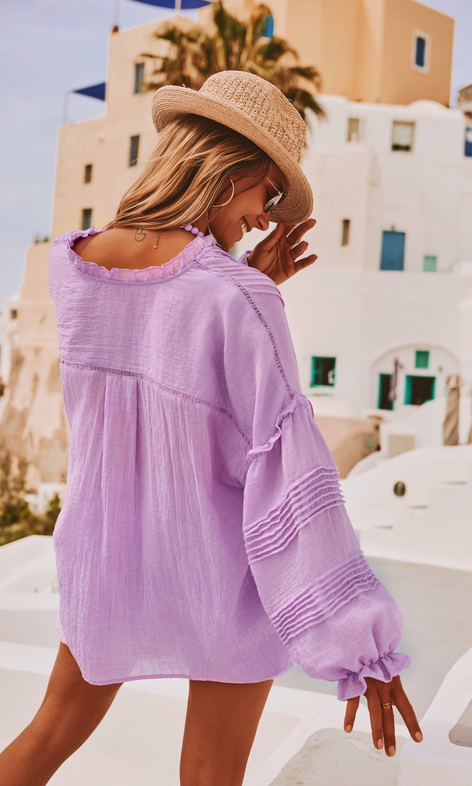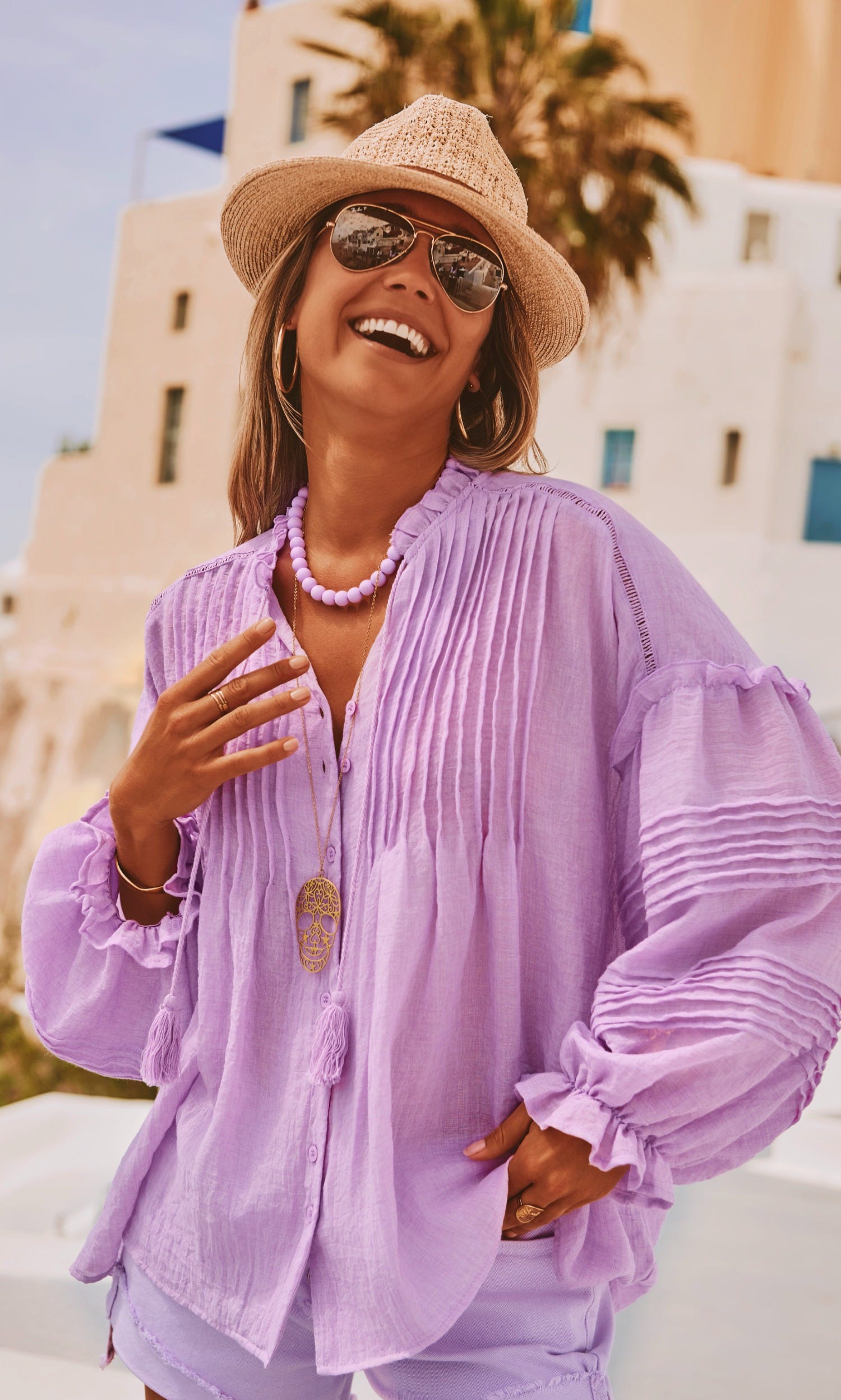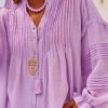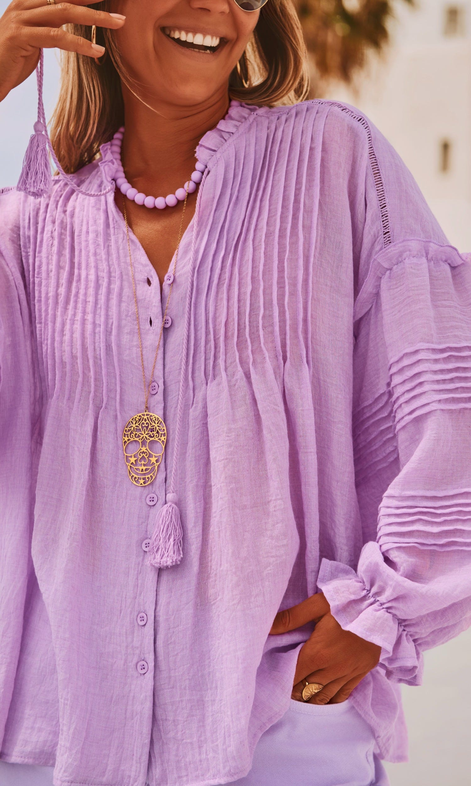 Découvrez cette chemise violette fluide et légère, à la coupe ultra loose et au col volanté avec jabot et cordon à pompons.