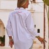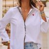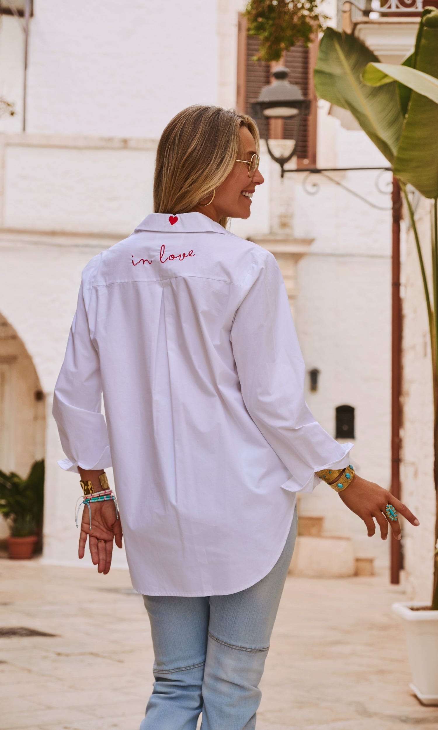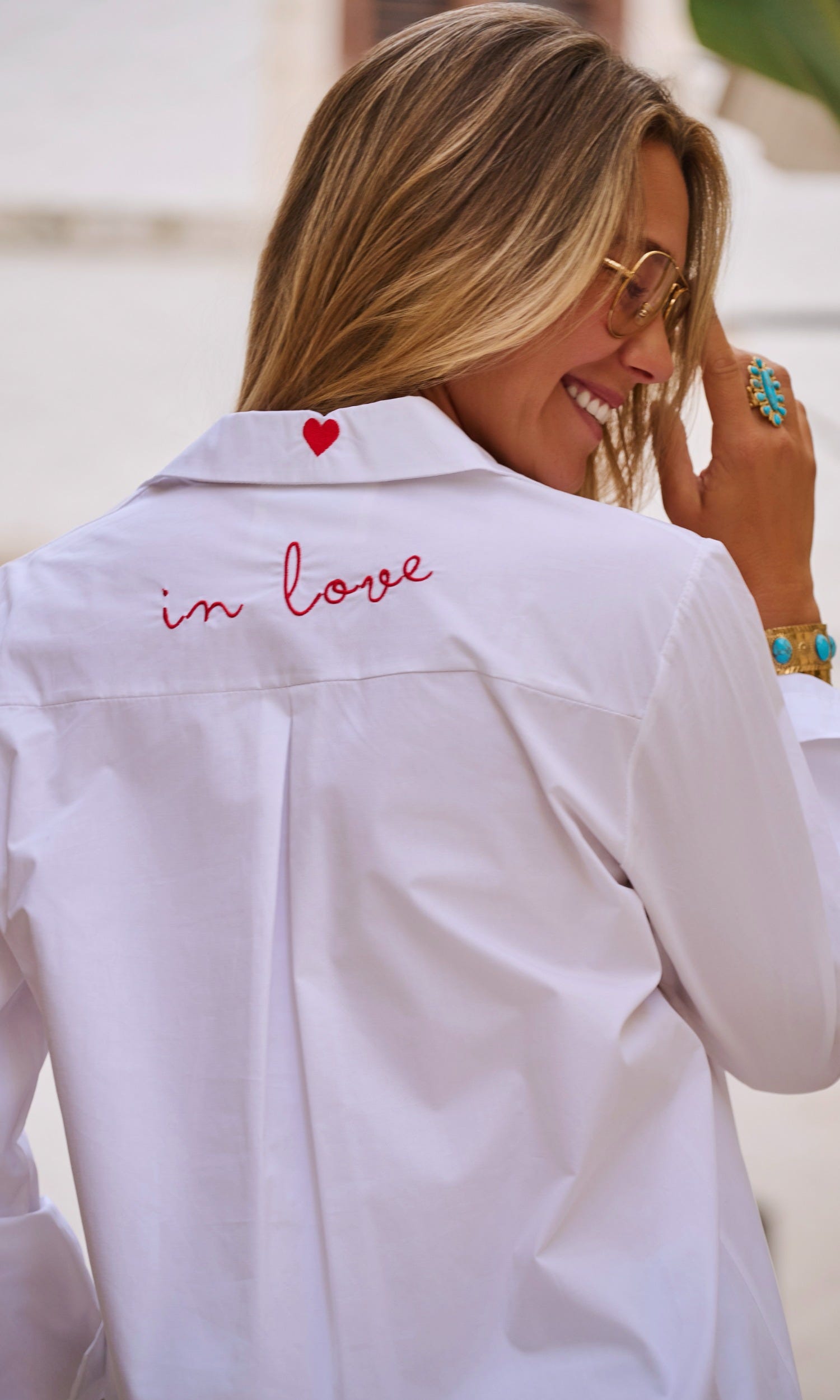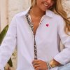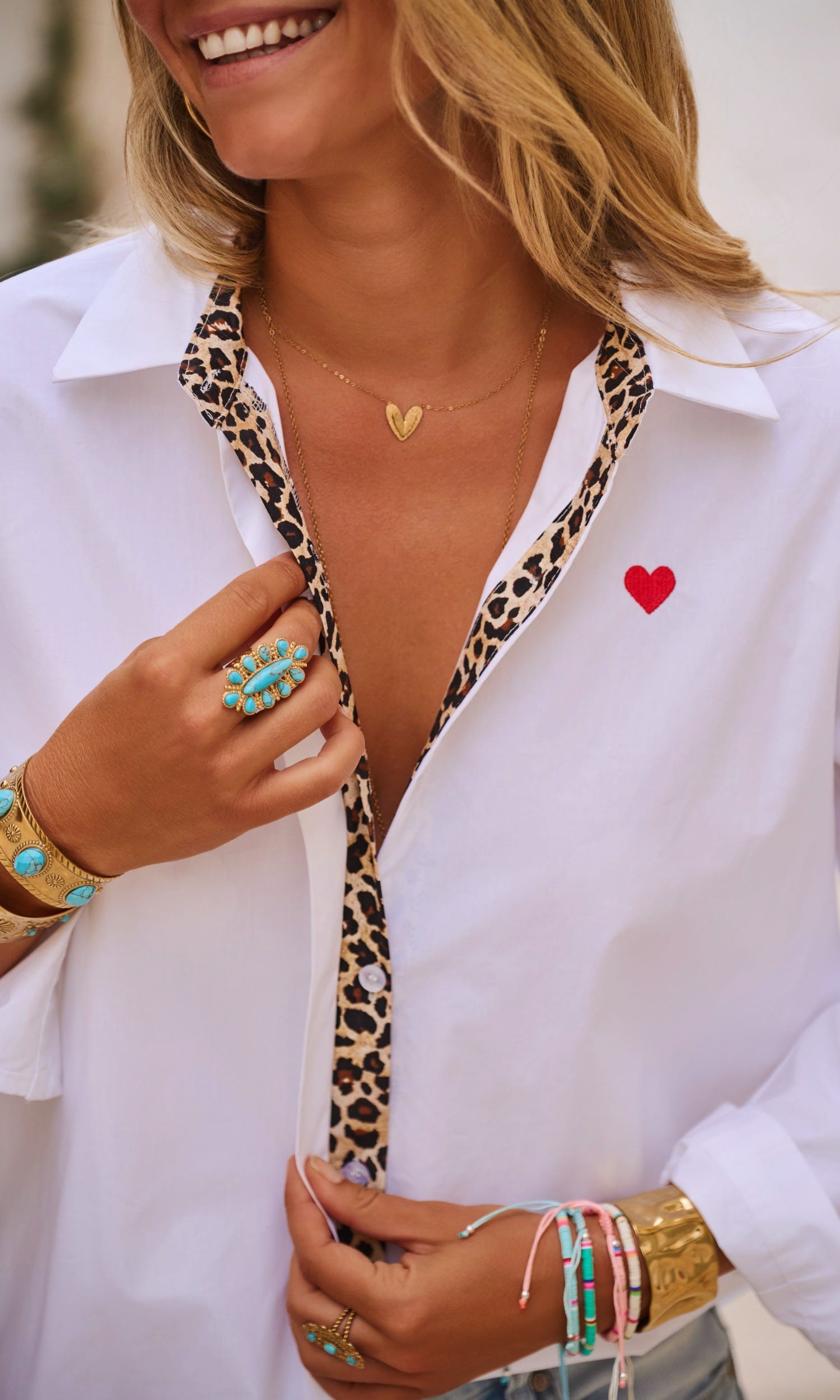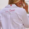 Optez pour l'élégance décontractée avec cette chemise blanche coupe oversize.Son col à rabat léopard et sa patte de boutonnage ajoutent une touche de caractère.La coupe arrondie, plus courte à l'avant, sublime la silhouette.Avec la broderie "In Love" et un délicat petit cœur au dos et à l'avant, elle est le parfait mélange de chic et de fun.