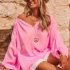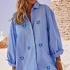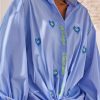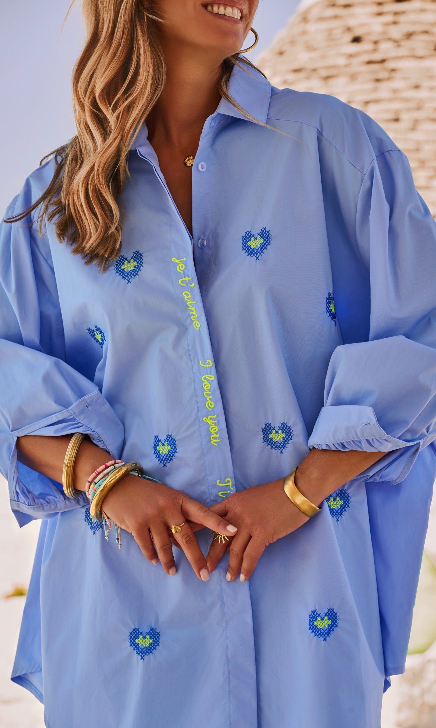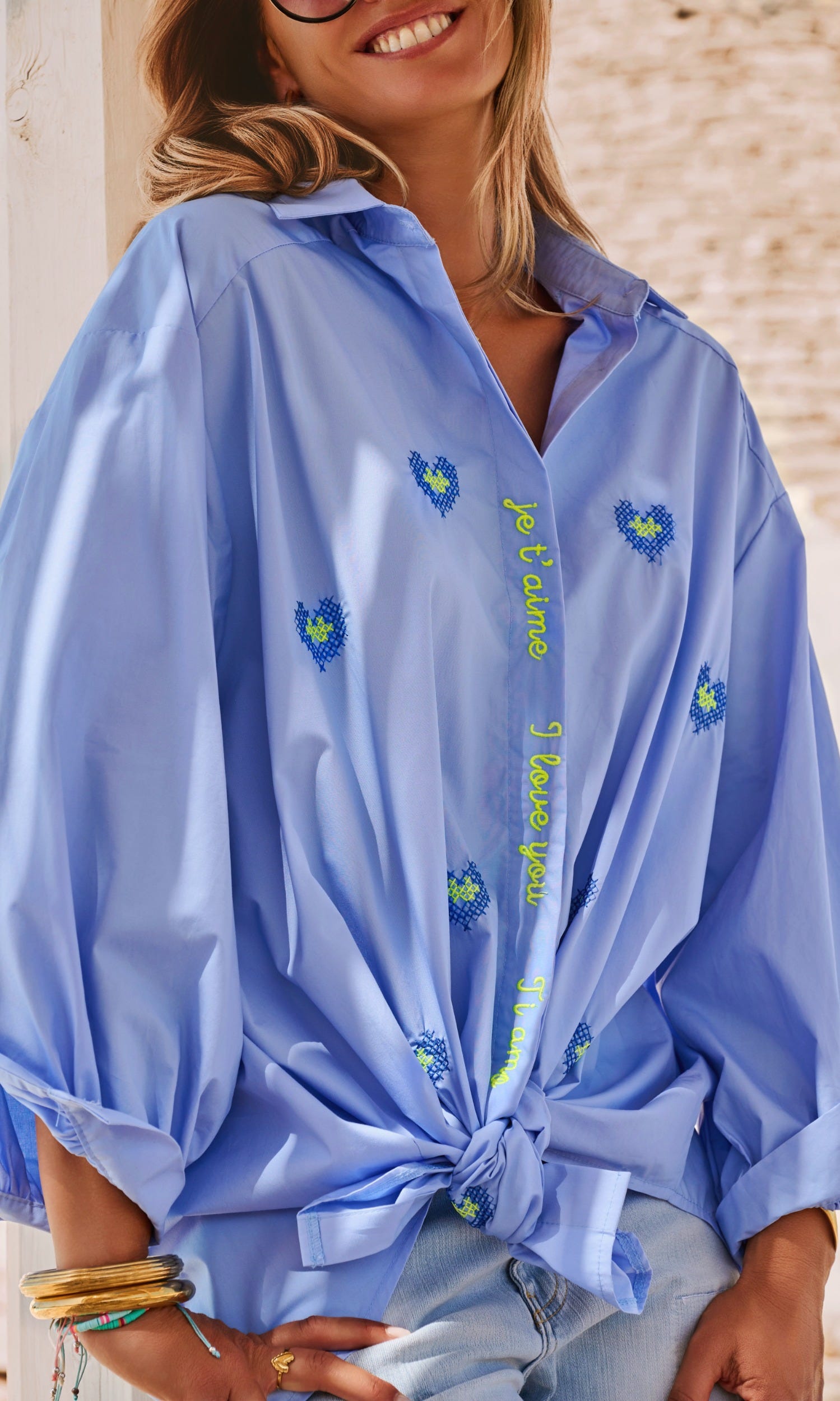 Les manches 3/4, fermées par un bouton aux poignets, accompagnent des broderies cœur rouge et des messages d’amour en "Je t'aime", "I love you" et "Ti amo".