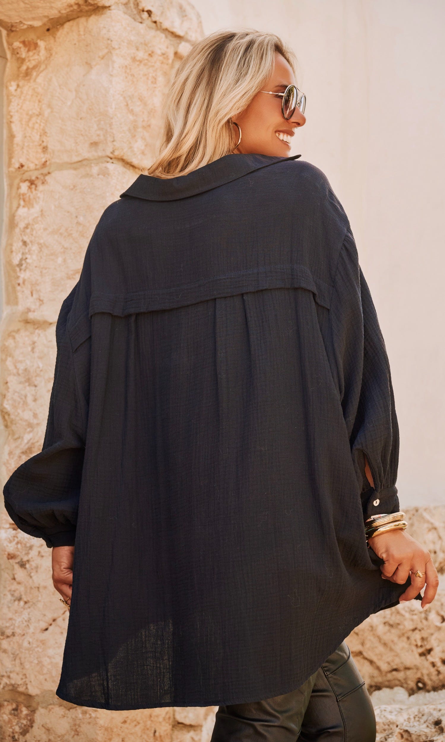 Adoptez un style décontracté avec cette chemise noire fluide et légère.