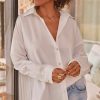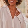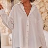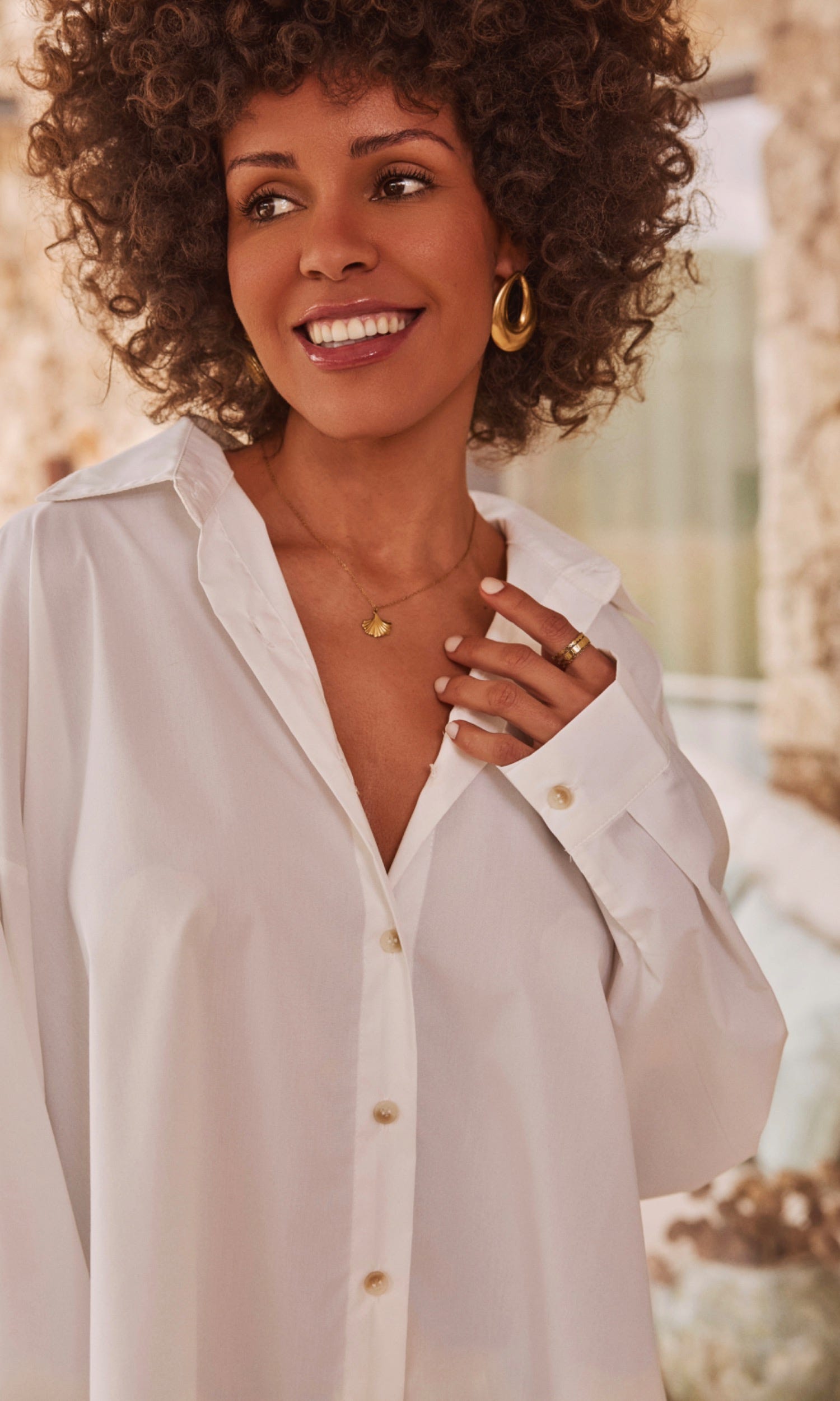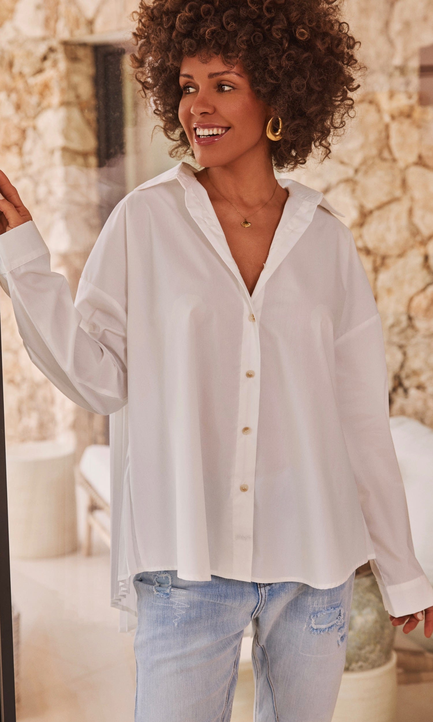 Élégante chemise blanc cassé oversize en popeline, au col classique et à la coupe trapèze.