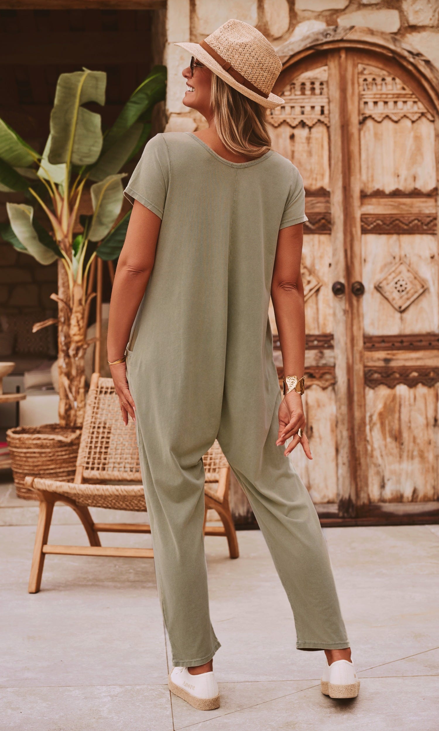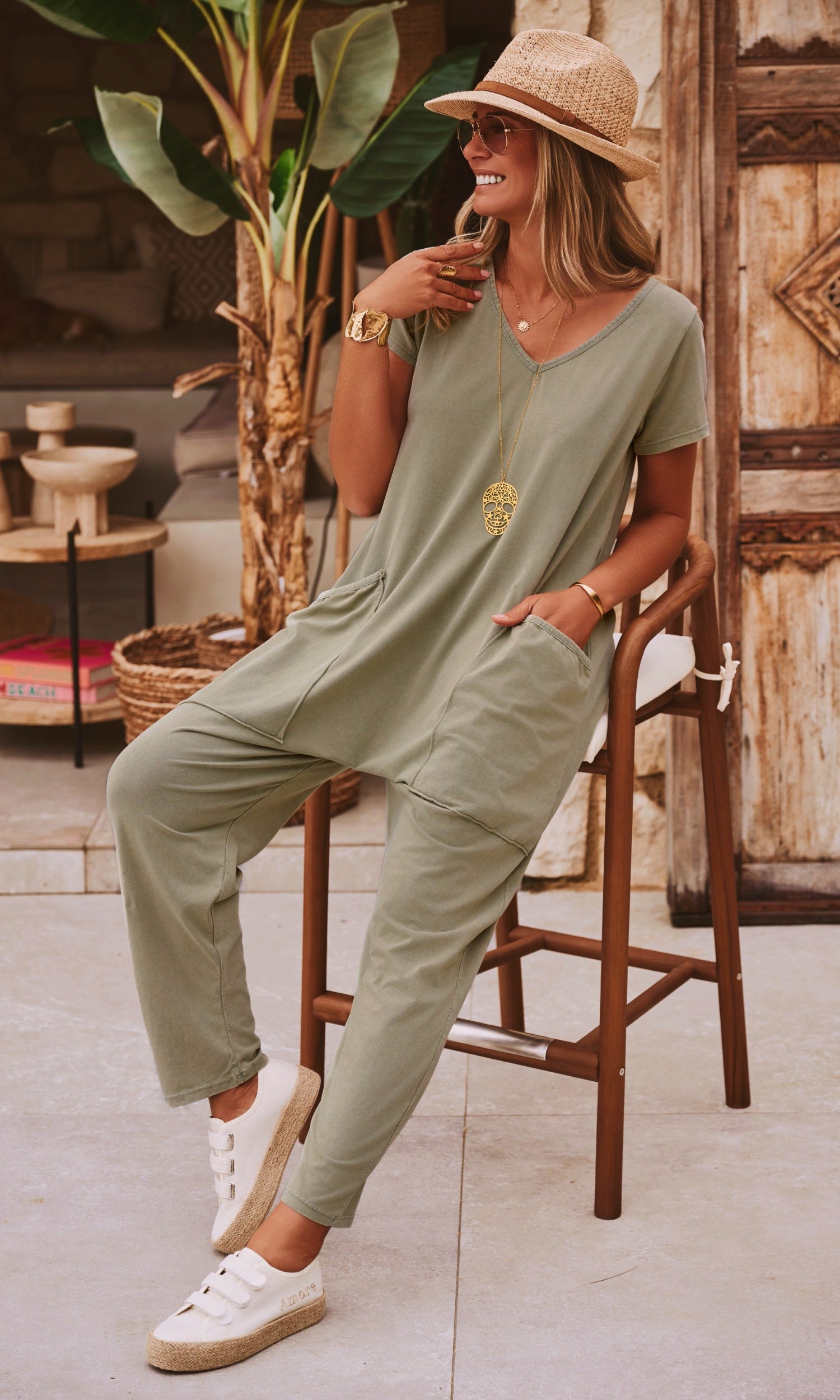 Découvrez notre combi coupe loose kaki clair, idéale pour un look décontracté.