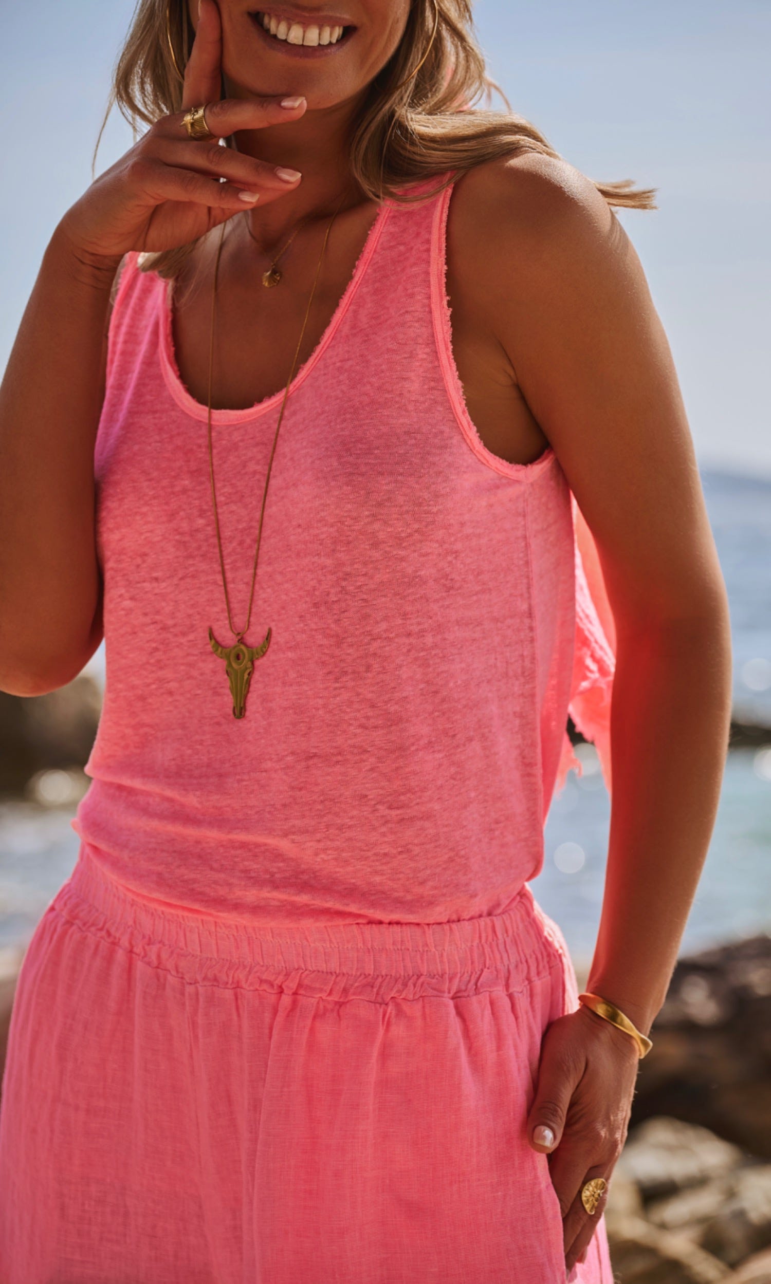 Découvrez notre débardeur corail fluo en lin, parfait pour ajouter une touche de couleur à votre garde-robe.