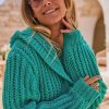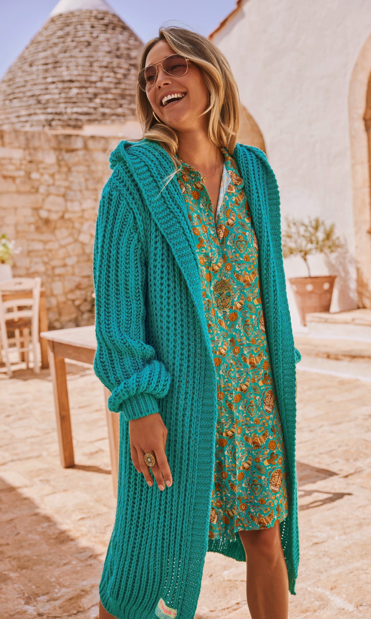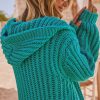 Confectionné en grosses mailles fantaisie, il arbore de délicates torsades et une capuche pratique.