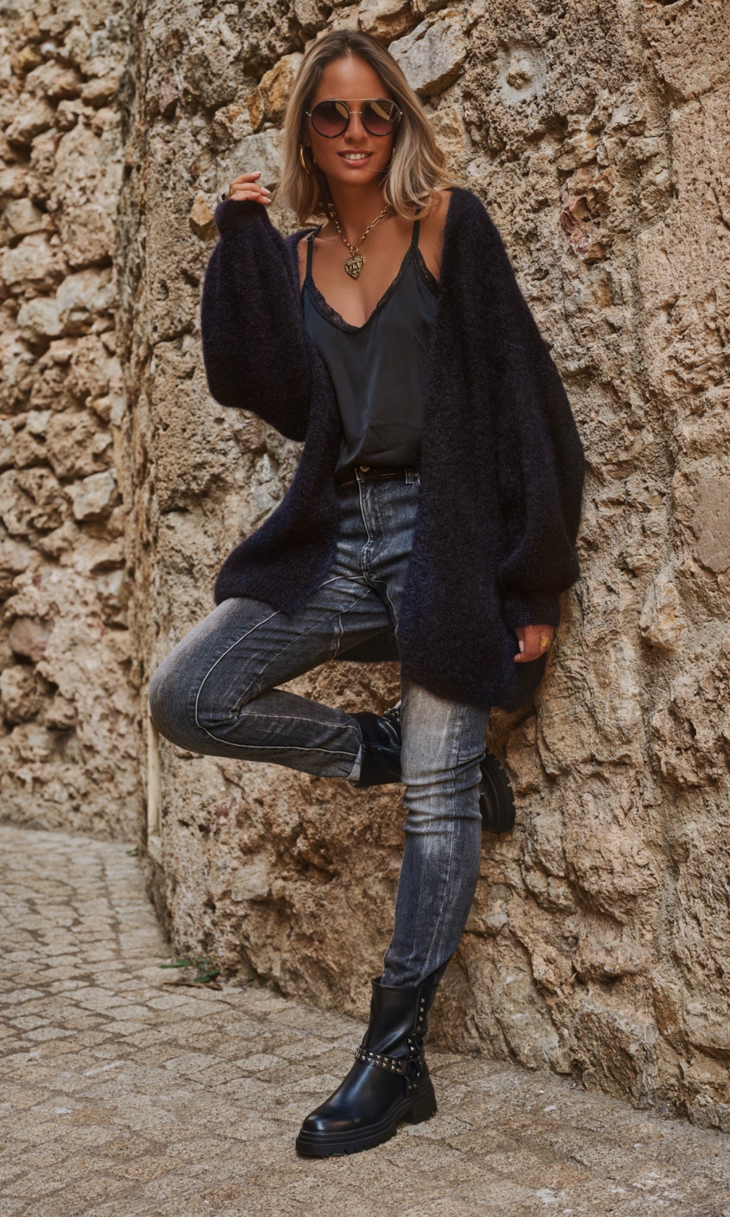 Découvrez notre gilet noir loose tout doux en mohair, parfait pour un style décontracté.