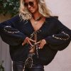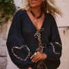 Les manches longues à emmanchures tombantes sont agrémentées de surcoutures à motif léopard en forme de cœur.