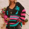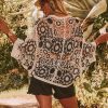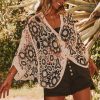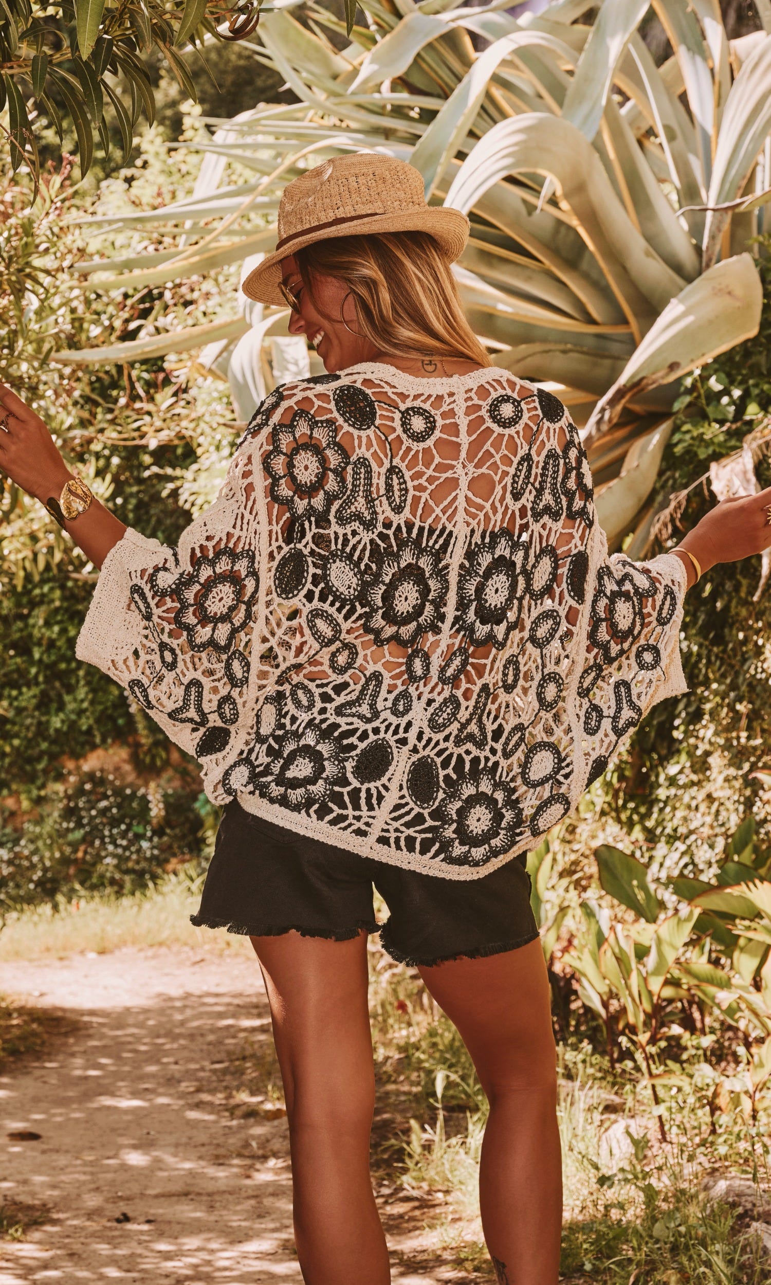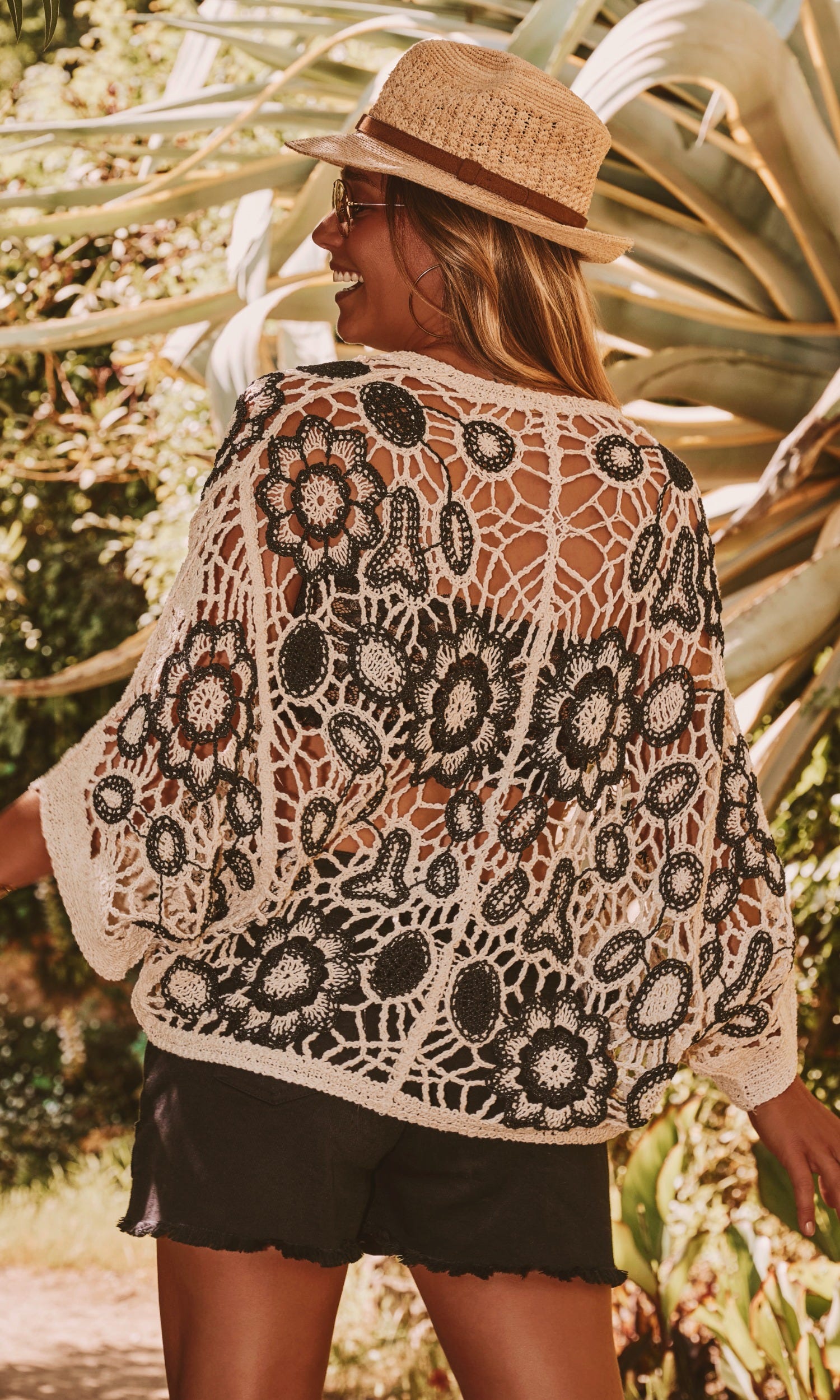 Découvrez notre gilet noir et beige en crochet, à la coupe loose et au col V charmeur.