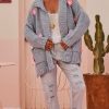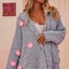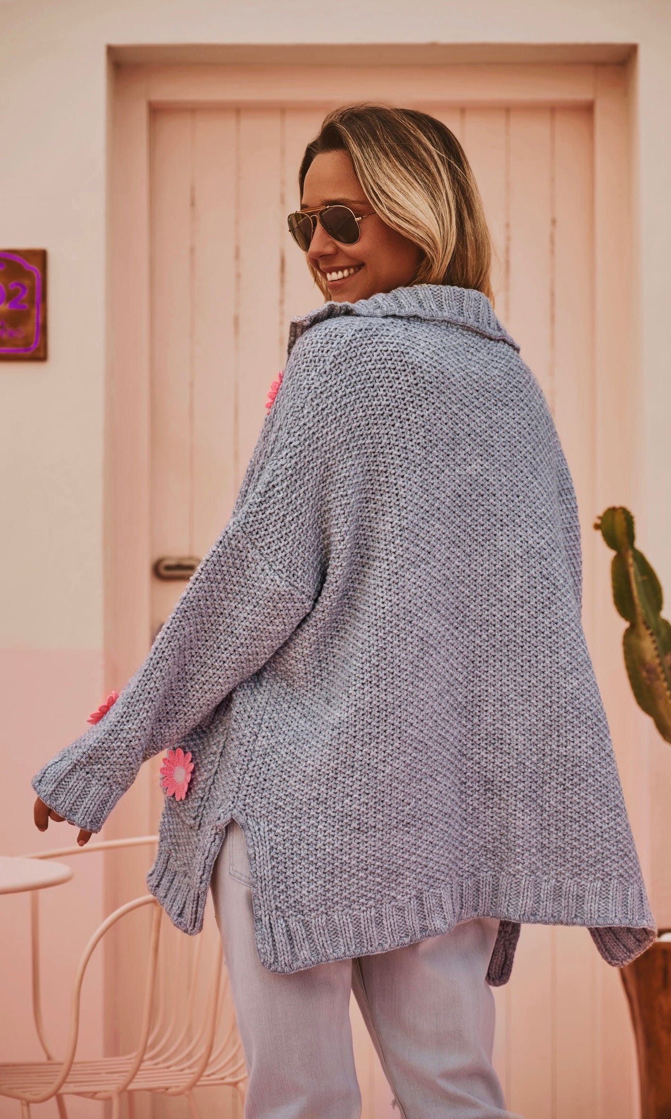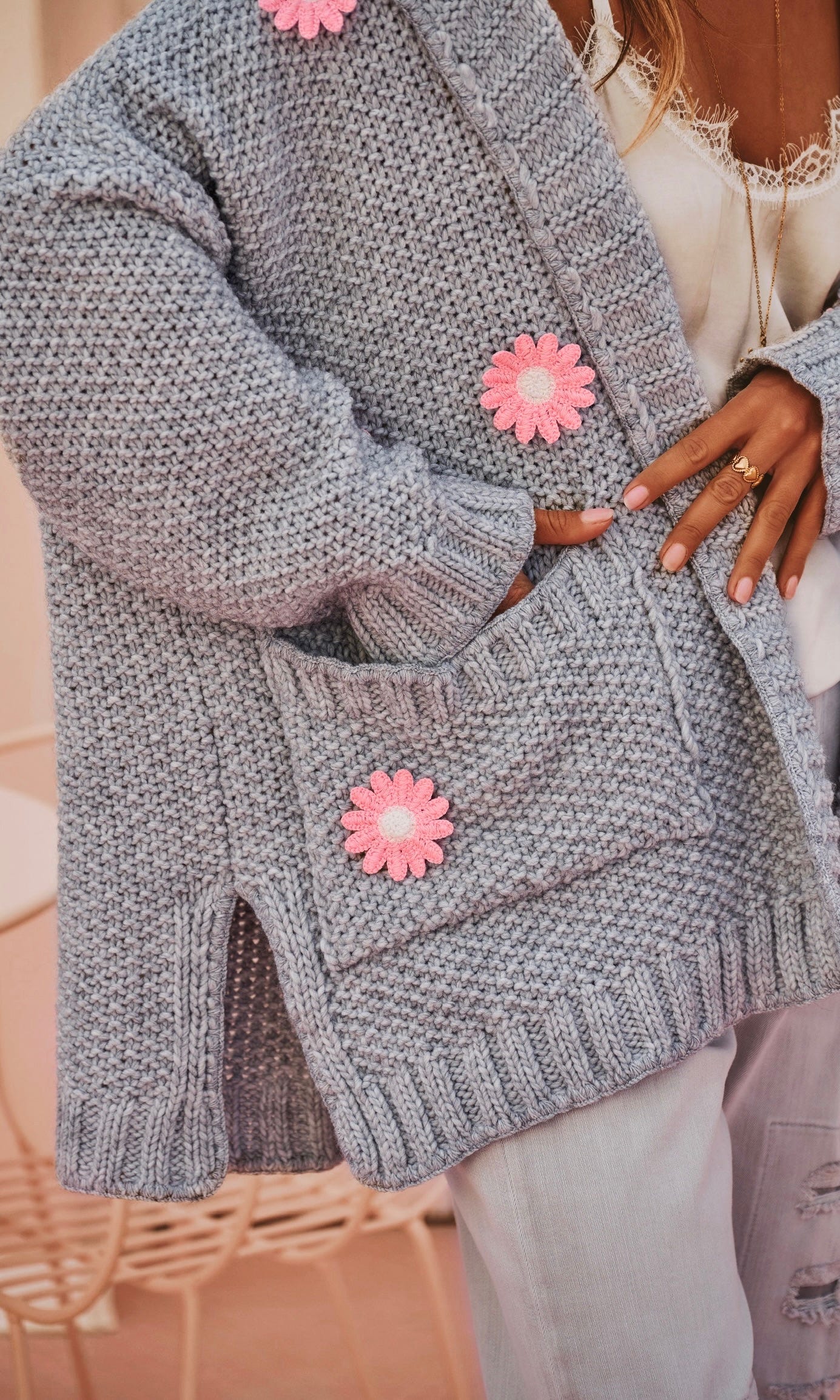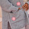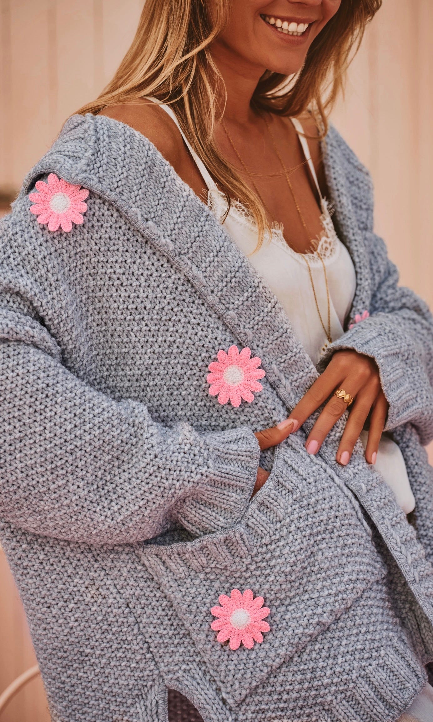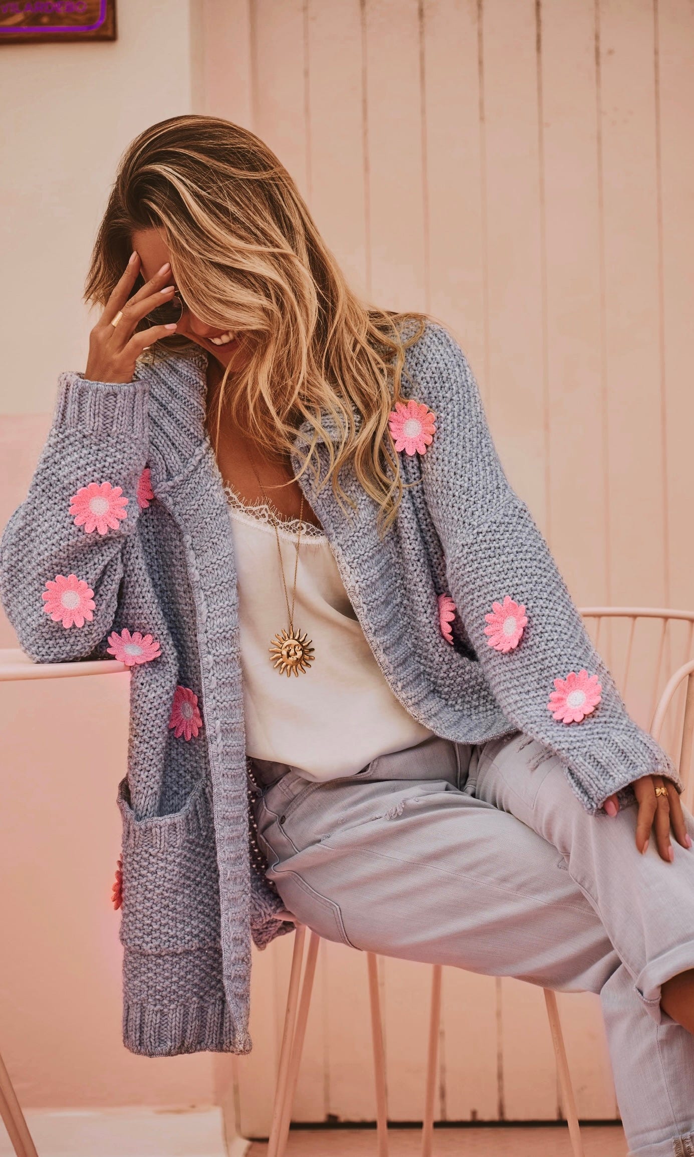 Avec des manches longues côtelées, un bas droit côtelé et deux poches plaquées, il se distingue par de grandes fleurs roses brodées.