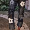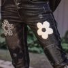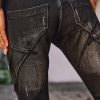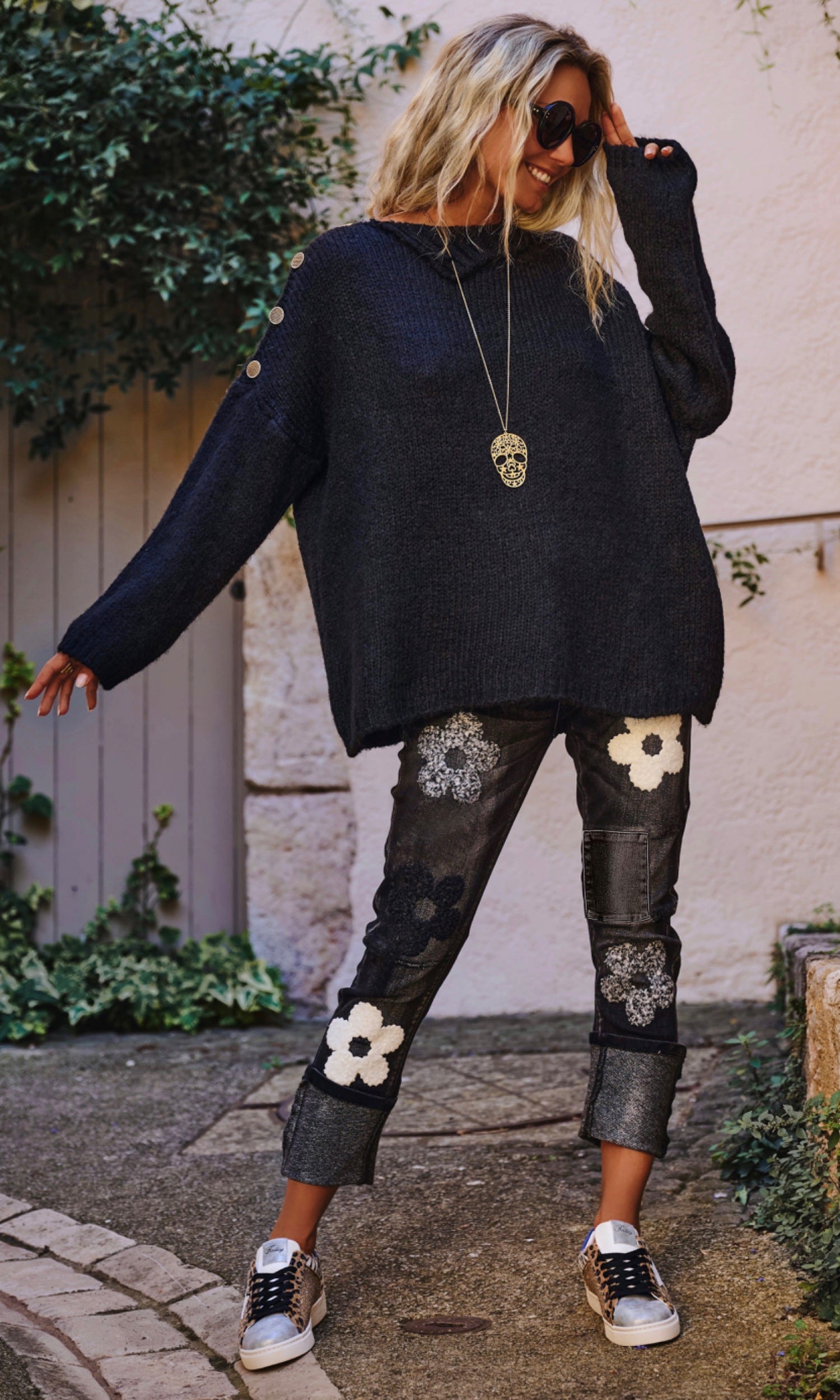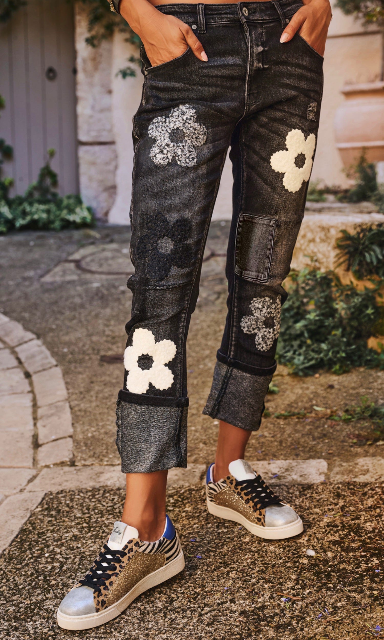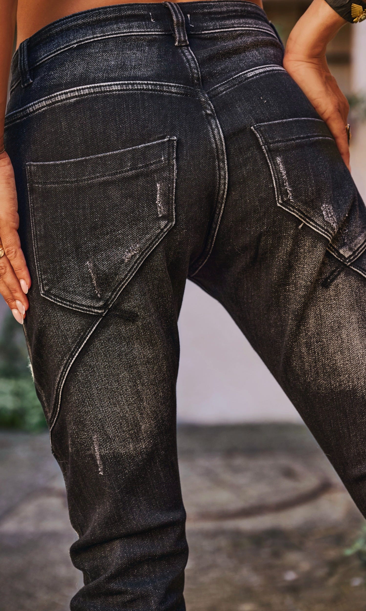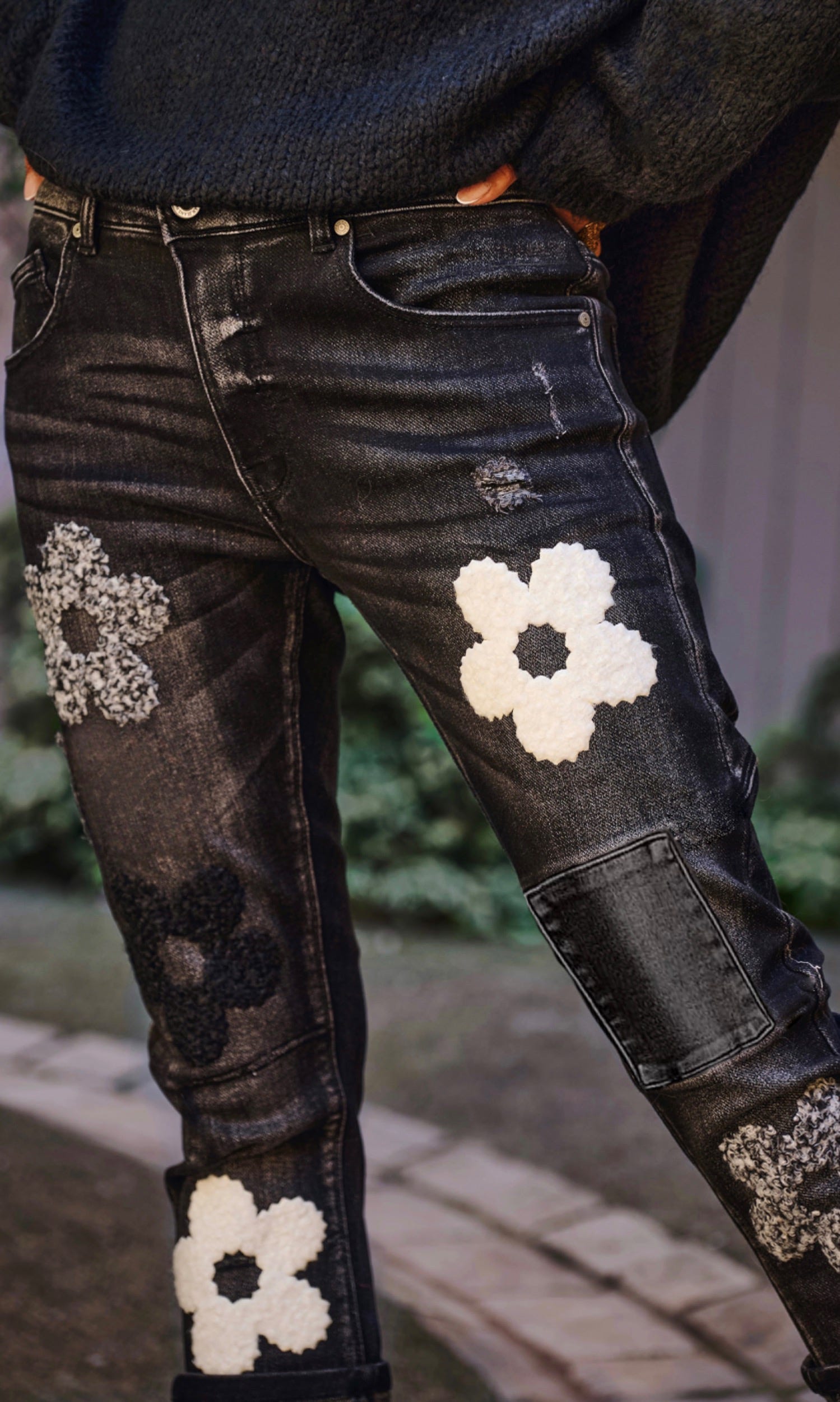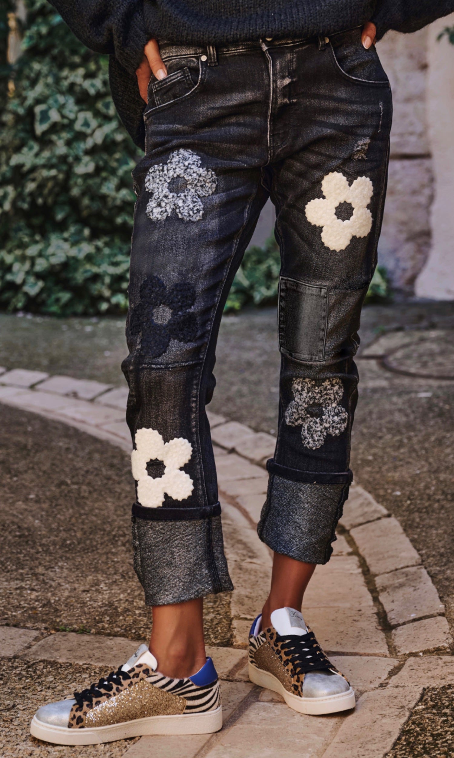 Ce jean noir loose au style décontracté arbore un effet déchiré subtilement ajouré par des patchs.