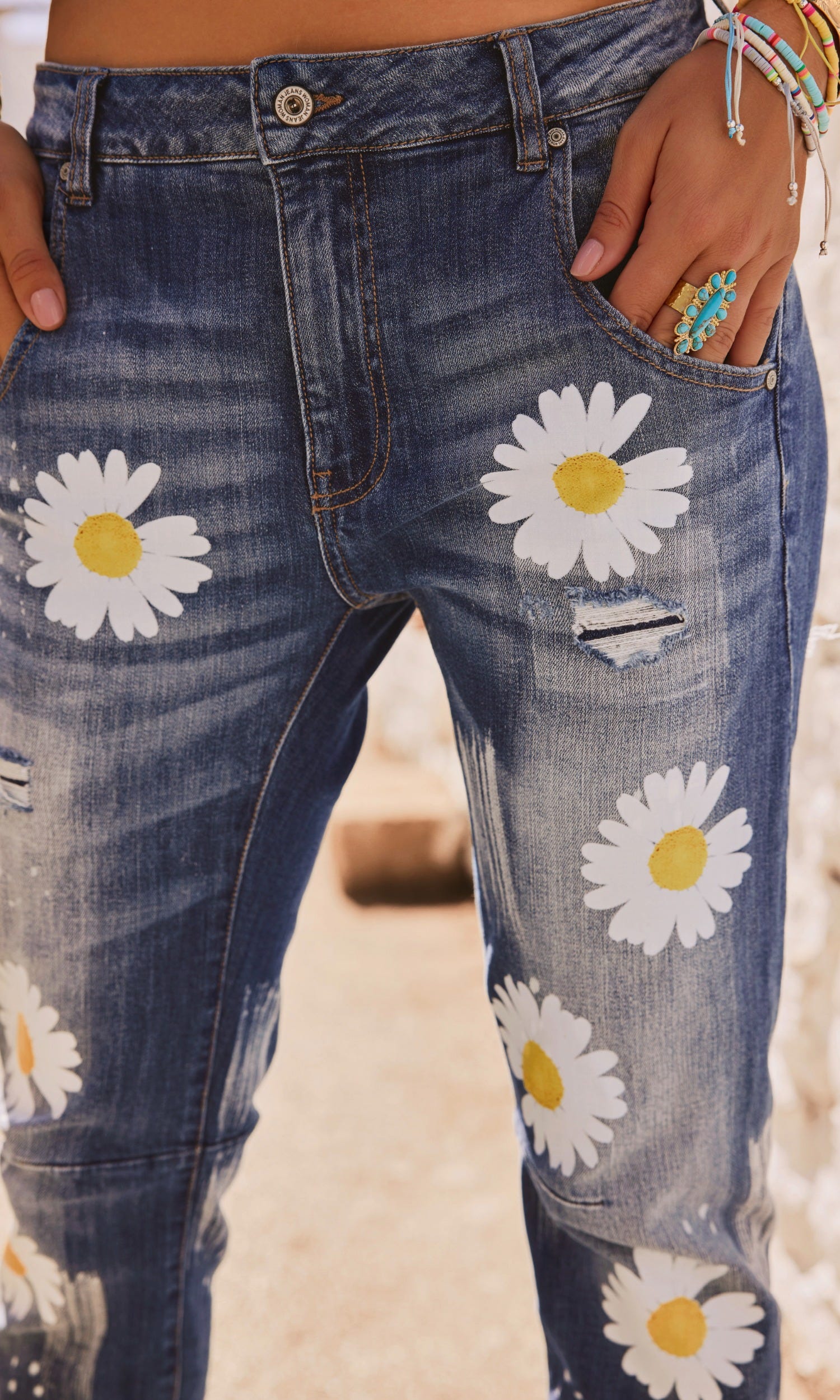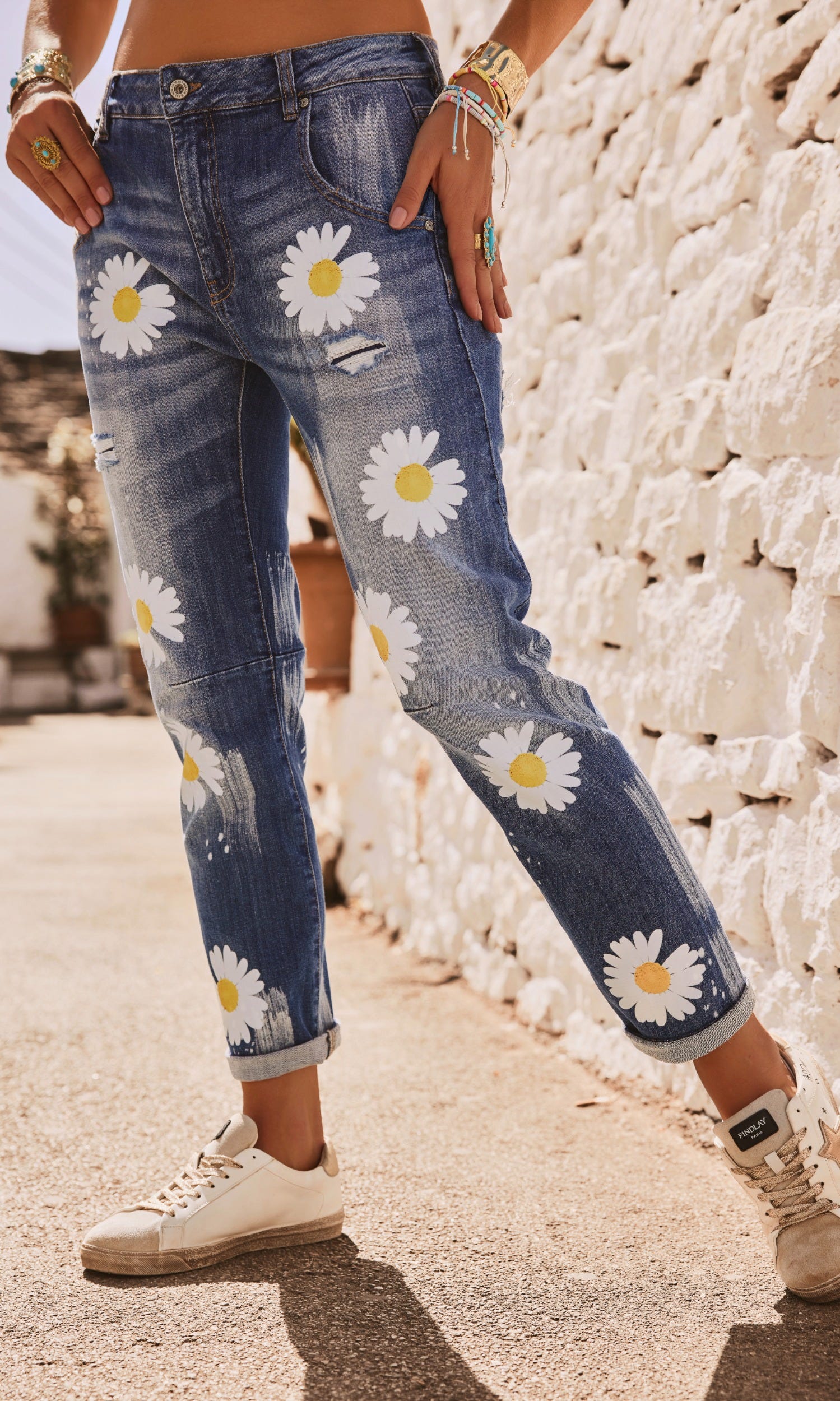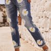Son effet légèrement déchiré et délavé est sublimé par des marguerites floquées, pour un look tendance.