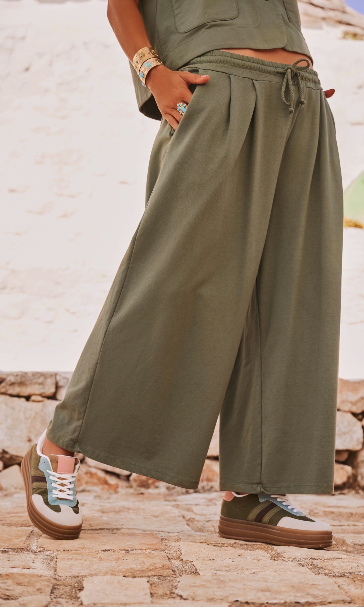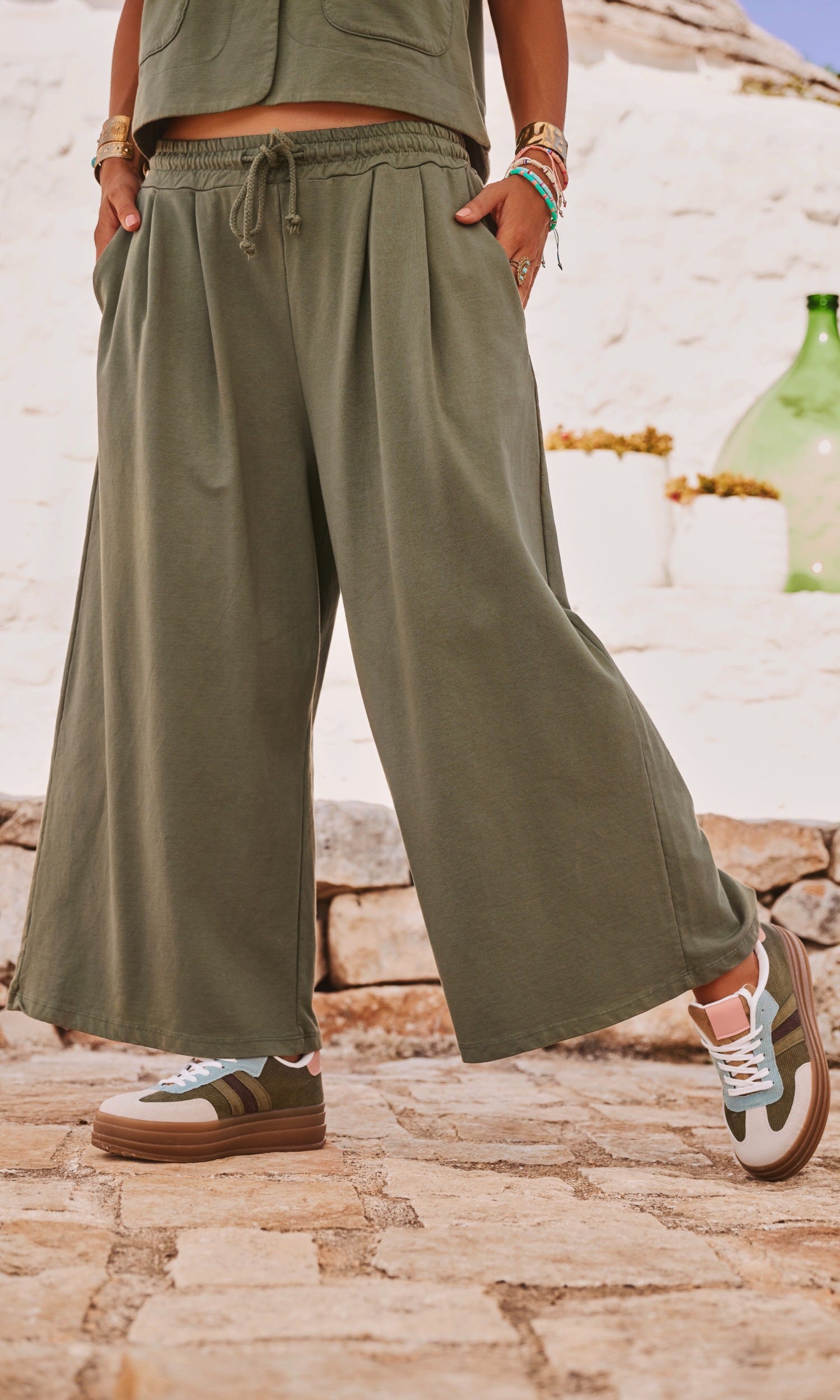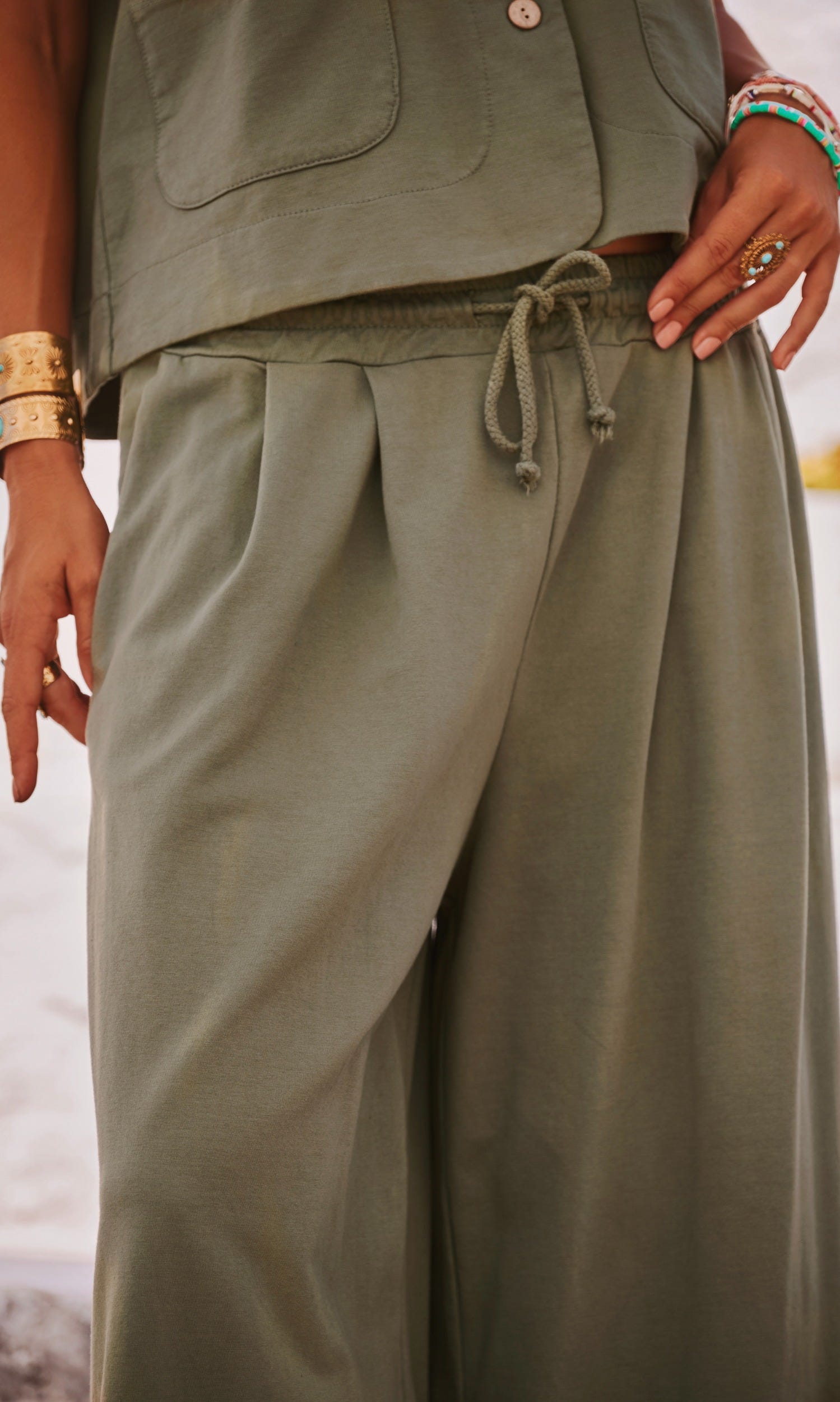Optez pour le confort chic avec ce jogg kaki à jambes larges.