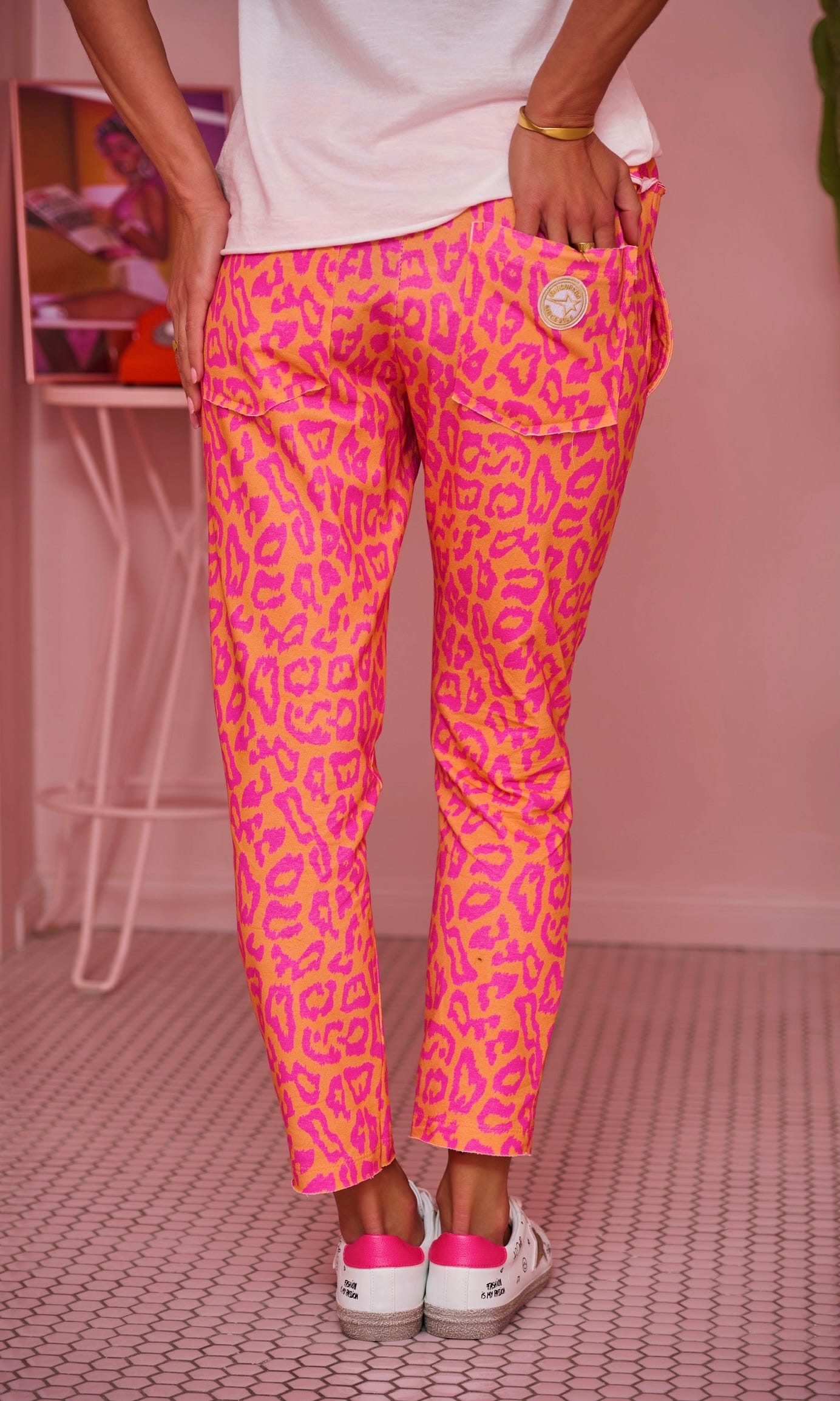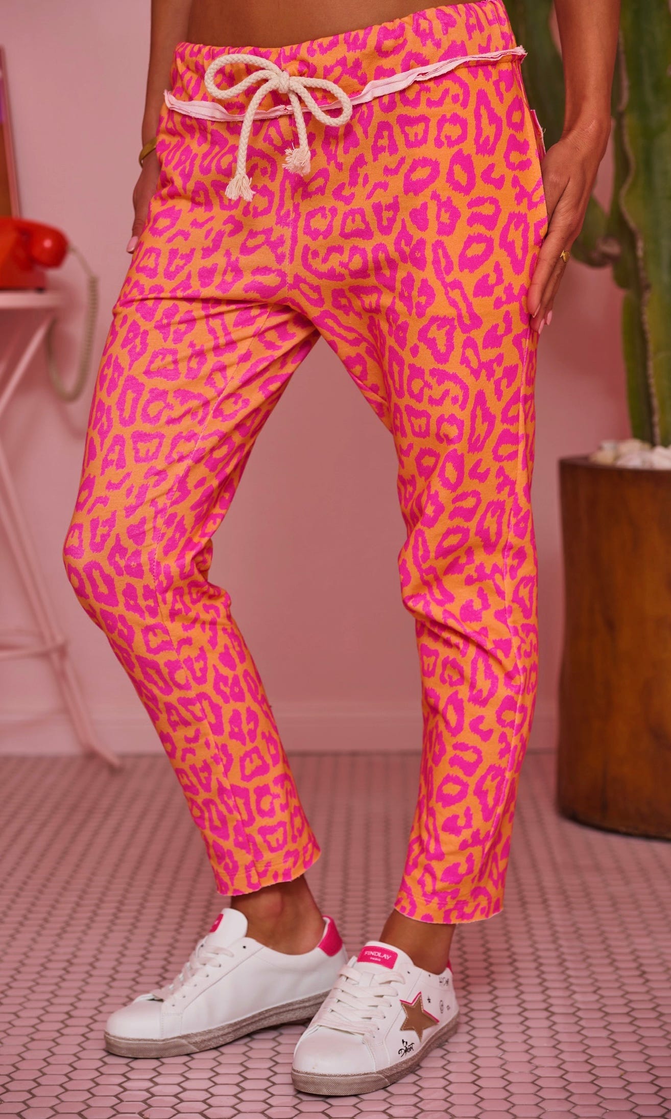 Découvrez notre jogg orange avec un imprimé léopard rose, conçu pour un style décontracté.