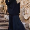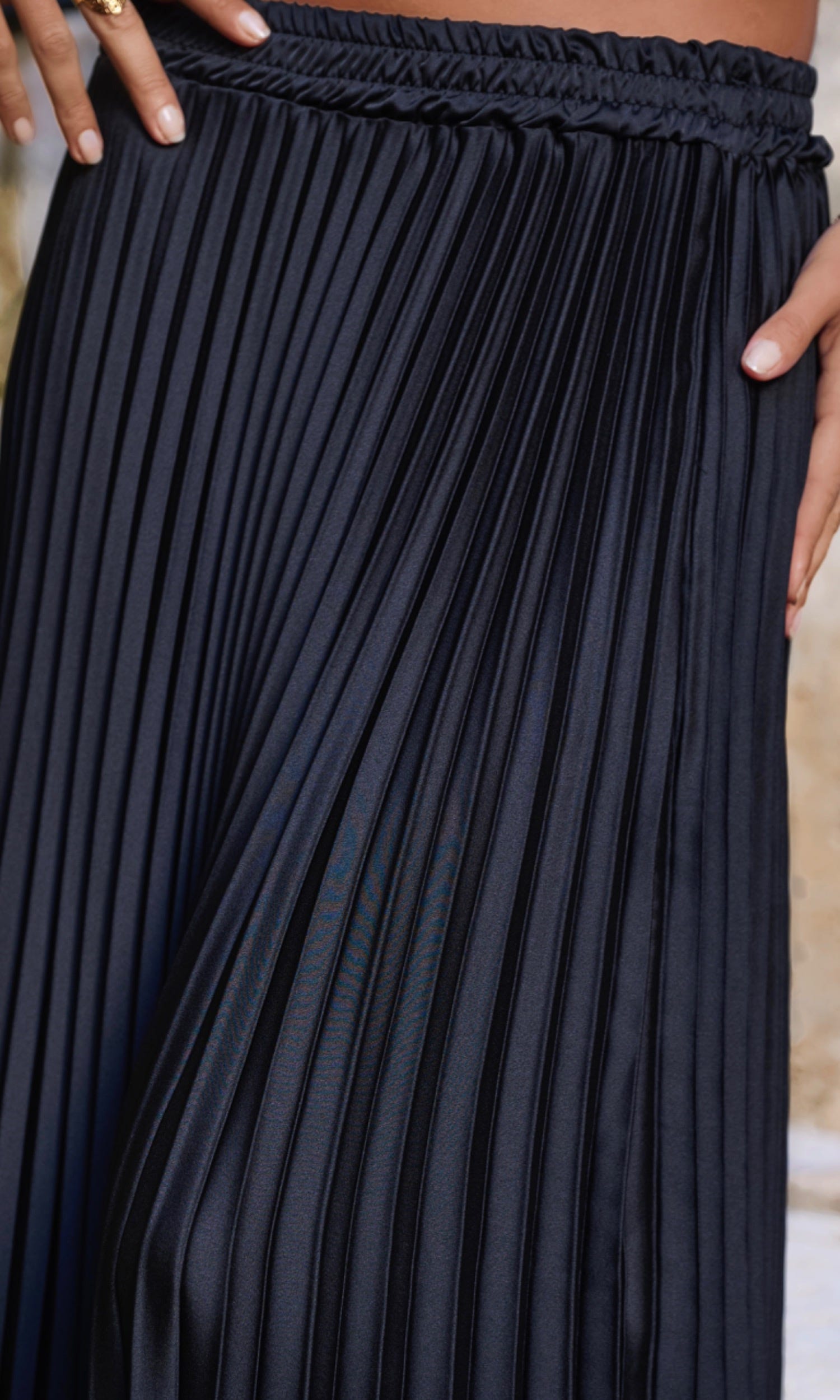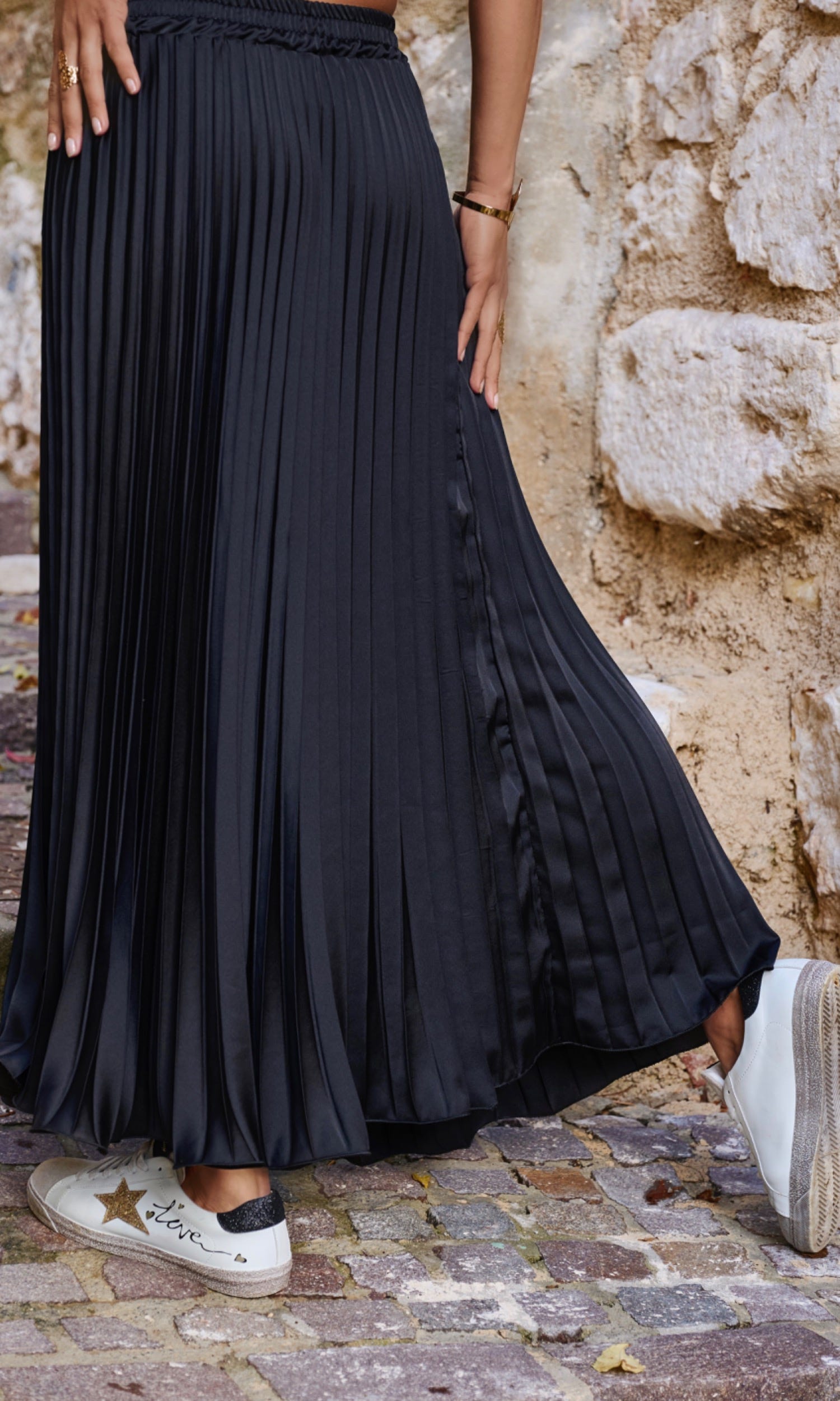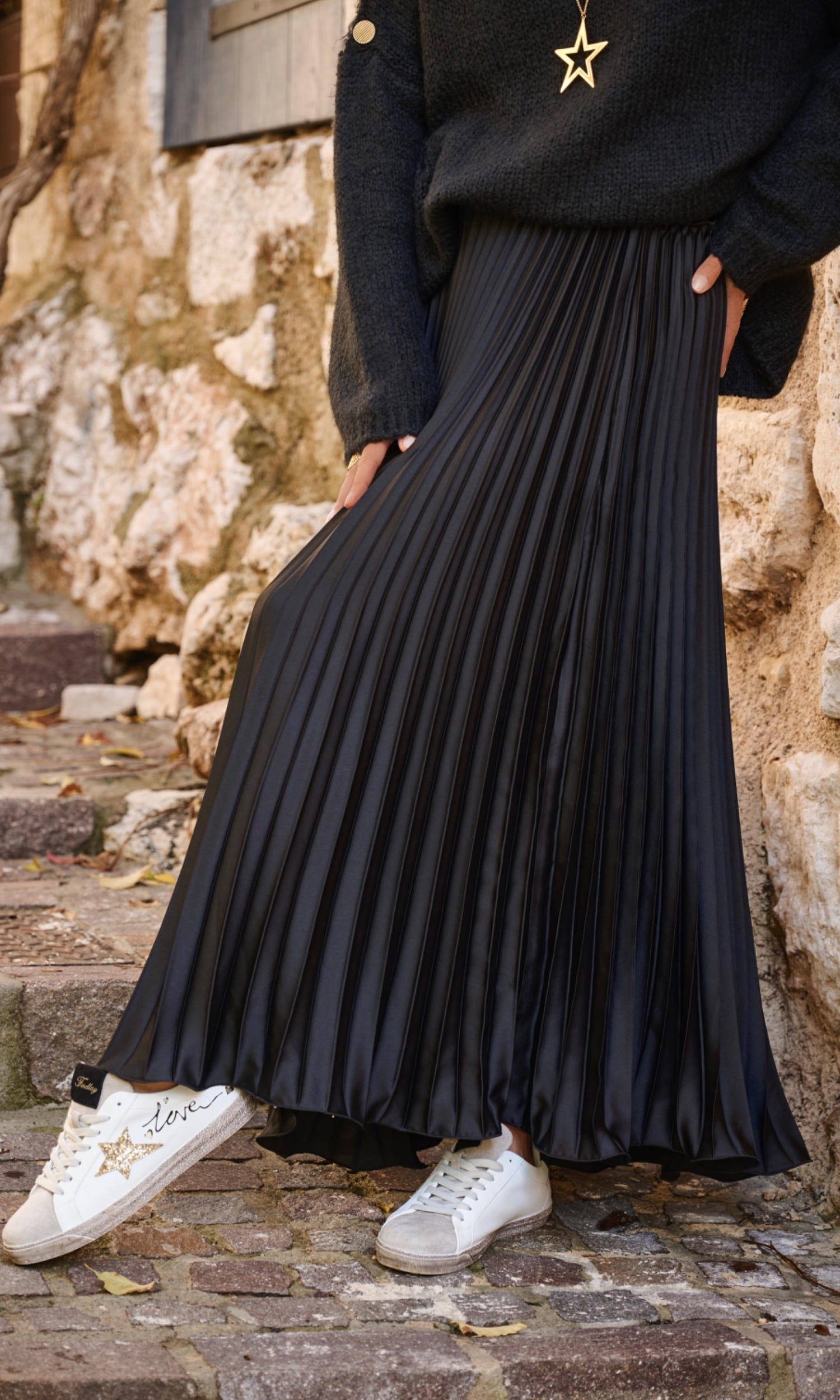 Découvrez notre jupe noir plissée fluide, à la coupe évasée féminine et en forme godet en partie basse.