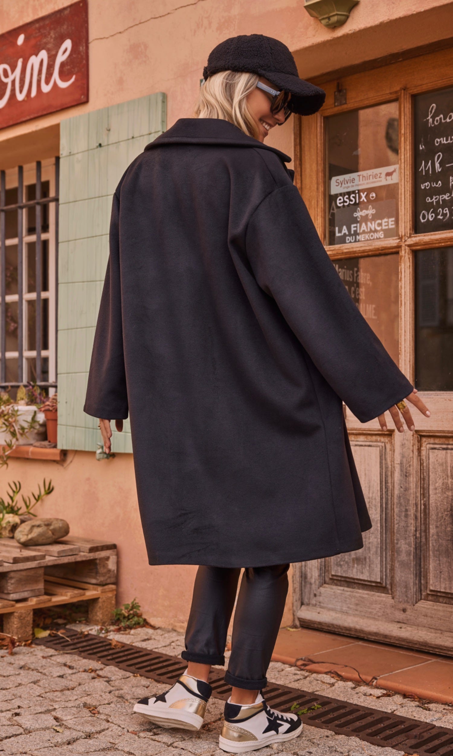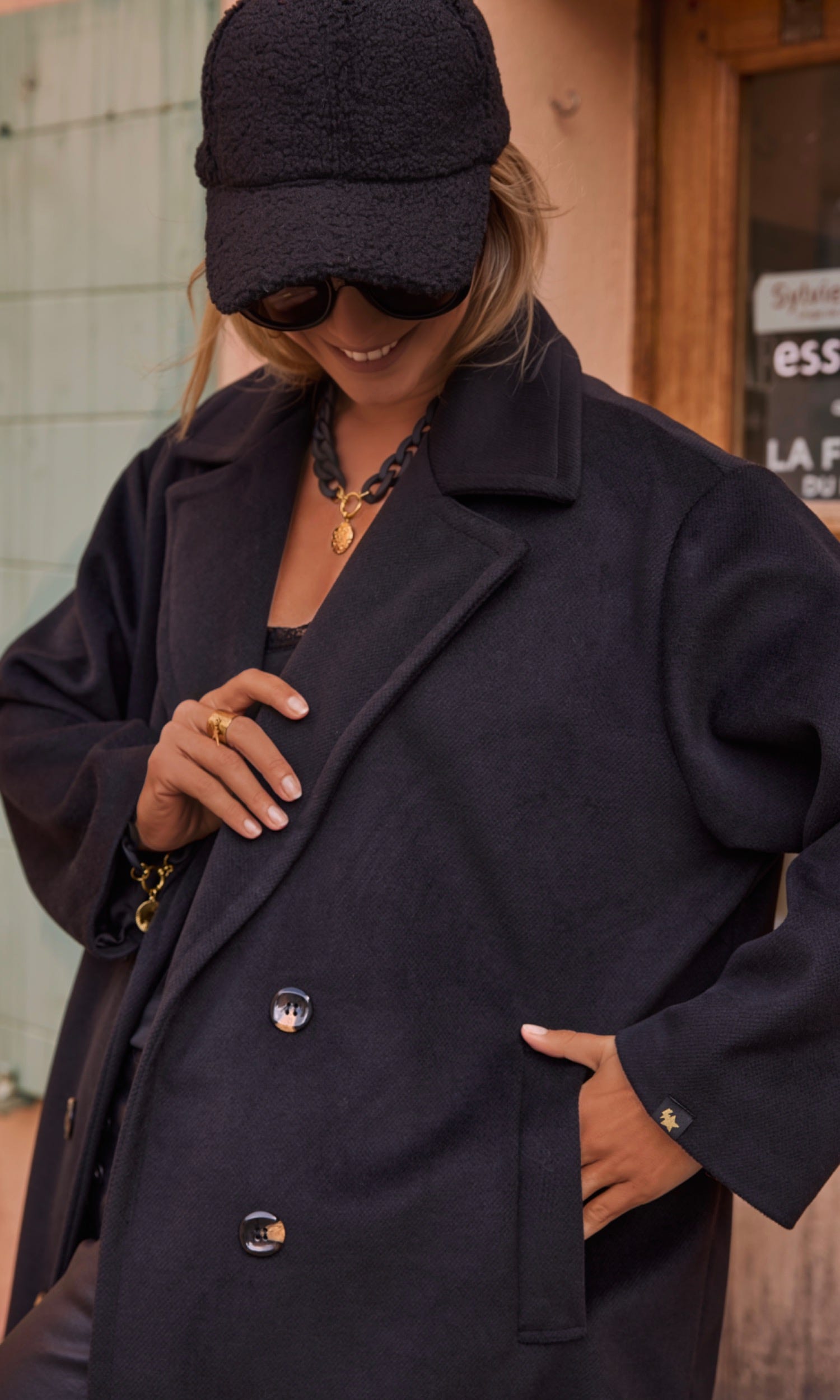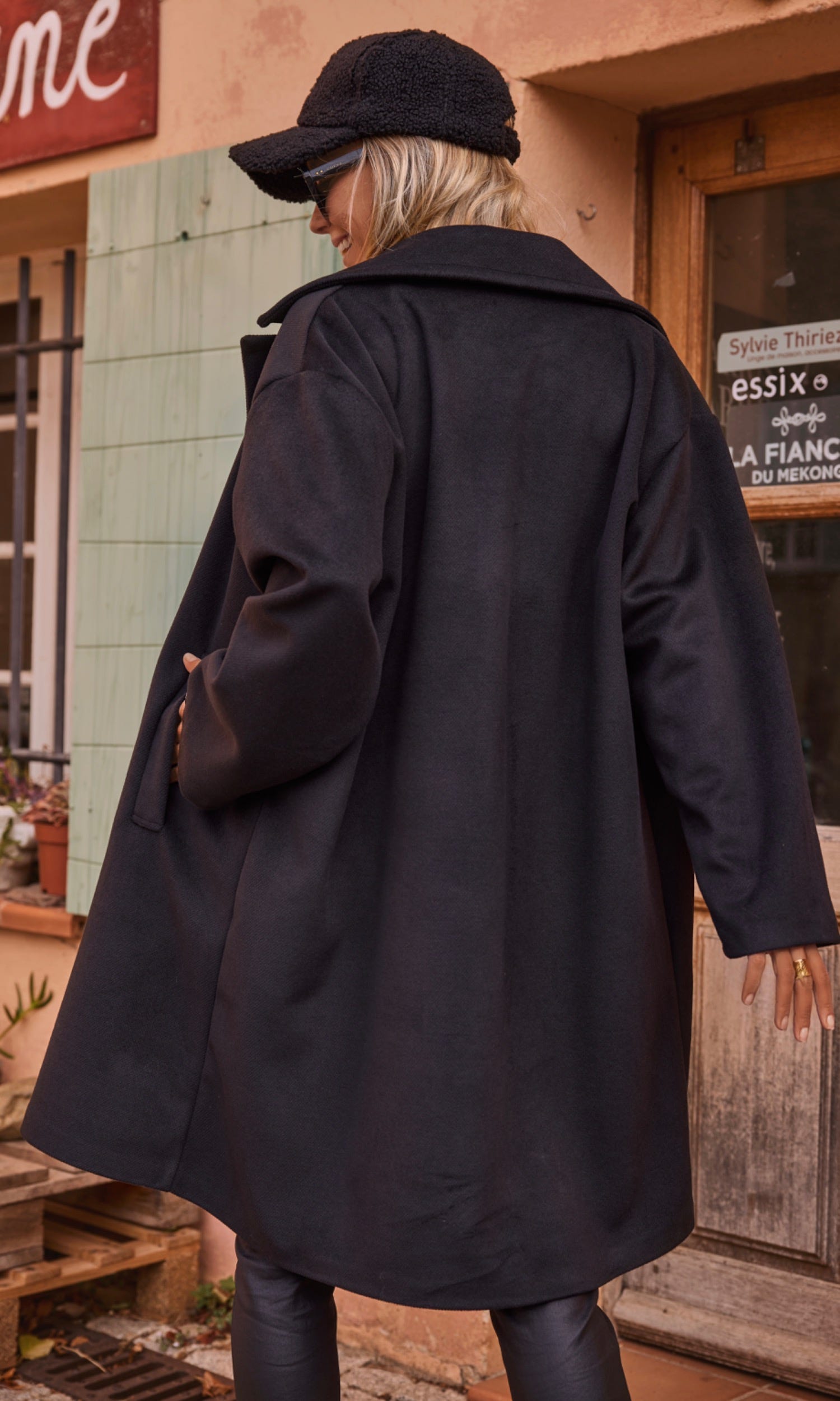 Découvrez notre manteau noir oversize au grand col blazer, à manches longues dont une arbore une étiquette Star Flash.