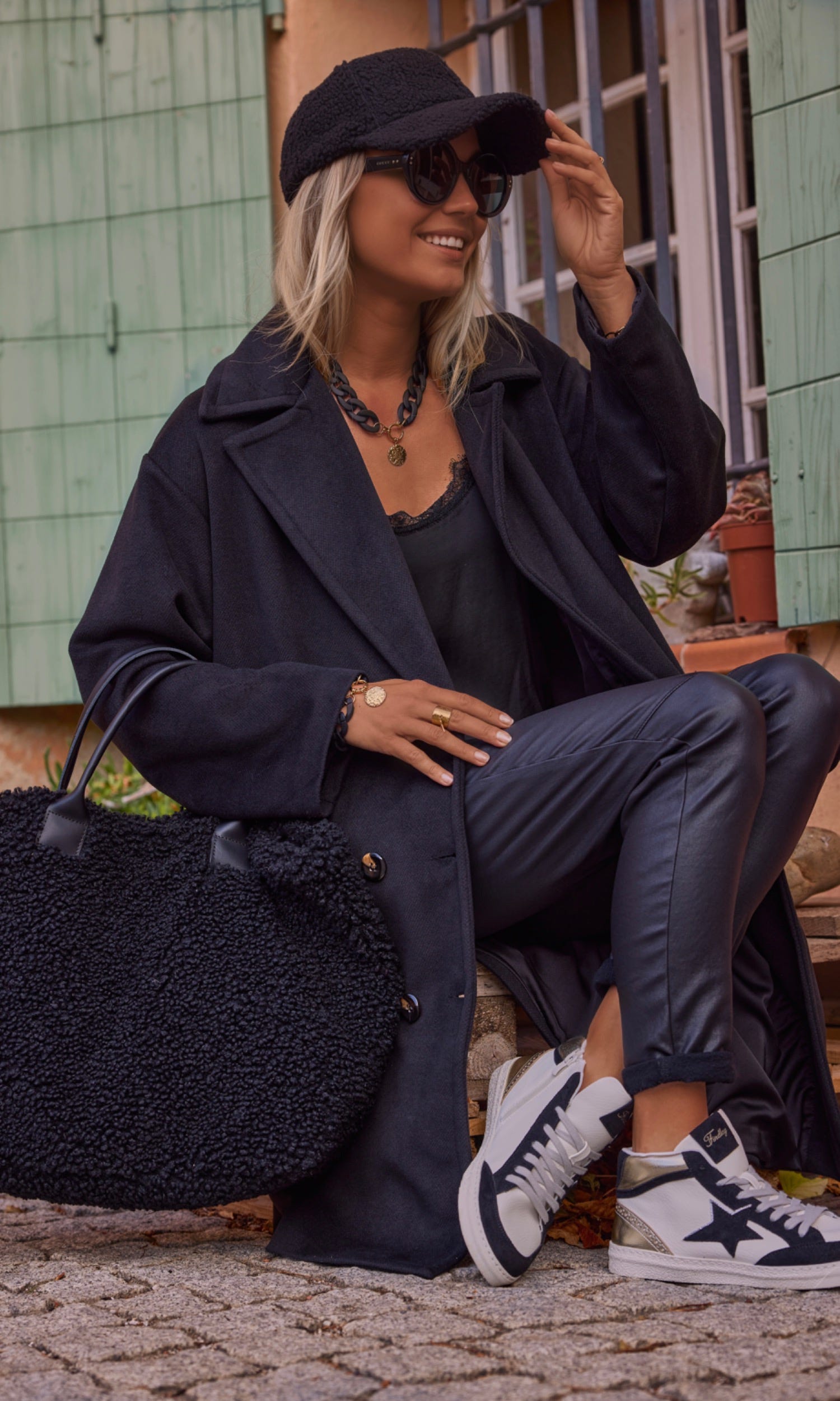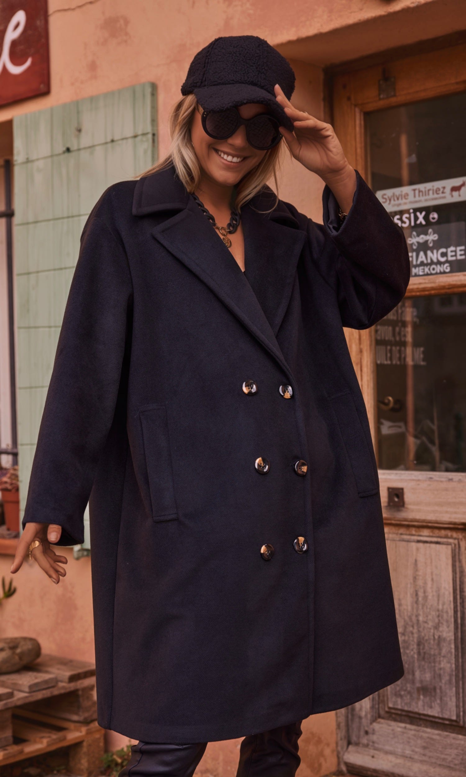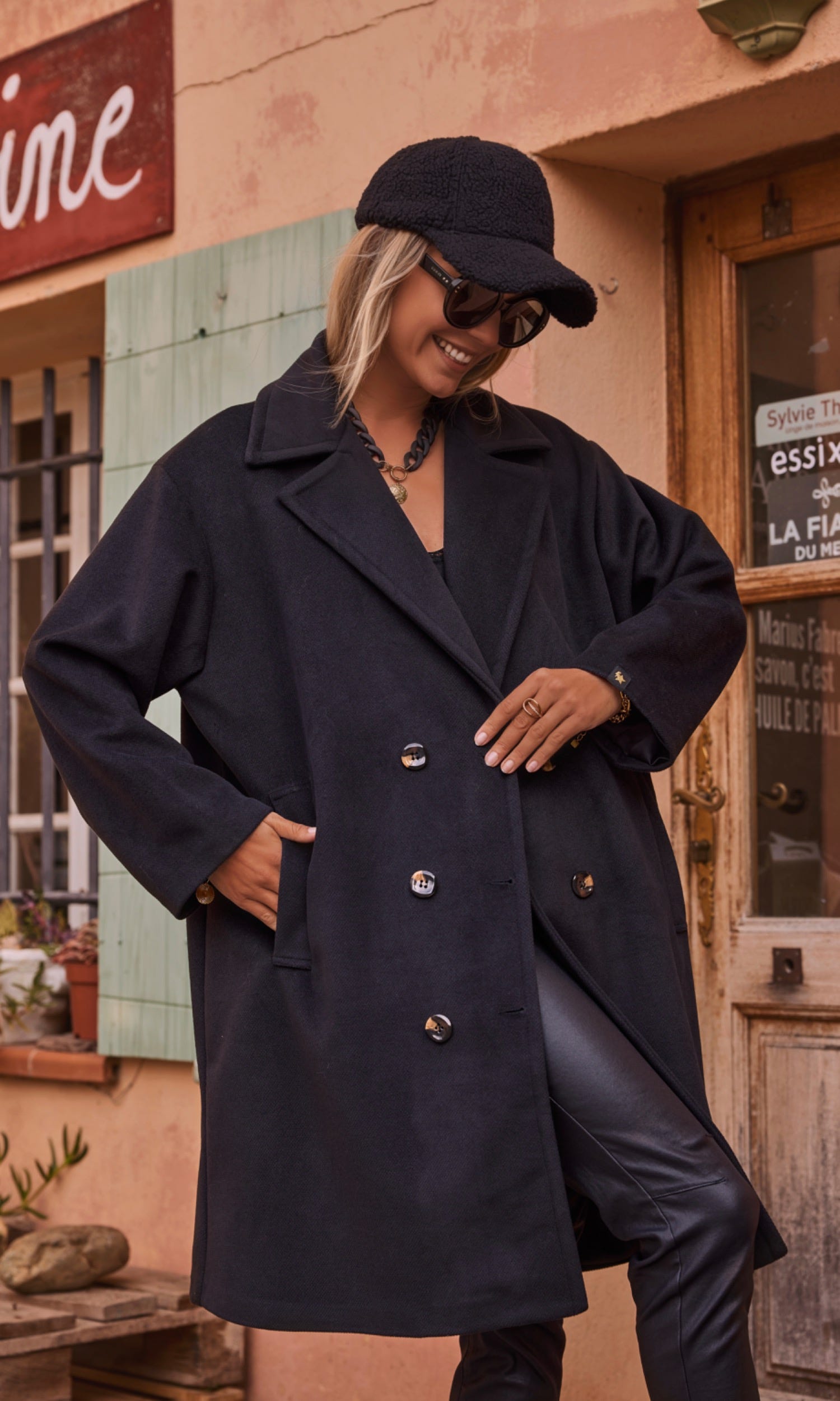 Découvrez notre manteau noir oversize au grand col blazer, à manches longues dont une arbore une étiquette Star Flash.