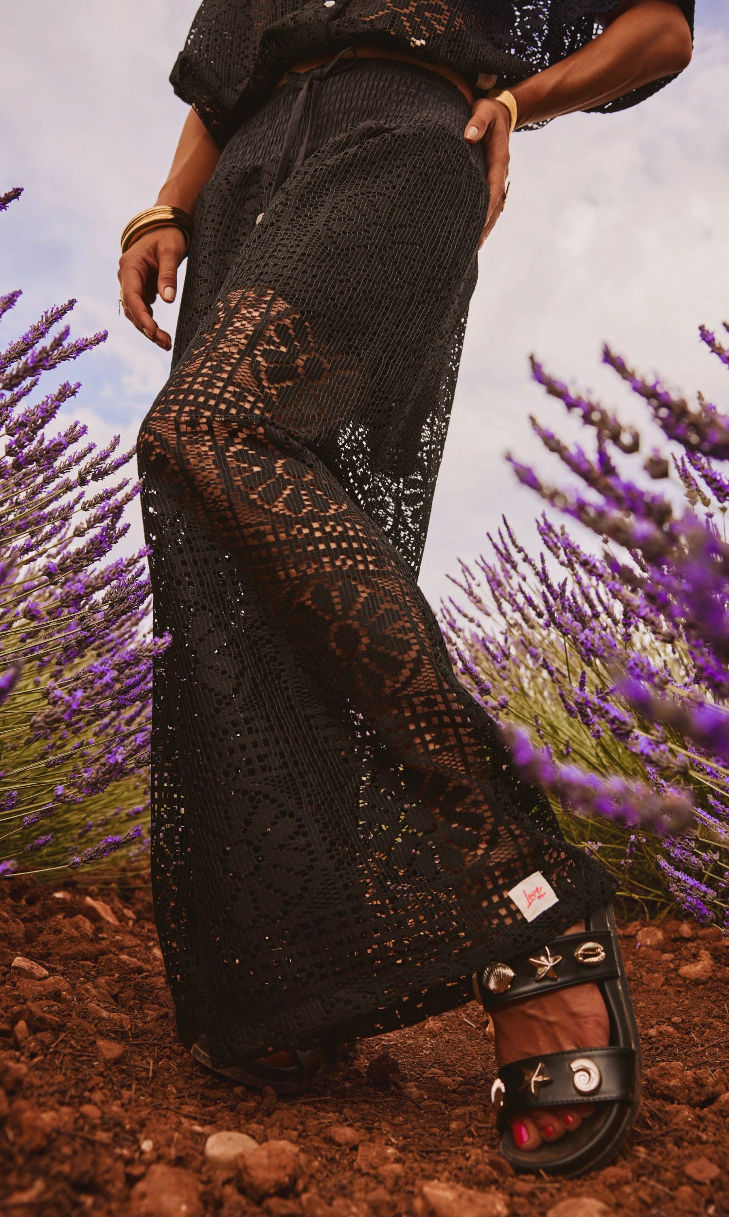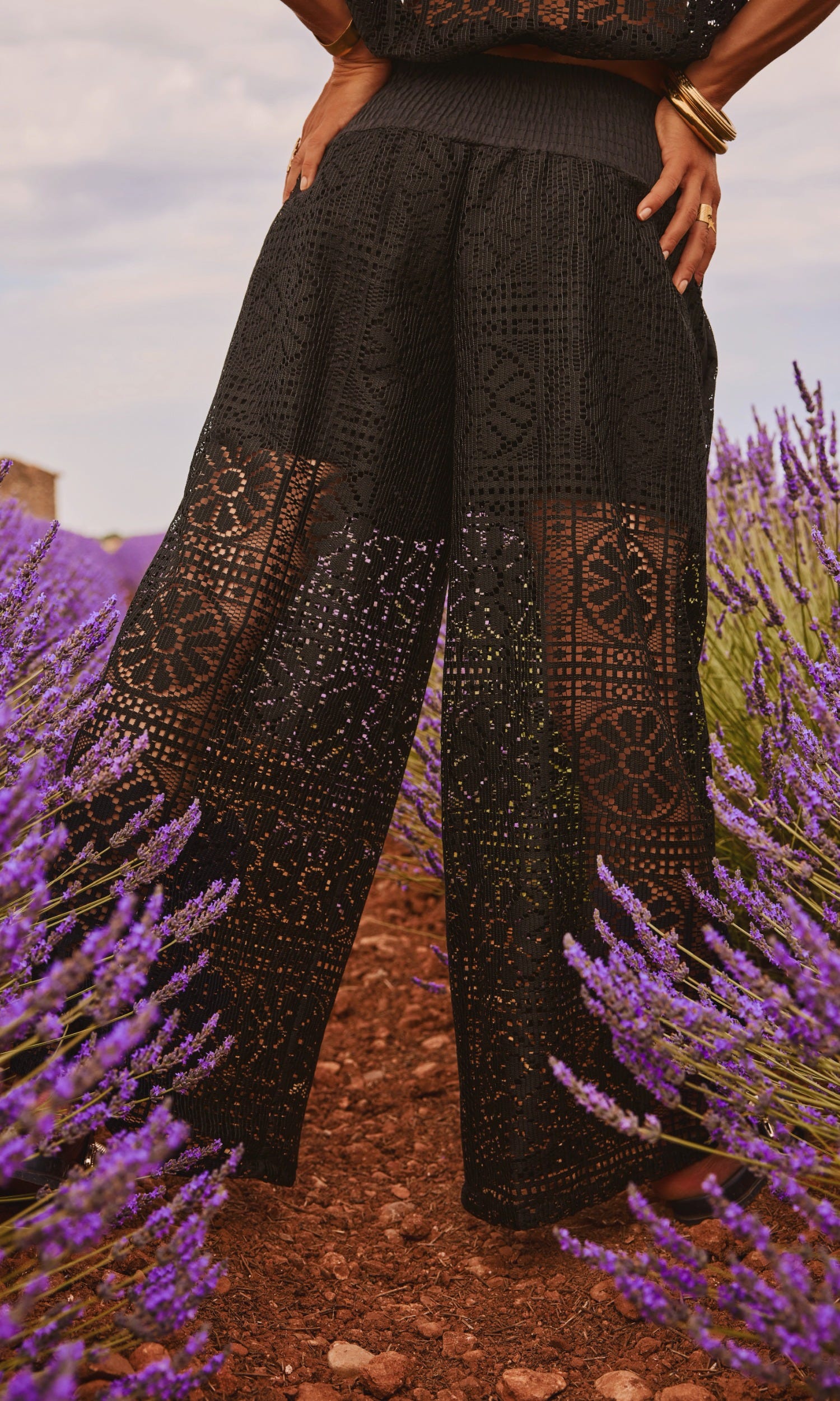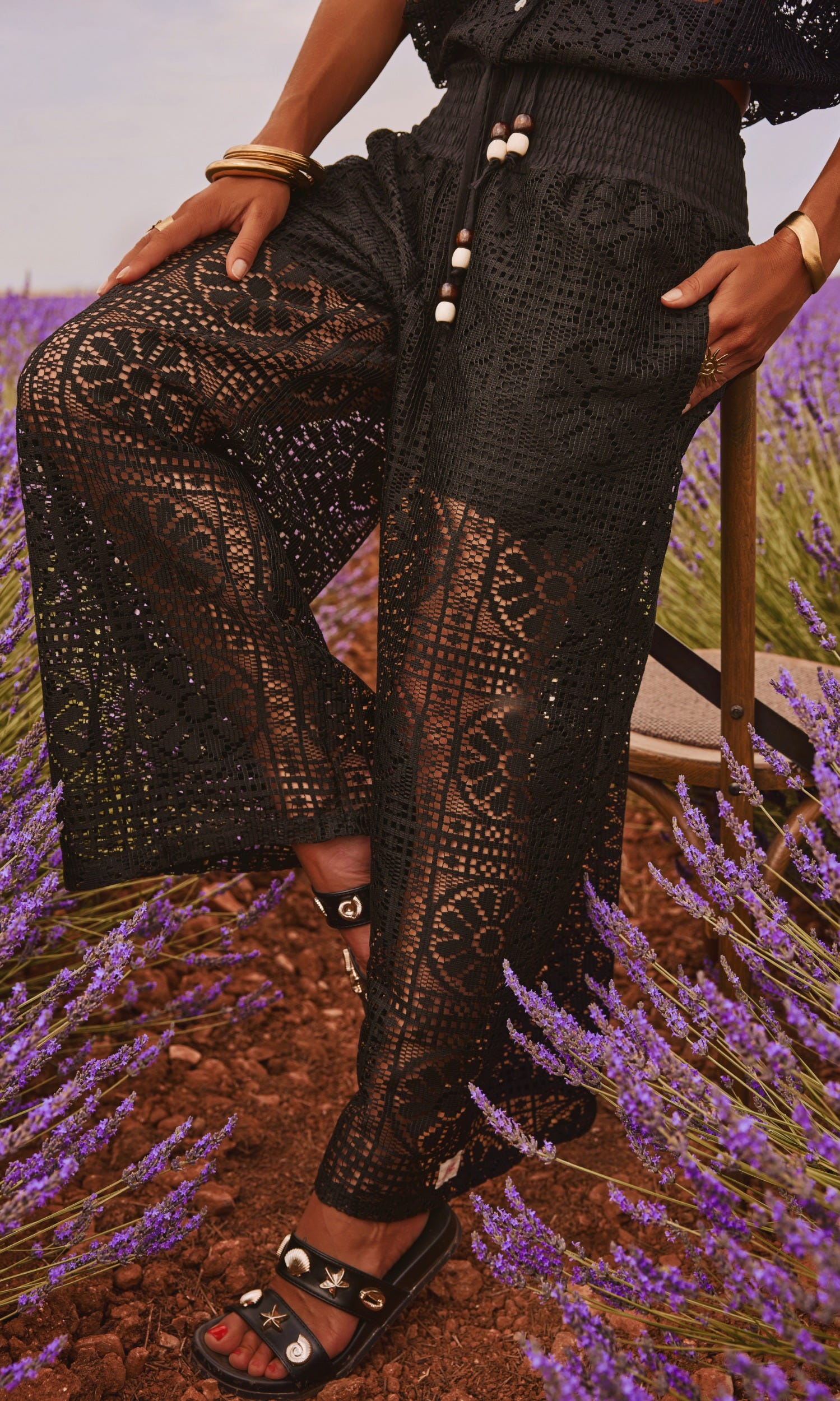 Découvrez notre pantalon noir en résille, fluide et léger, idéal pour sublimer vos tenues.