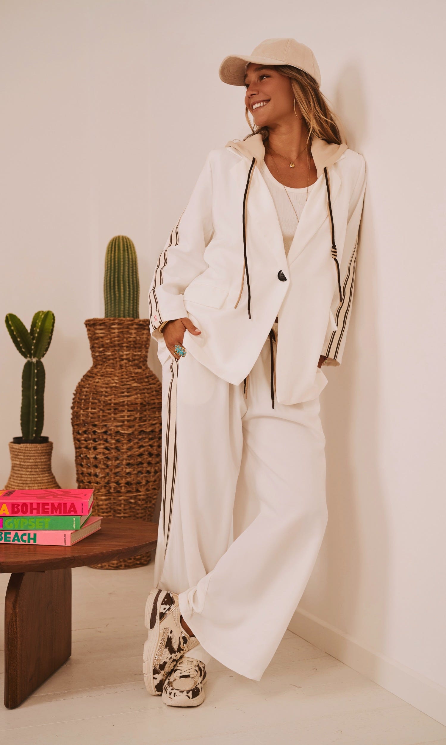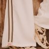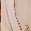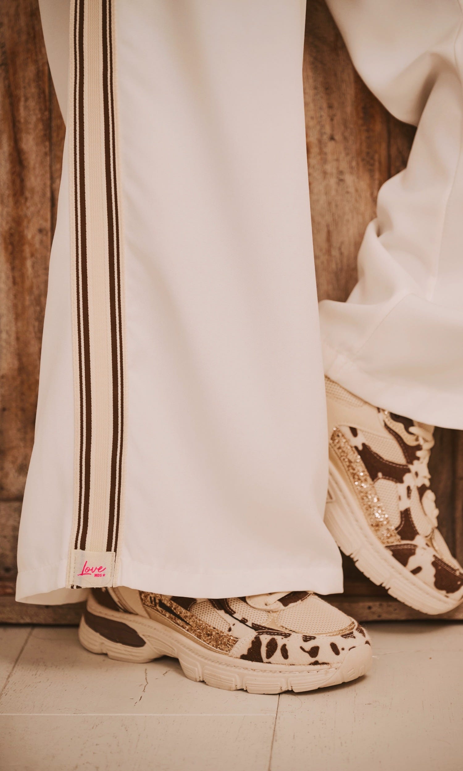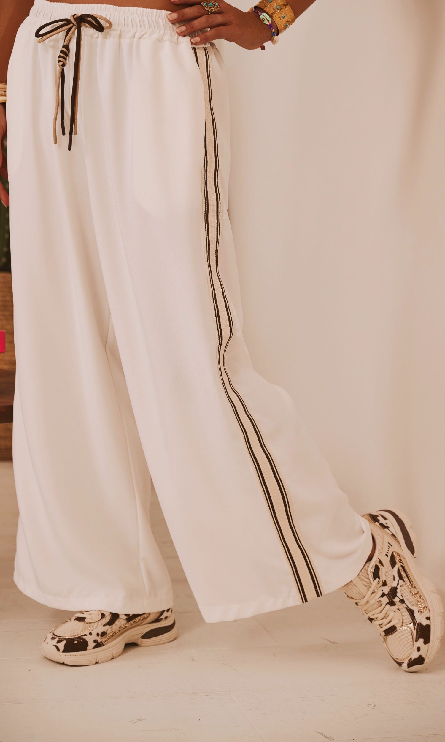 Doté de deux poches latérales pratiques, ce modèle aux jambes larges se distingue par une bande décorative en surpiqûre sur les côtés, alliant élégance et tendance.