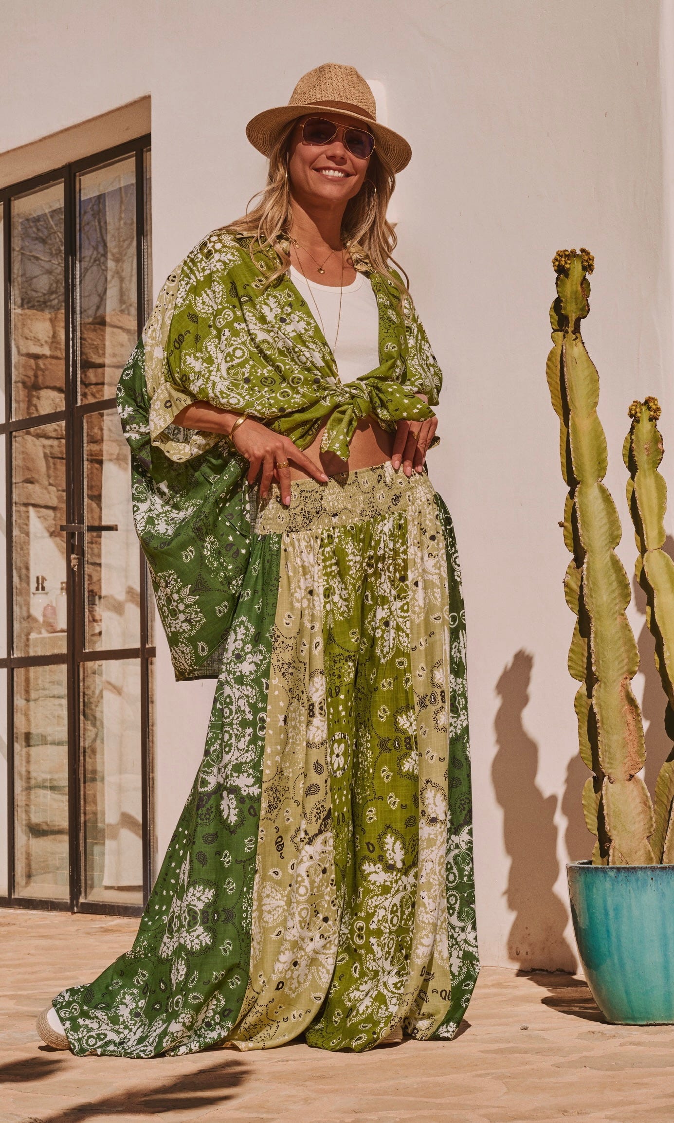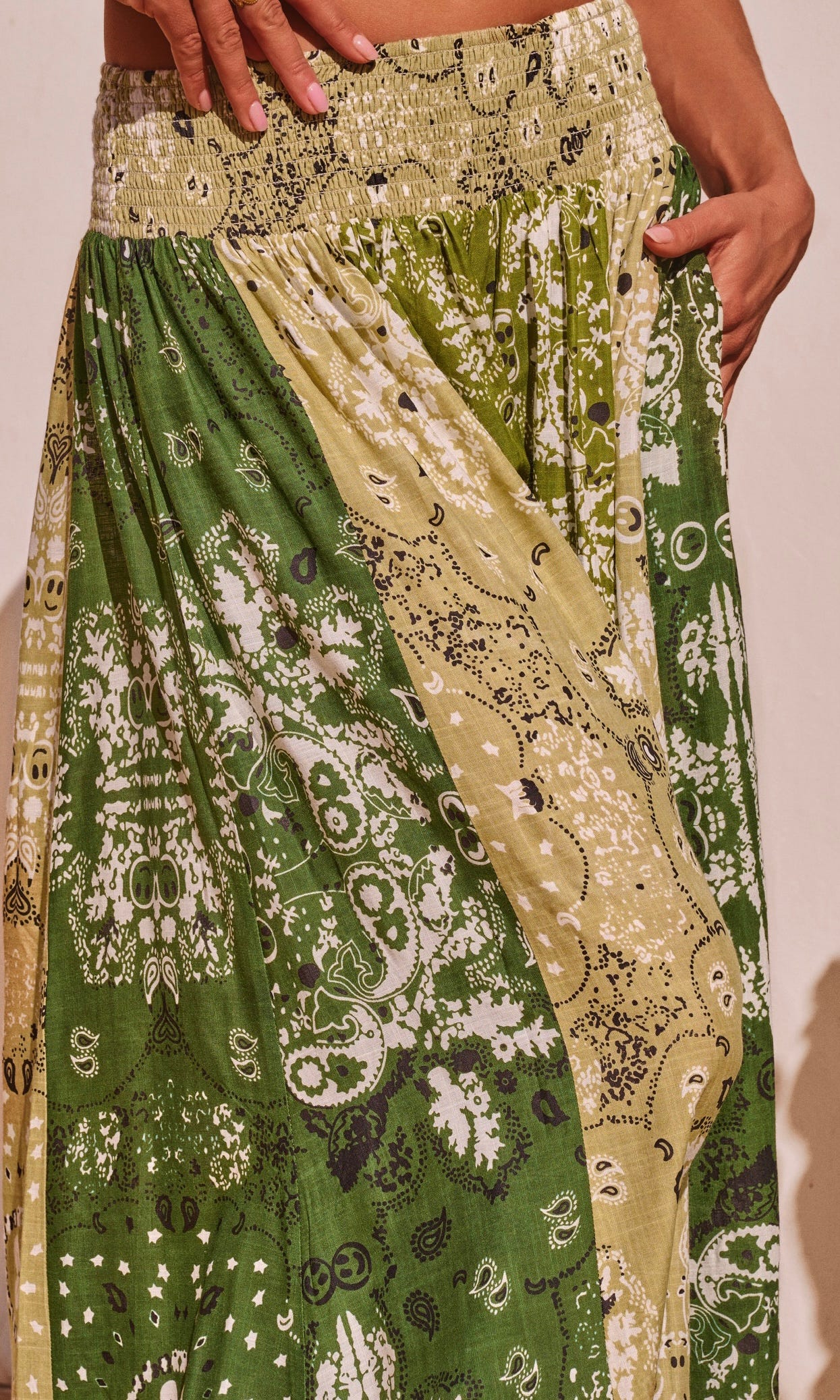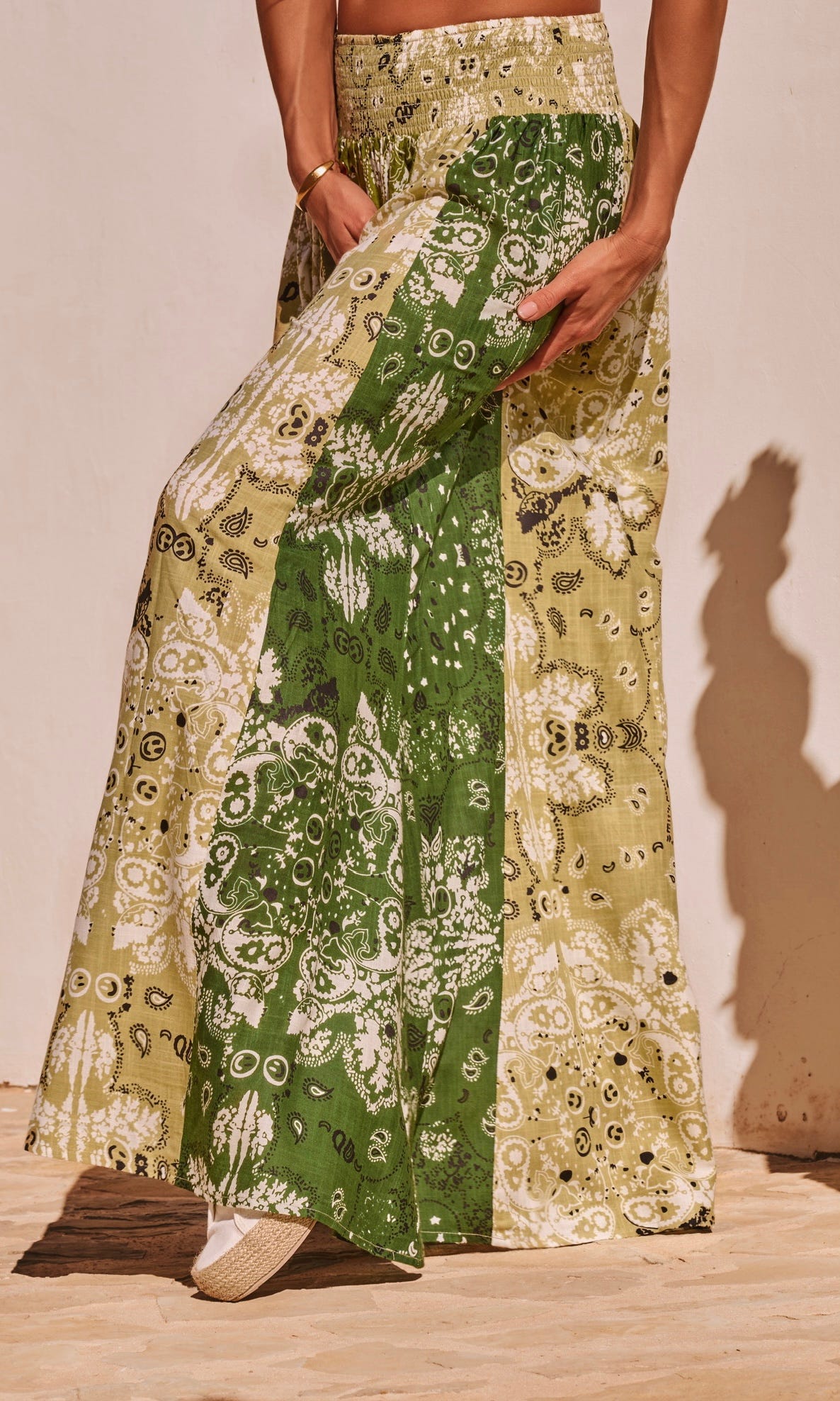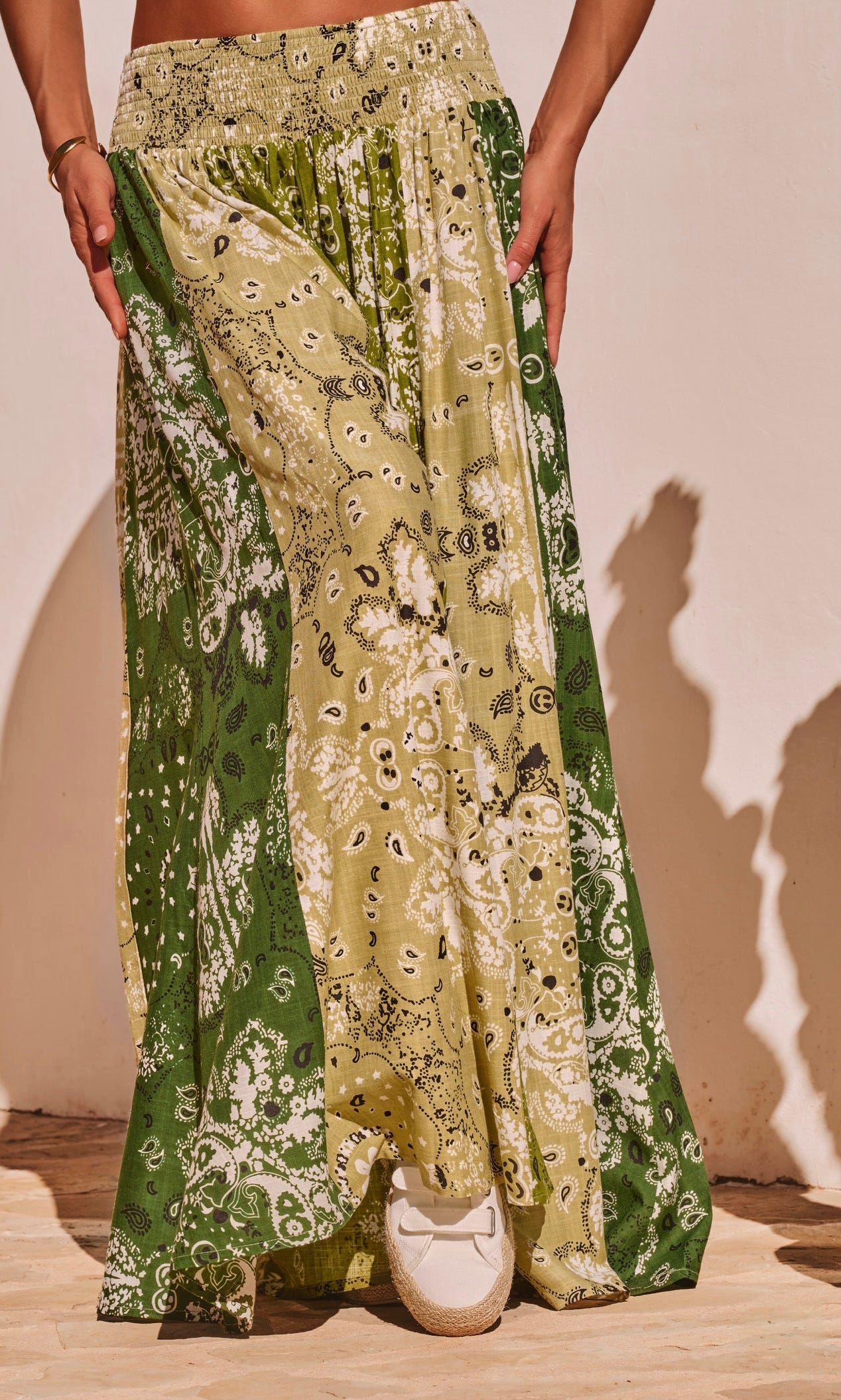 Découvrez ce pantalon jupe-culotte vert à l'imprimé bandana, fluide et léger à porter.Sa taille élastiquée smockée offre un confort optimal, tandis que les jambes larges assurent liberté de mouvement et style, tout en donnant l'effet d'une jupe.Parfait pour ajouter une touche tendance à votre garde-robe tout en restant à l'aise au quotidien.