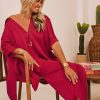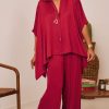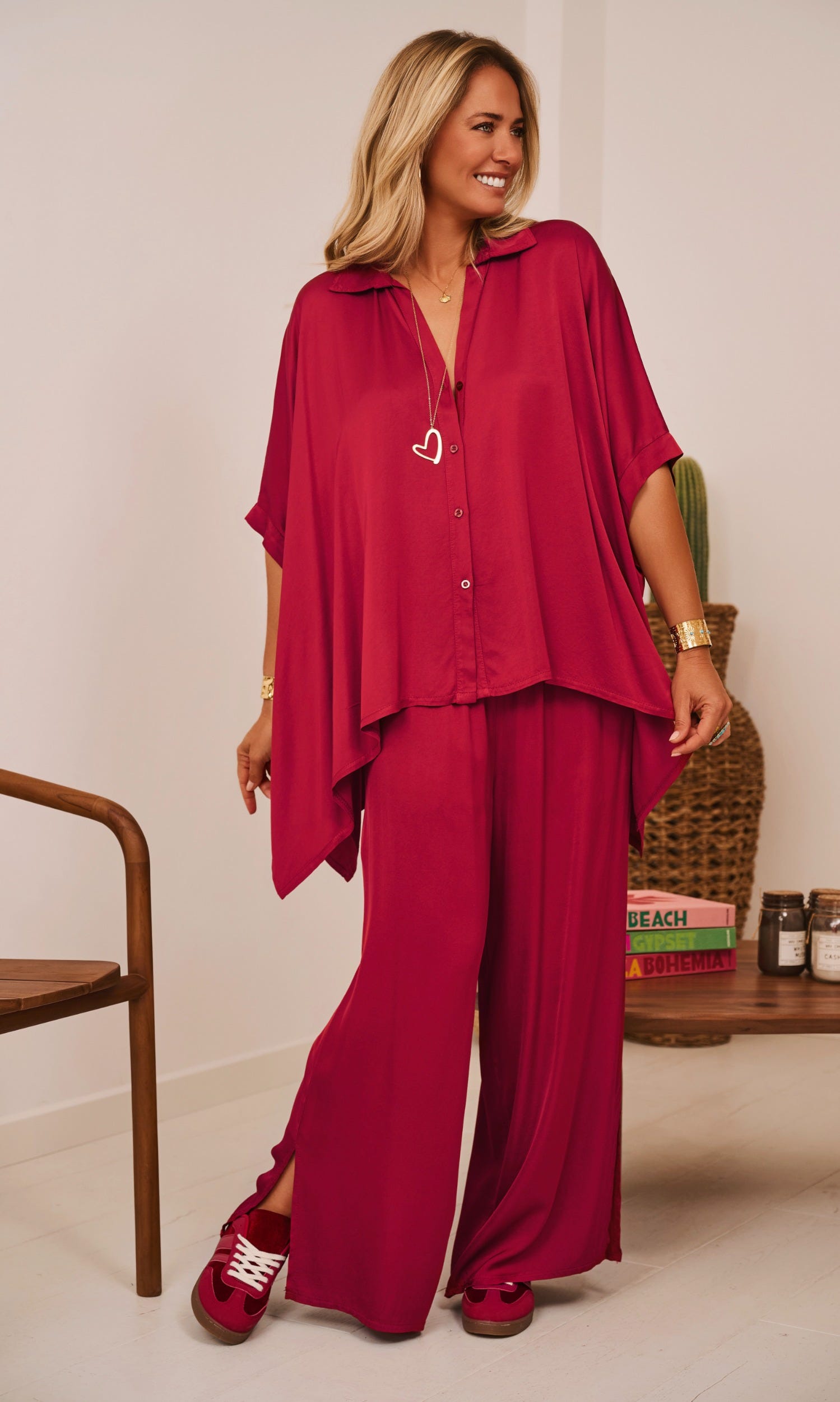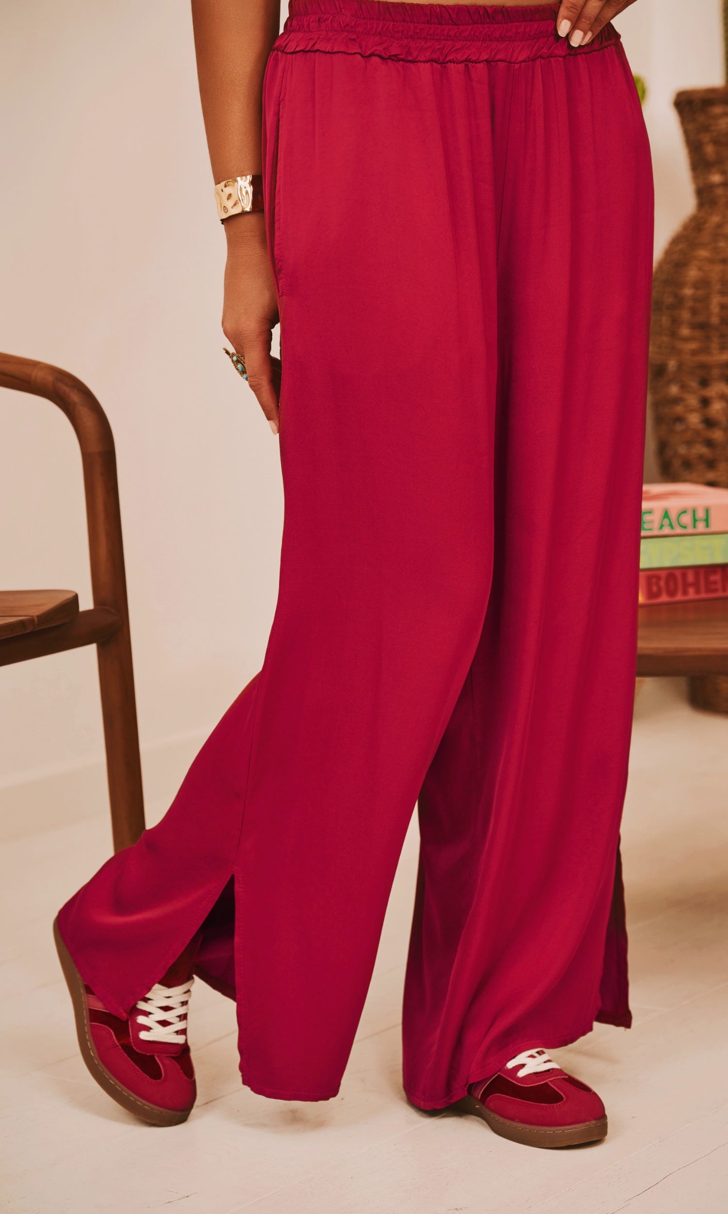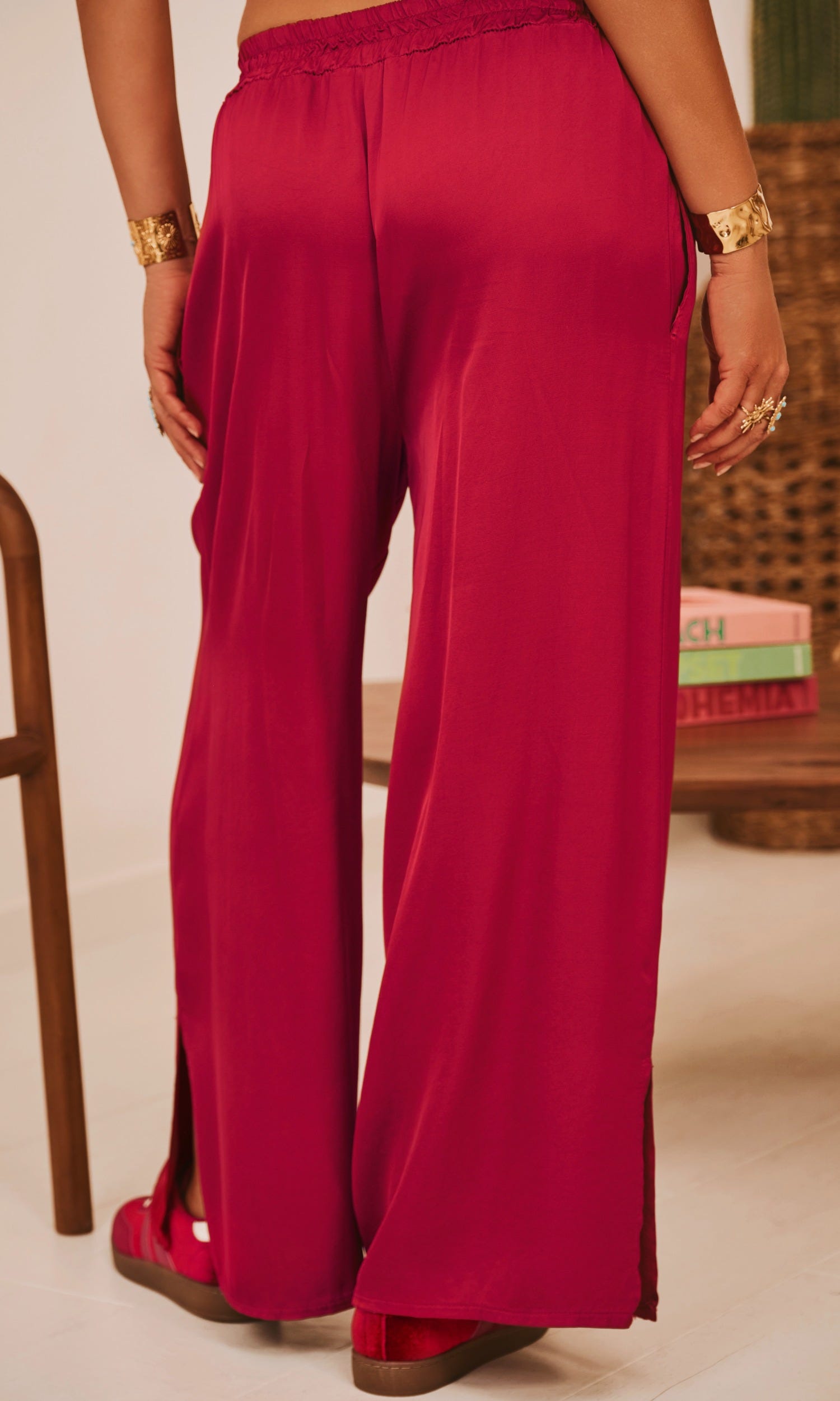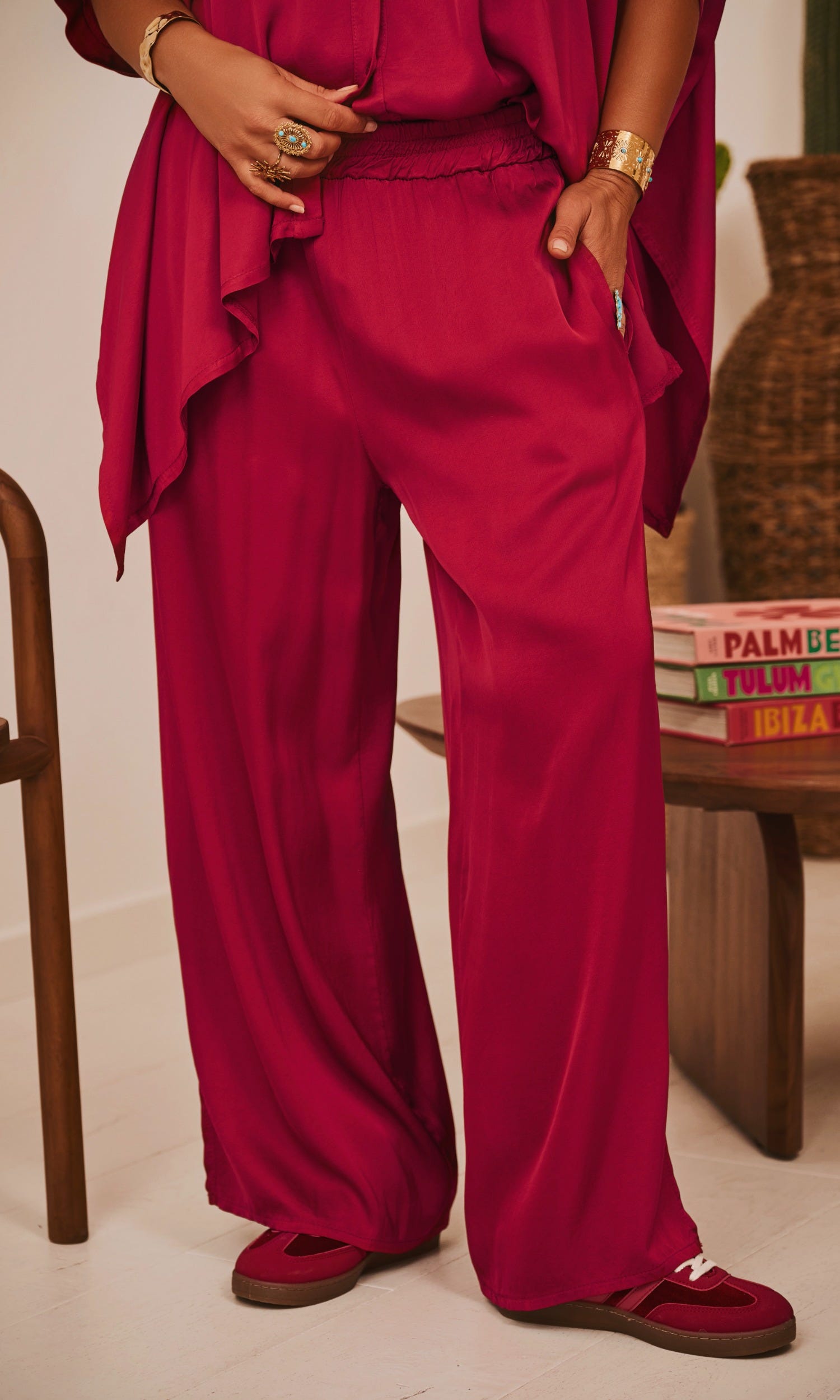 Adoptez l'élégance avec ce pantalon effet satin bordeaux.
