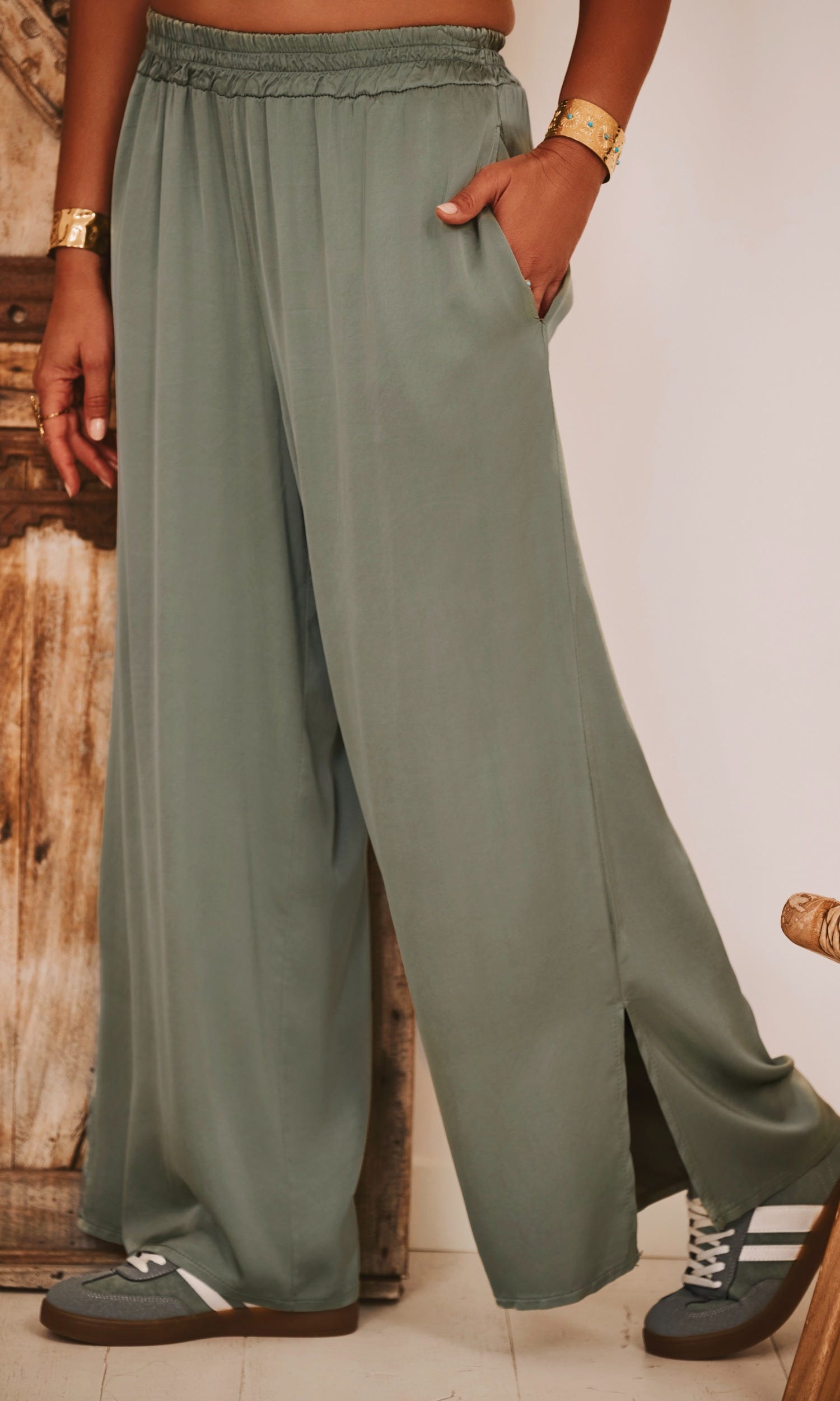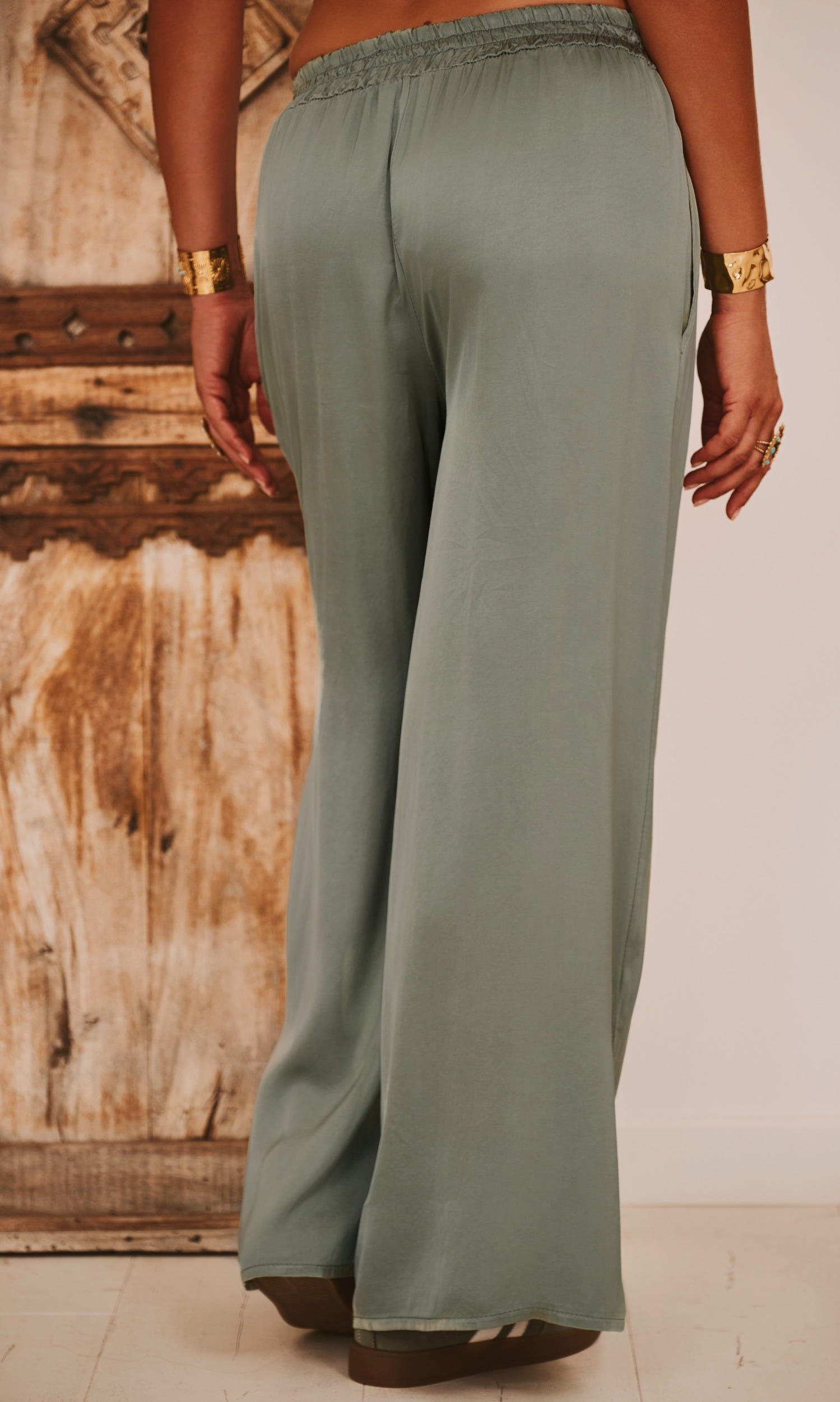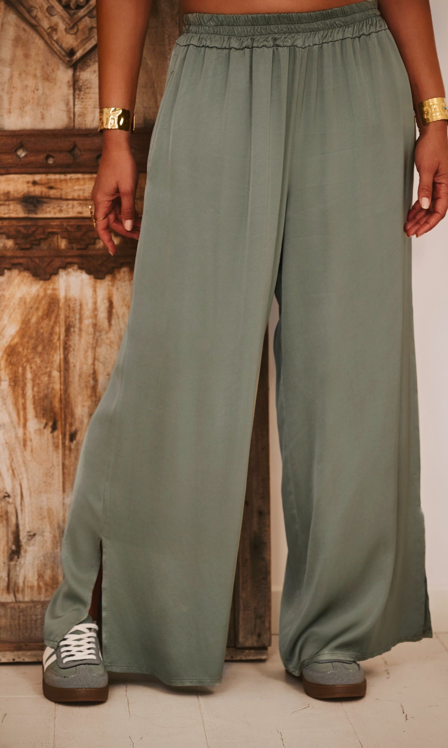 Découvrez notre pantalon effet satin kaki, fluide et léger, parfait pour un look élégant tout en confort.