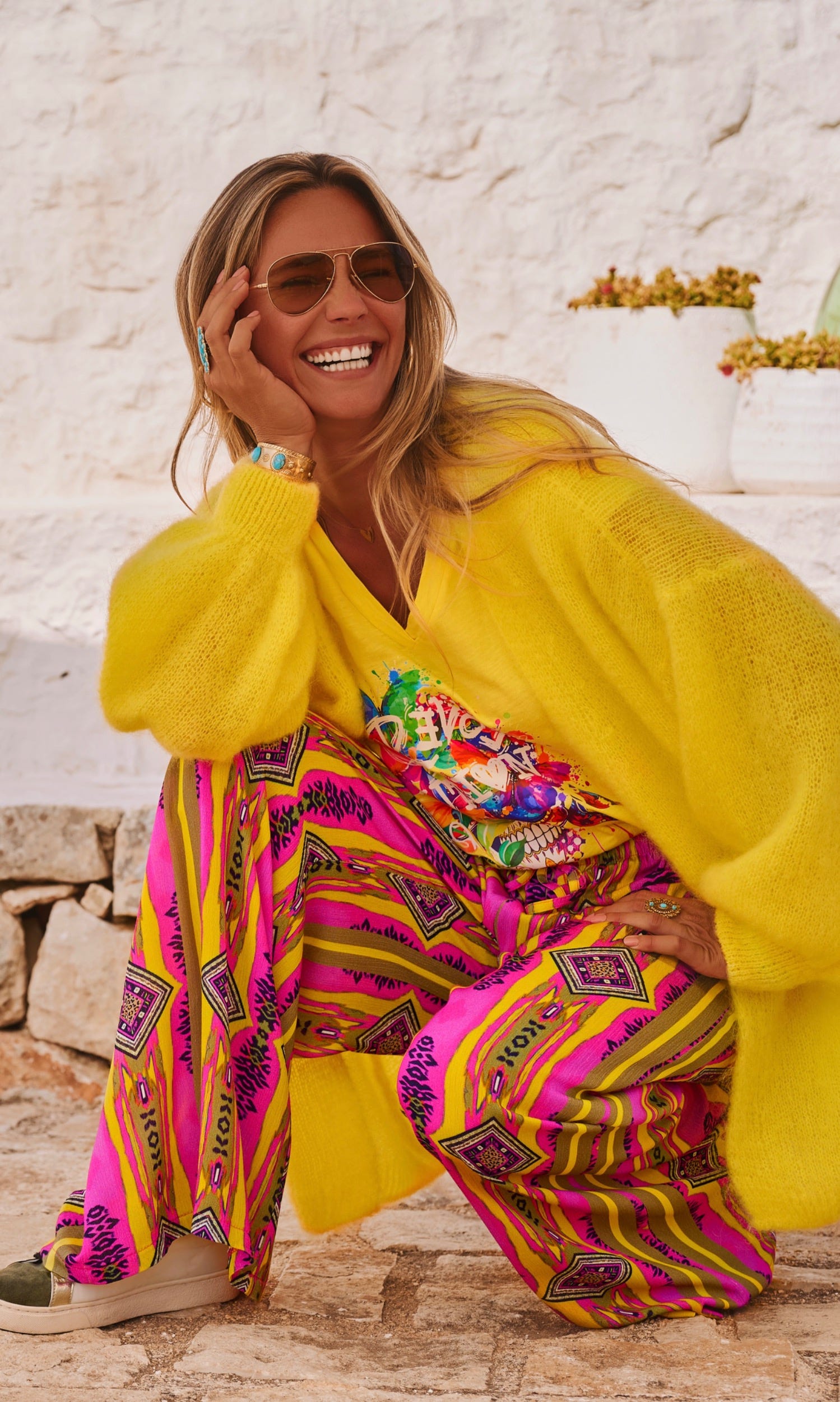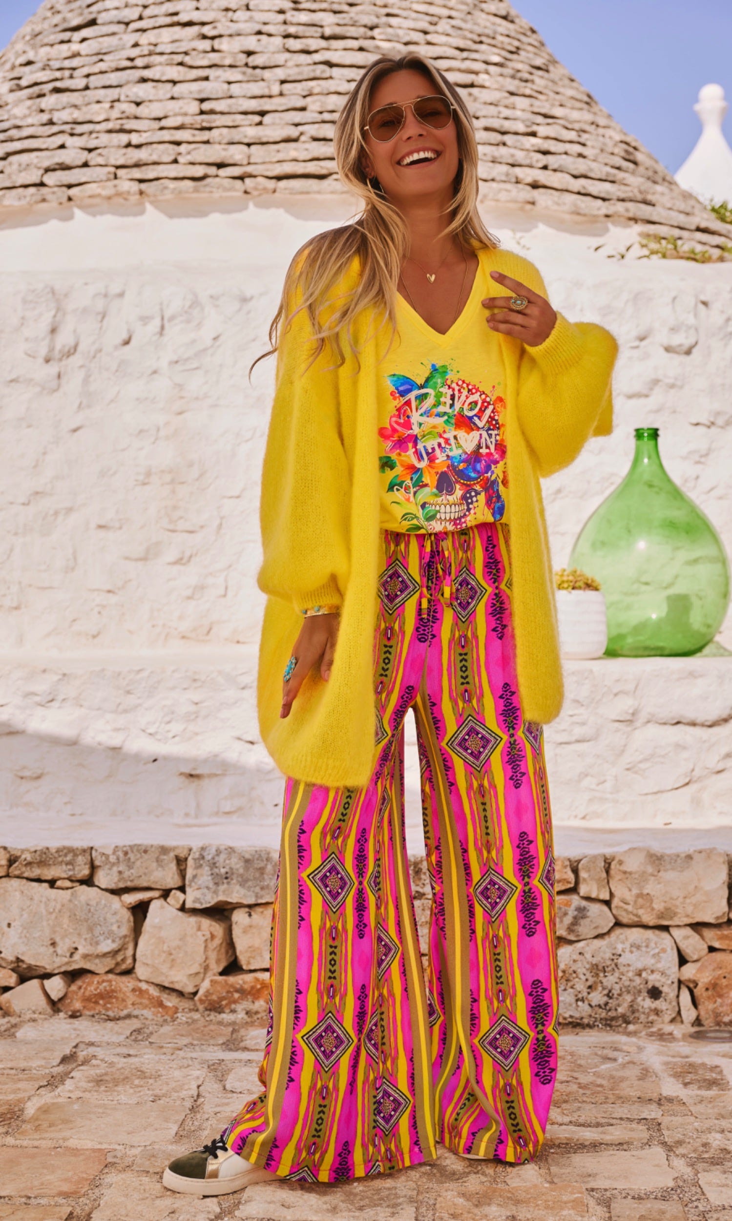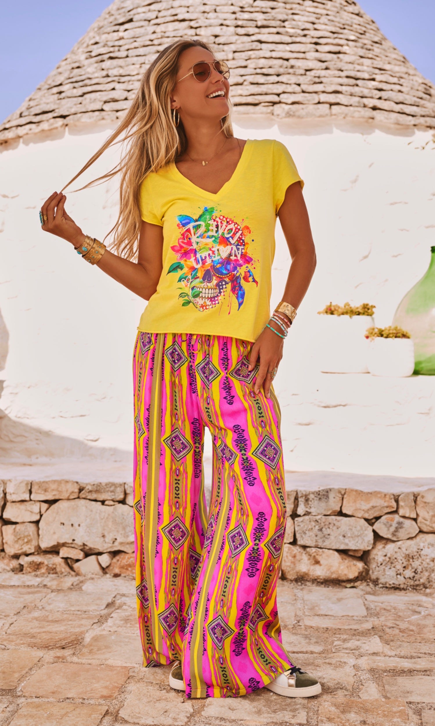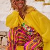 Il se distingue par sa taille élastiquée agrémentée d'un lien décoratif à nouer et un motif spirit qui habille l'ensemble.