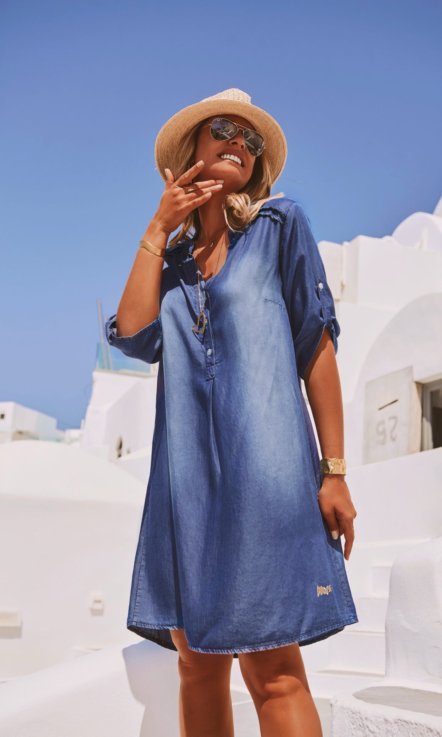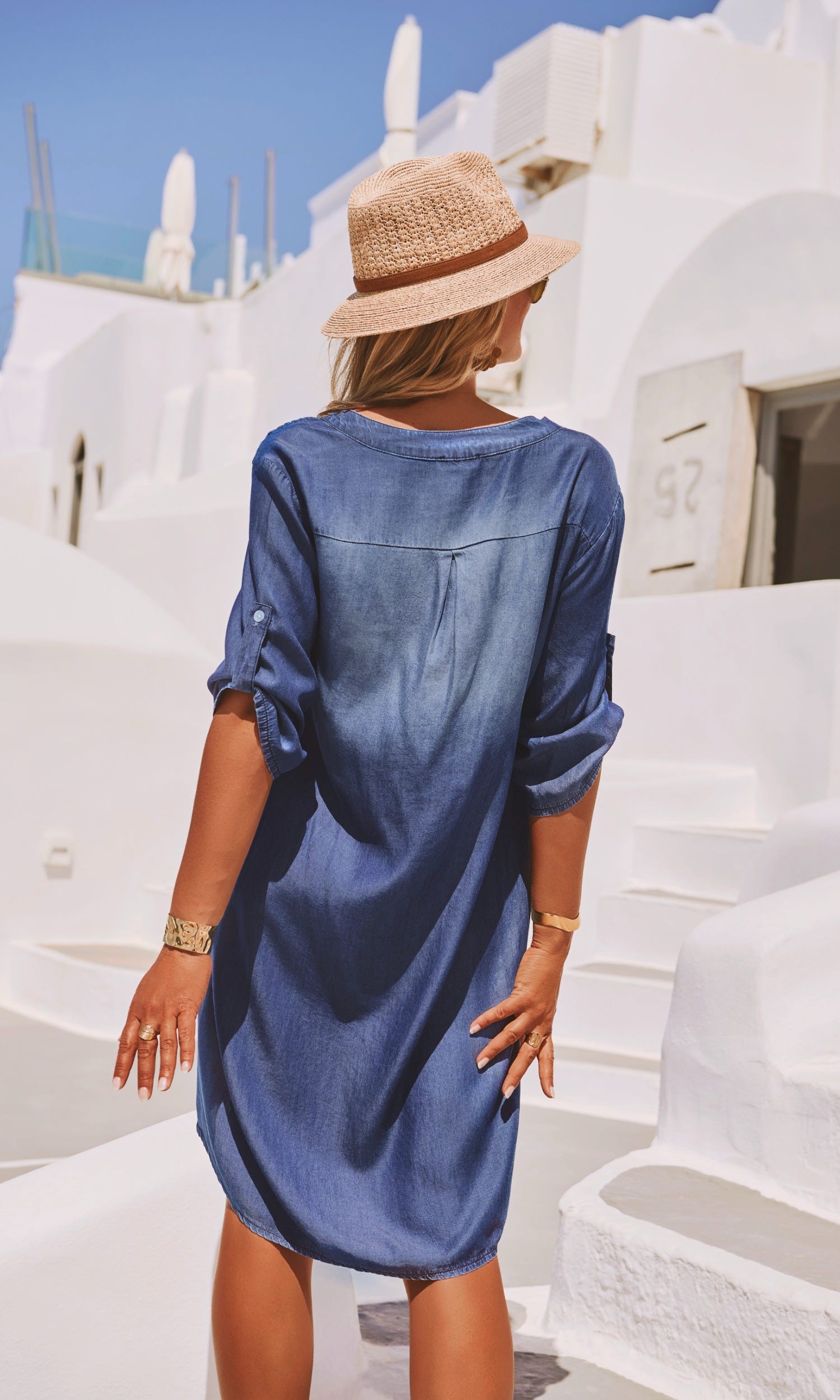 Découvrez cette petite robe coupe droite, élégante avec son col tunisien en V orné de 3 boutons.
