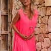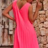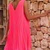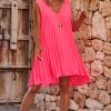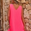 Découvrez cette petite robe rose fluo en voile, plissée sur l'ensemble, avec un col V devant et dos, et un lien fixe.
