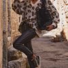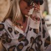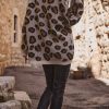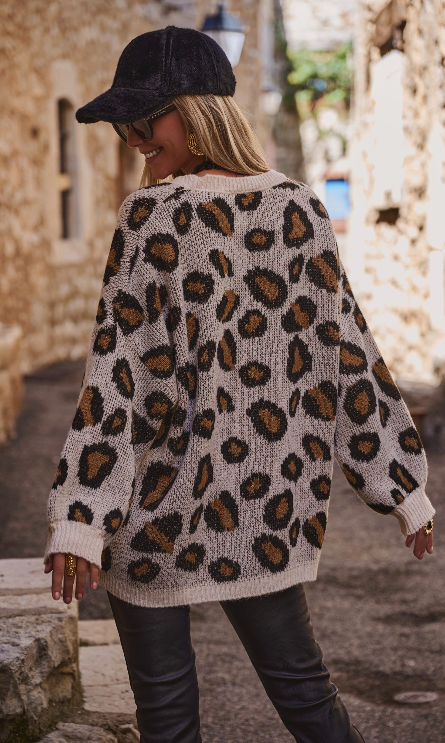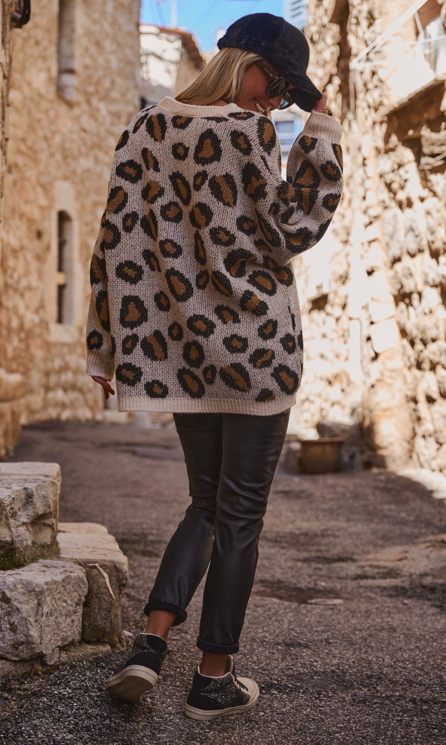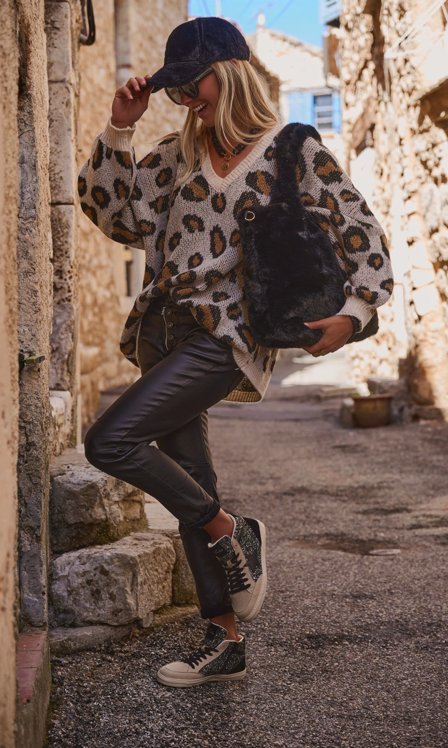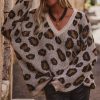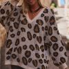 Adoptez le style moderne avec ce pull camel tendance au col V, orné d'un motif léopard audacieux.
