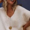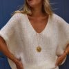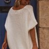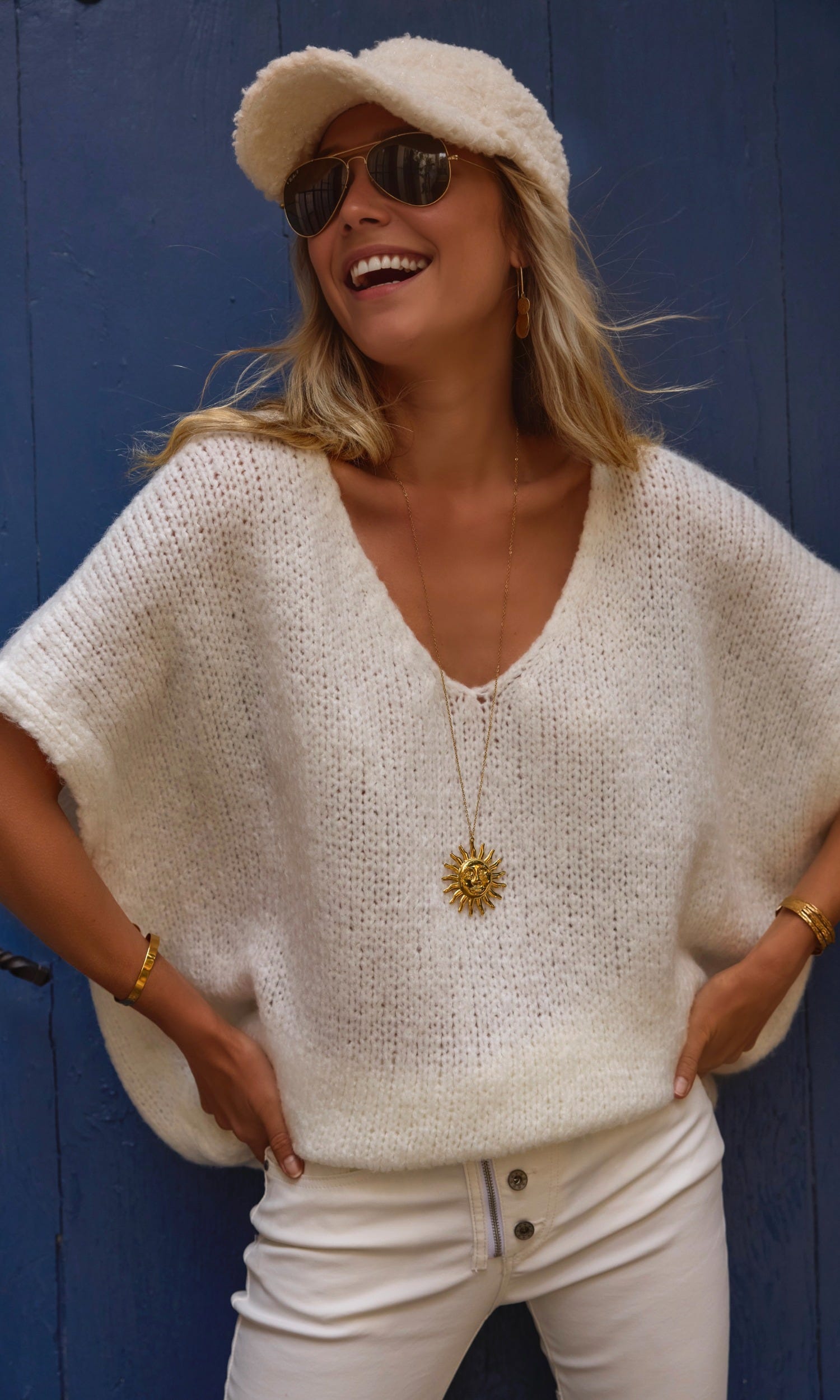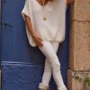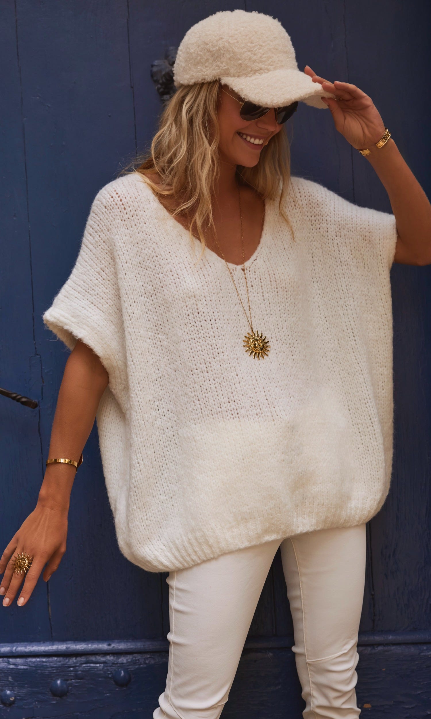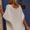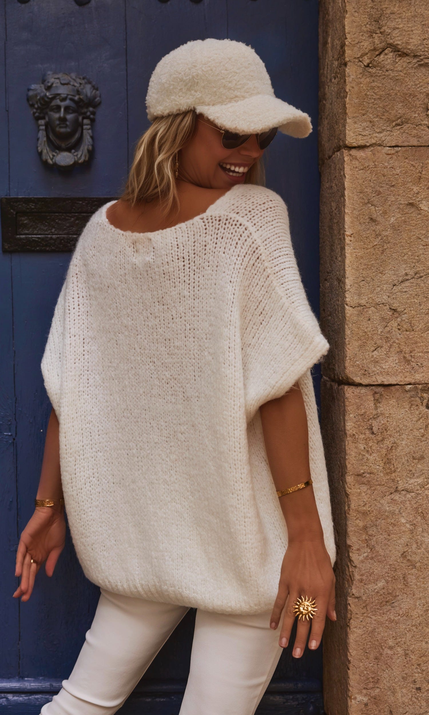 Découvrez notre pull blanc cassé tout doux à la coupe oversize, doté d'un col rond et de manches courtes sans emmanchure.