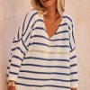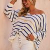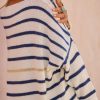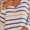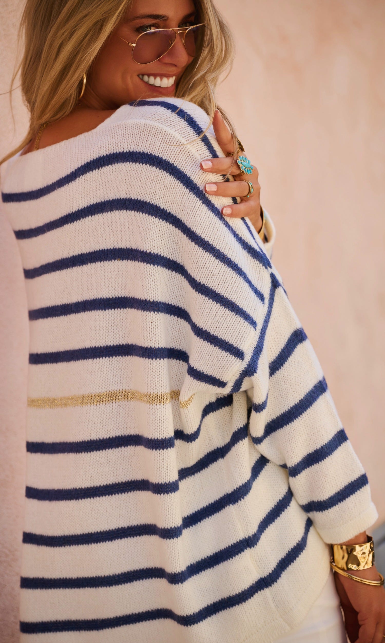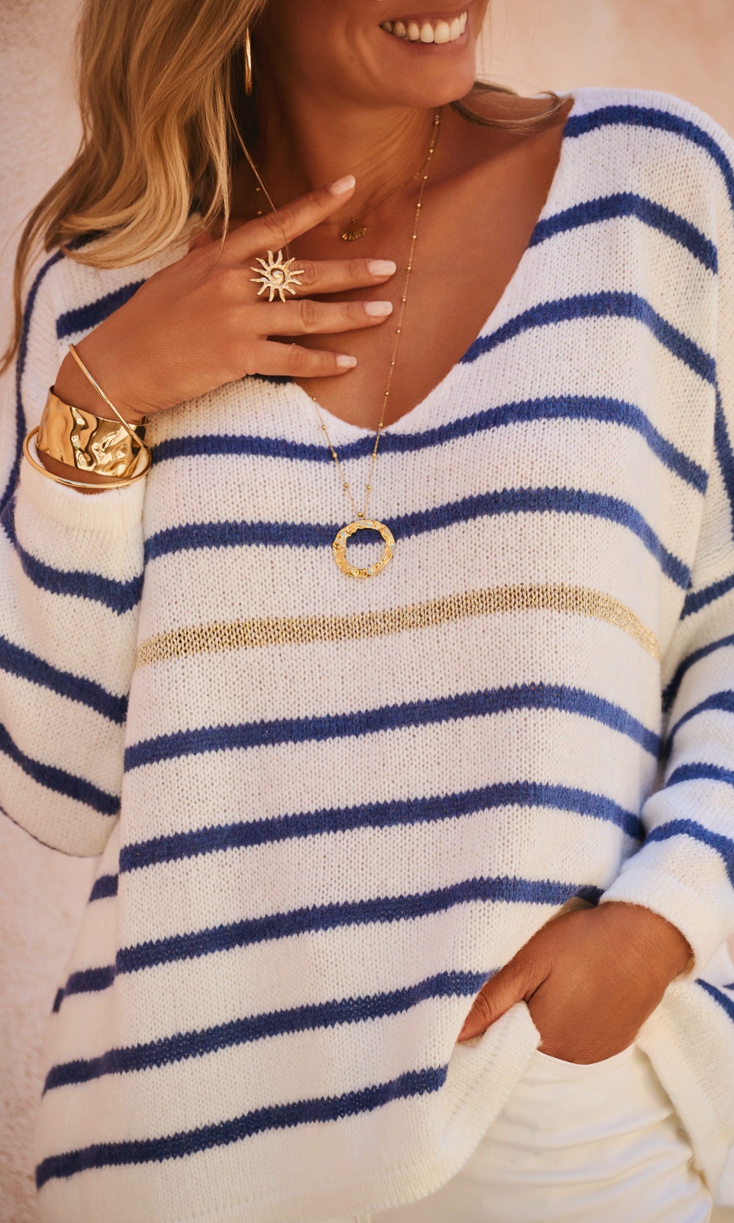 Sa marinière bleu marine arbore une rayure dorée au centre, créant un contraste chic.